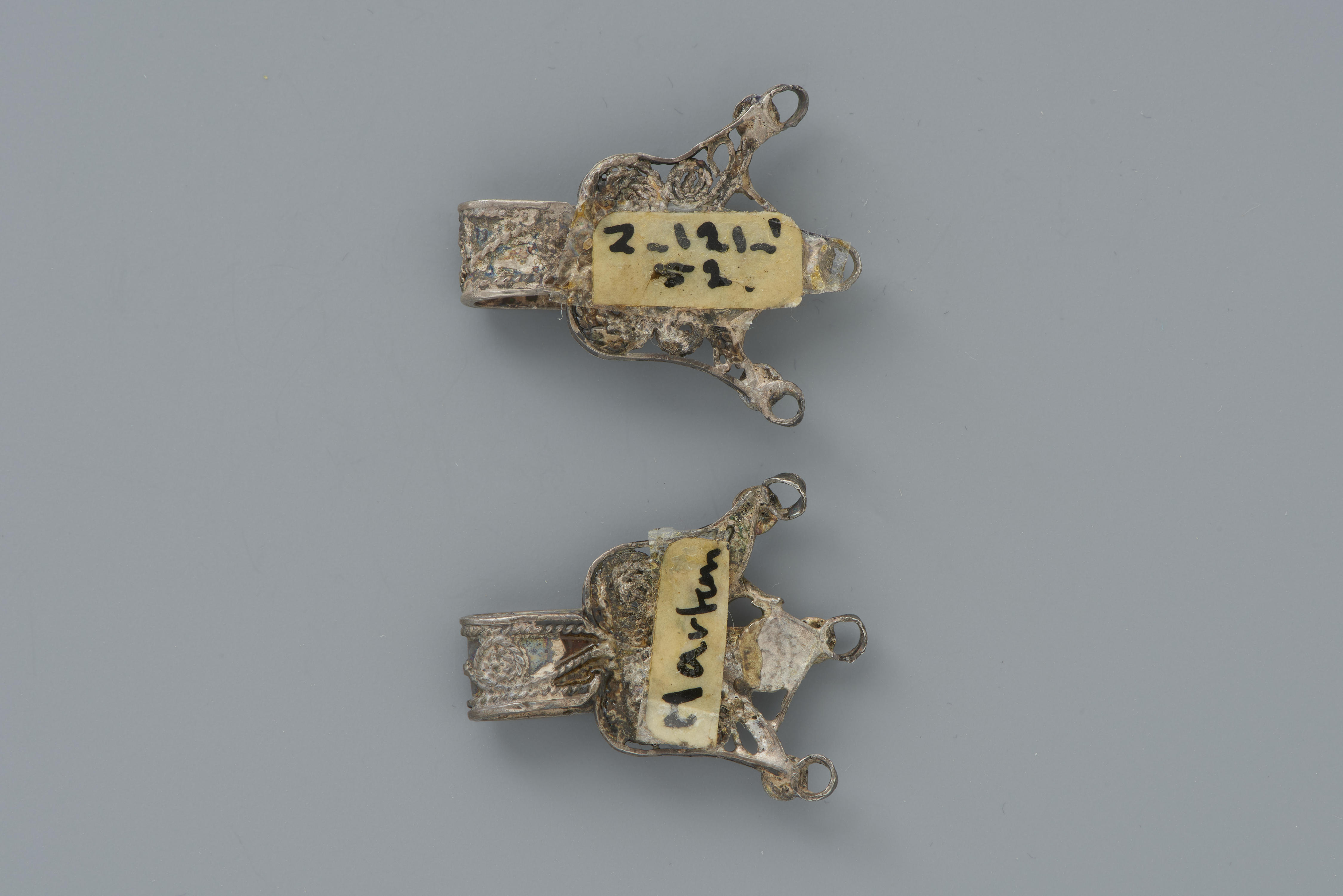 Twee zilveren tulpvormige keelbandhaken, waarmee de keelband aan de muts werd bevestigd.