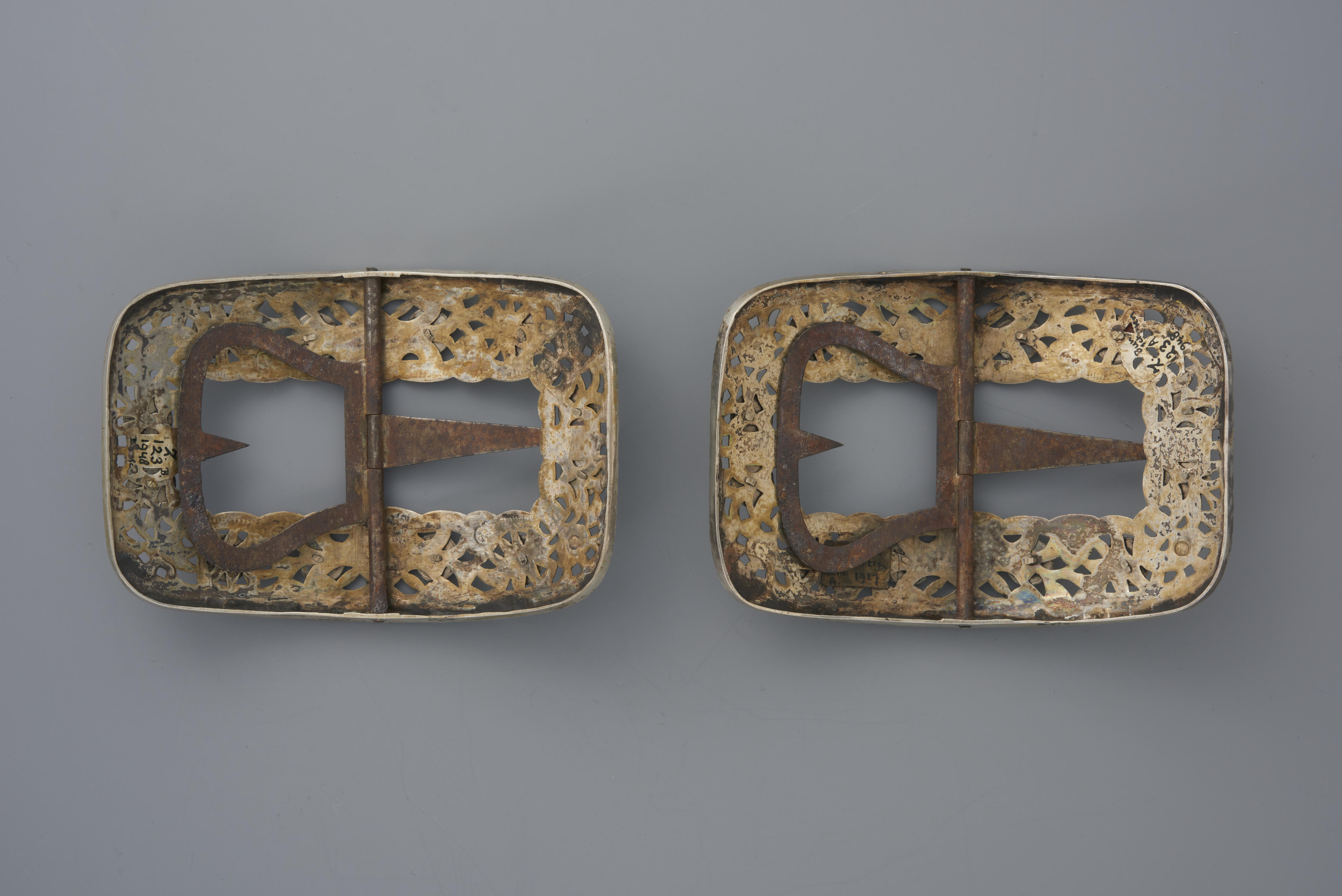 Paar schoengespen met een bloemenmandmotief, gecombineerd met zogenoemde stuivertjes. Bij deze gespen zijn er losse plaatjes opgezet.