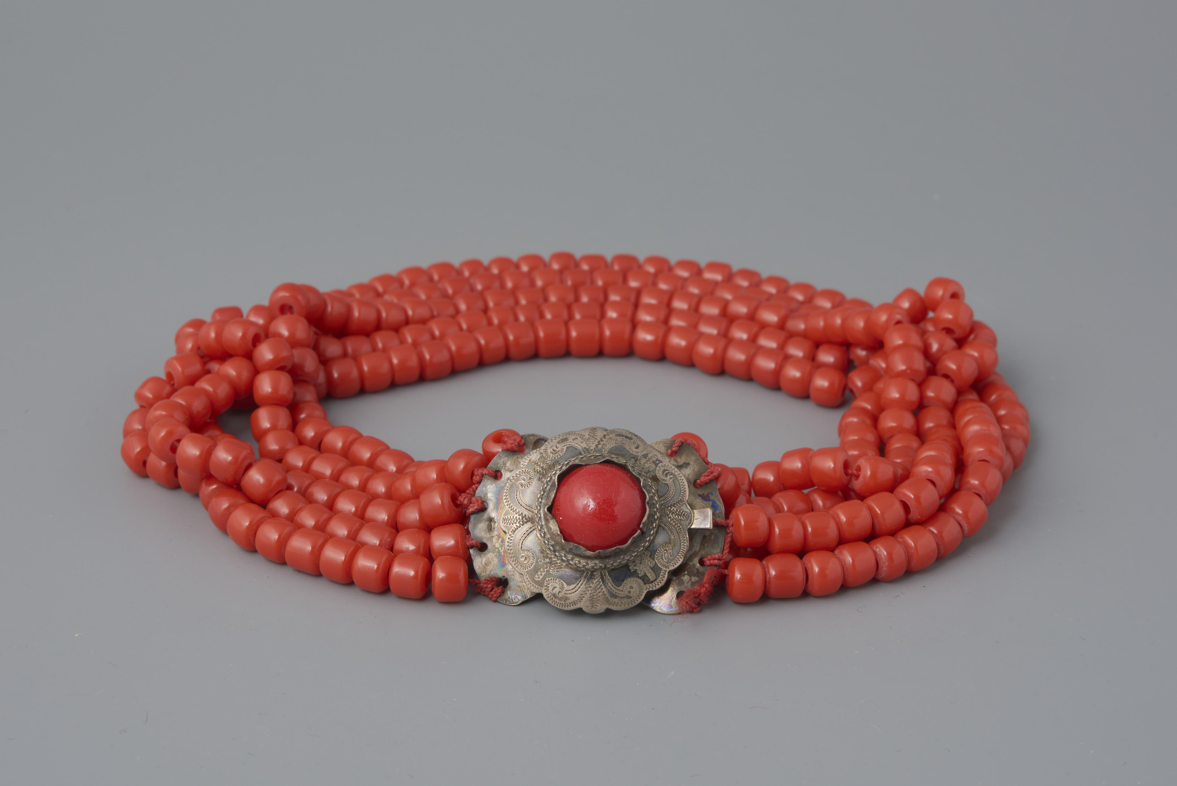 Halssnoer, bestaande uit een zilveren slot met vijf strengen plastic kralen. Het slot is verworven zonder kralen. De kralen zijn later in het museum toegevoegd. Het slot is gedragen door een vrouw van de Noord-Veluwe bij de opknapdracht of bij de daagse dracht. Het is tussen 1910 en 1921 vervaardigd door A. van Rijswijk in ...