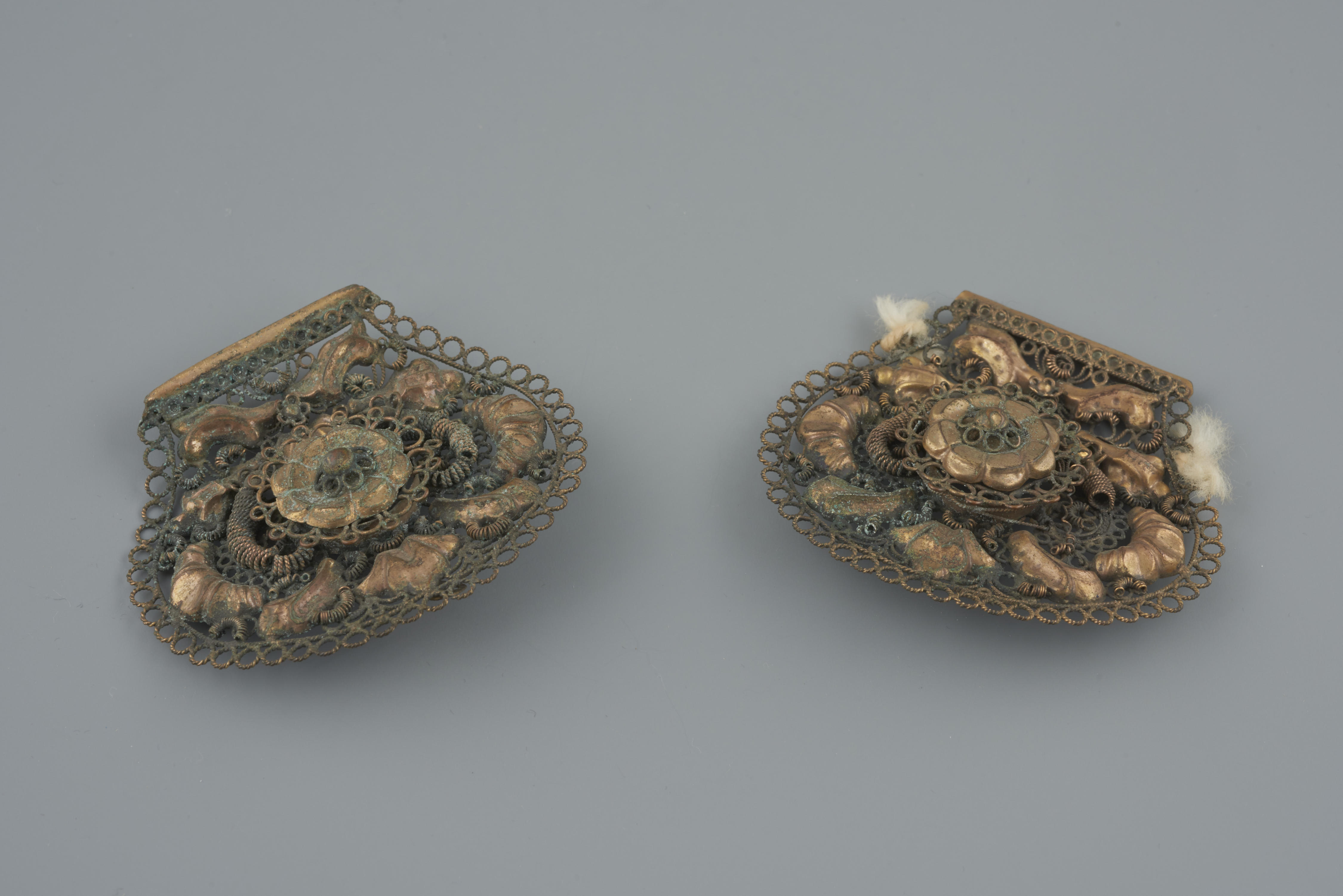 Een paar losse oorijzerstiften van verguld messing, afkomstig van een oorijzer uit Groningen.