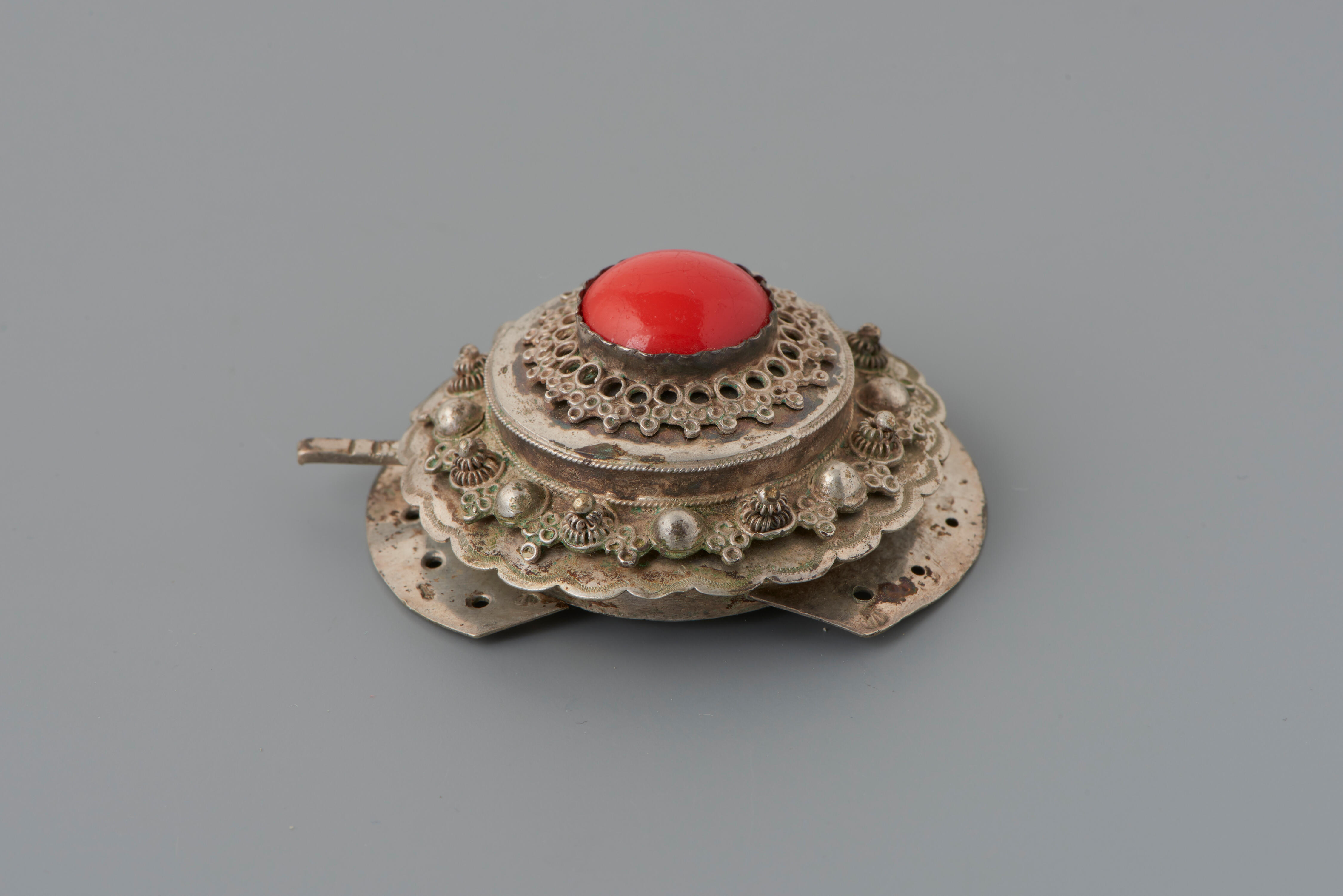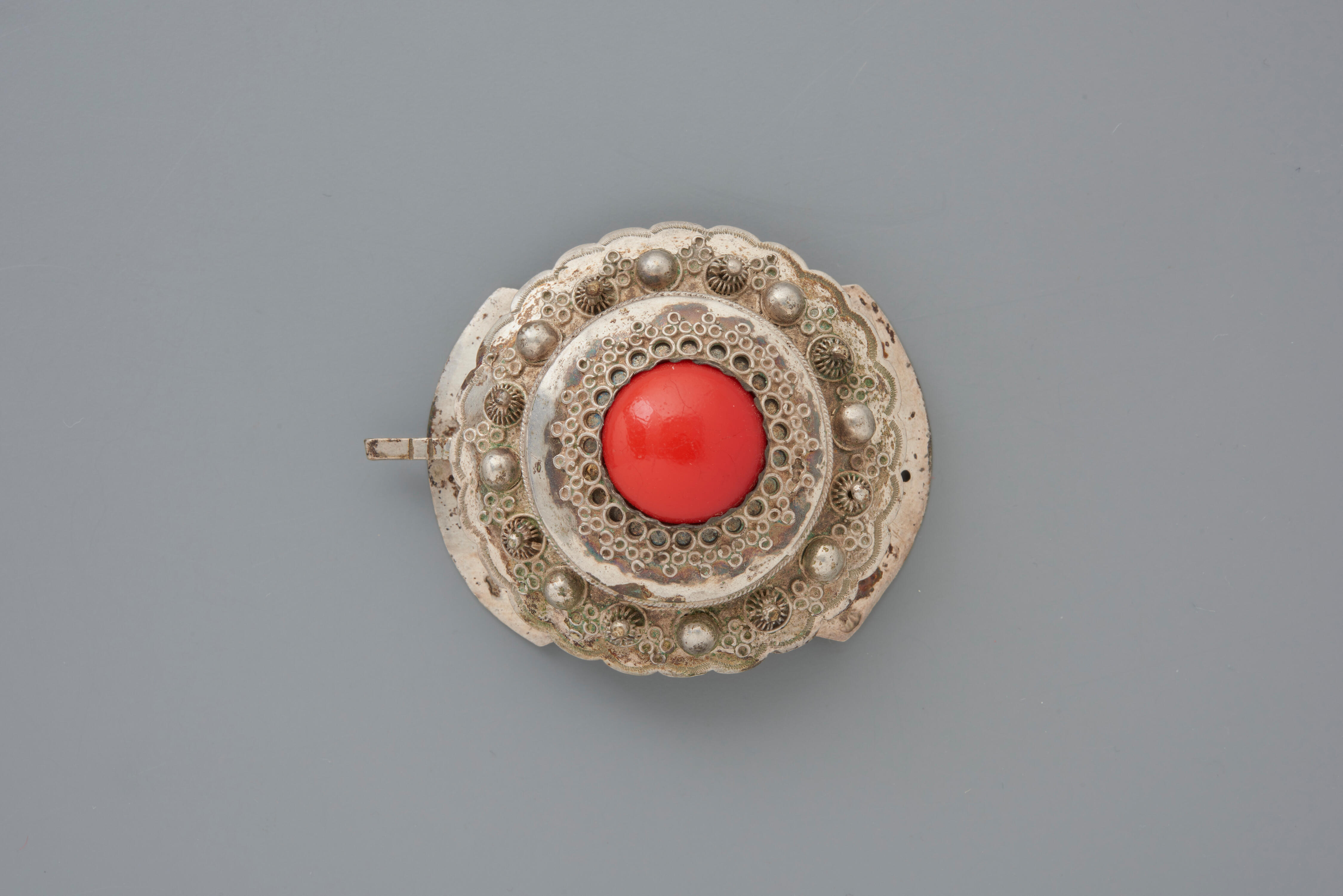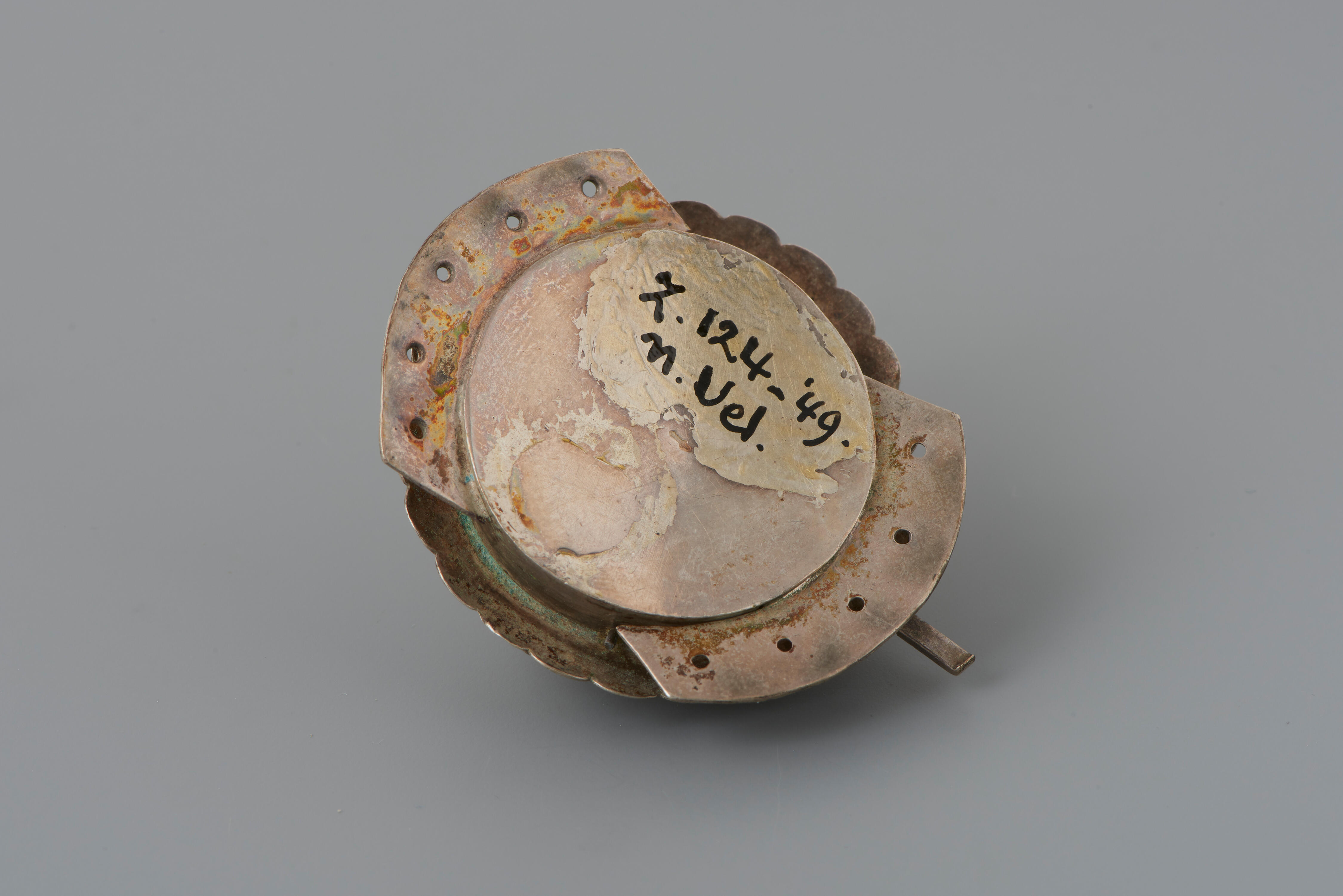 Een zilveren halssnoerslot, gebruikt door een vrouw of meisje in streekdracht van de Noordwest-Veluwe. Aan beide zijden heeft het slot vijf gaatjes, voor het aanzetten van vijf snoeren met kralen. De vervaardiger van het slot is onbekend, want het meesterteken is onduidelijk.