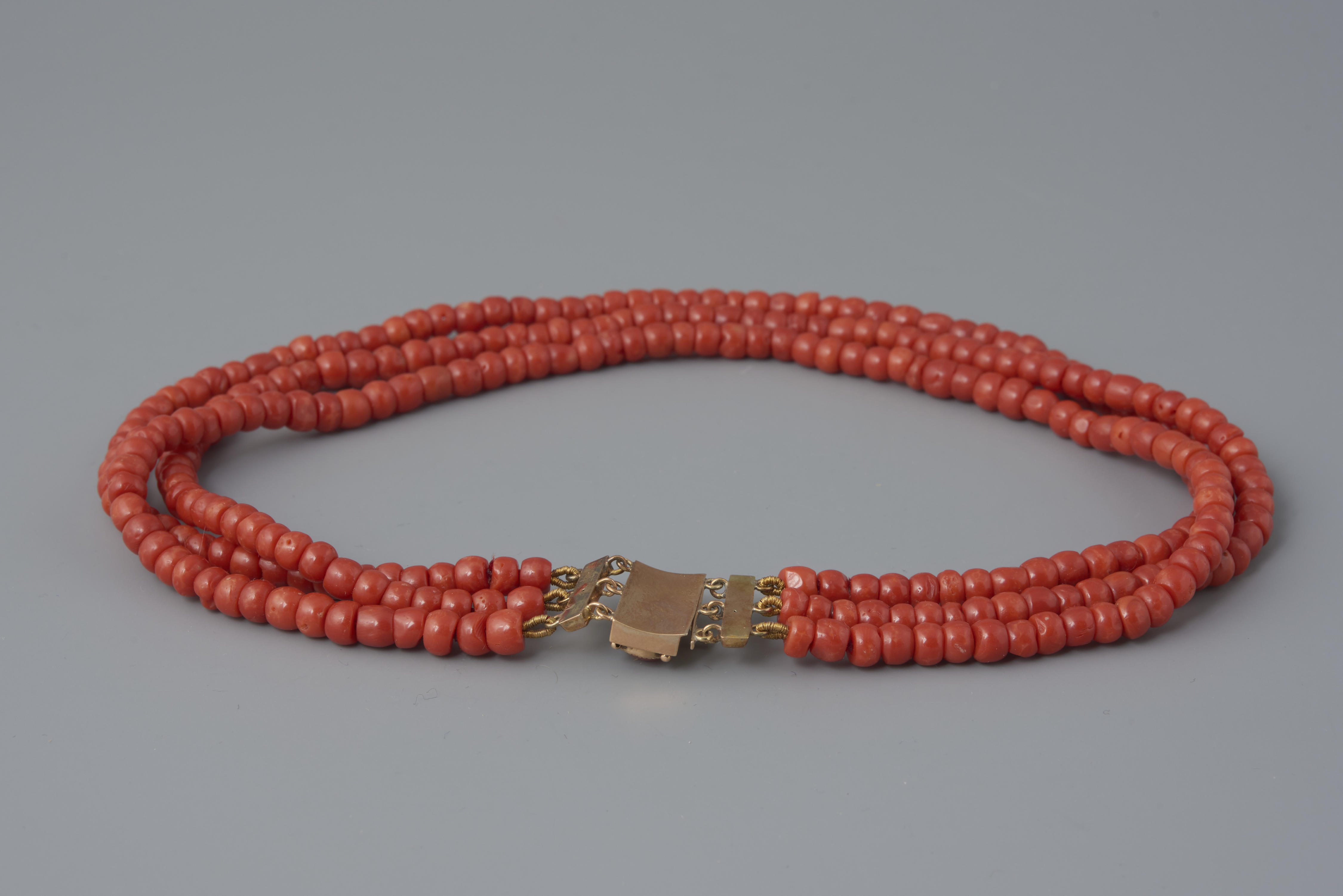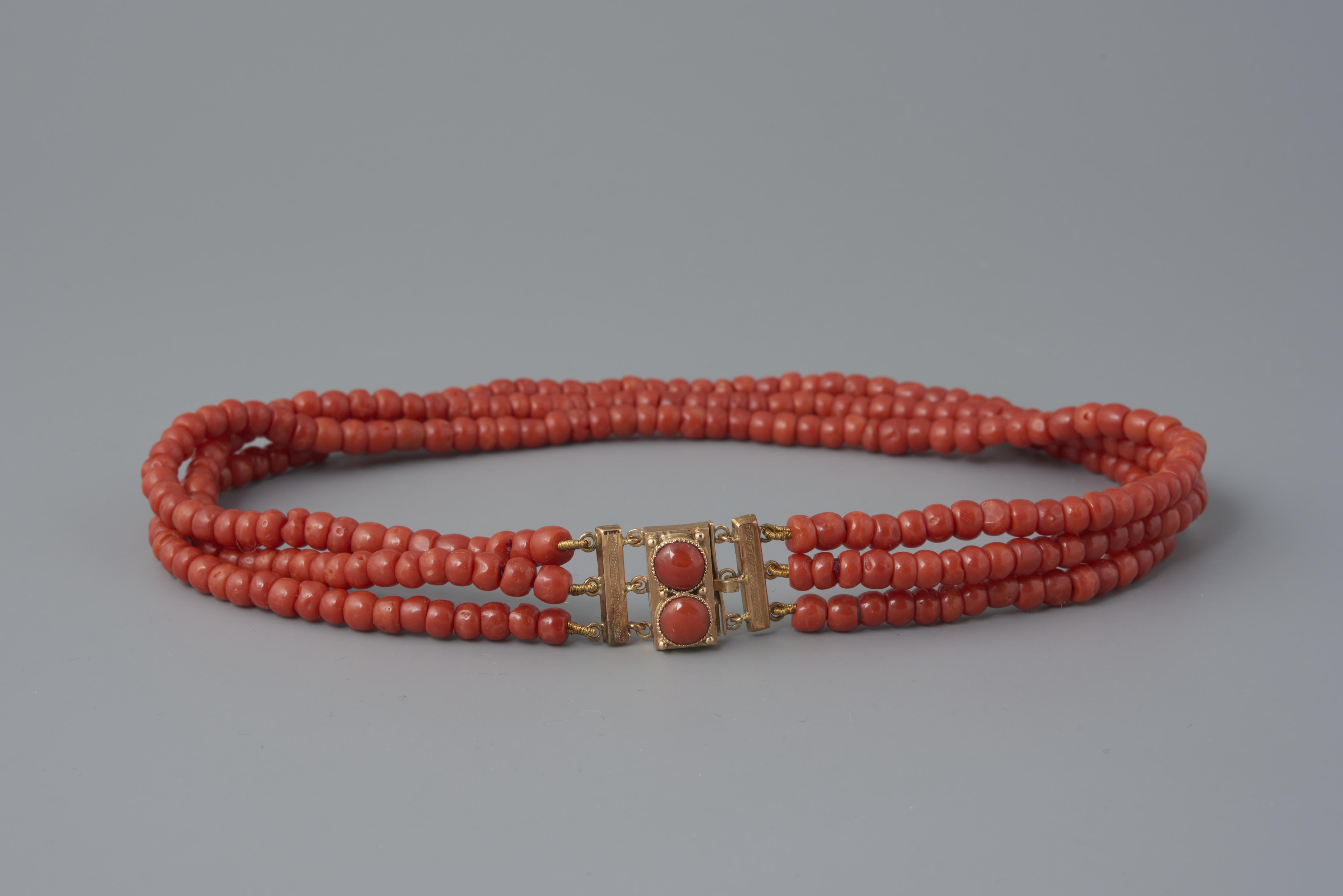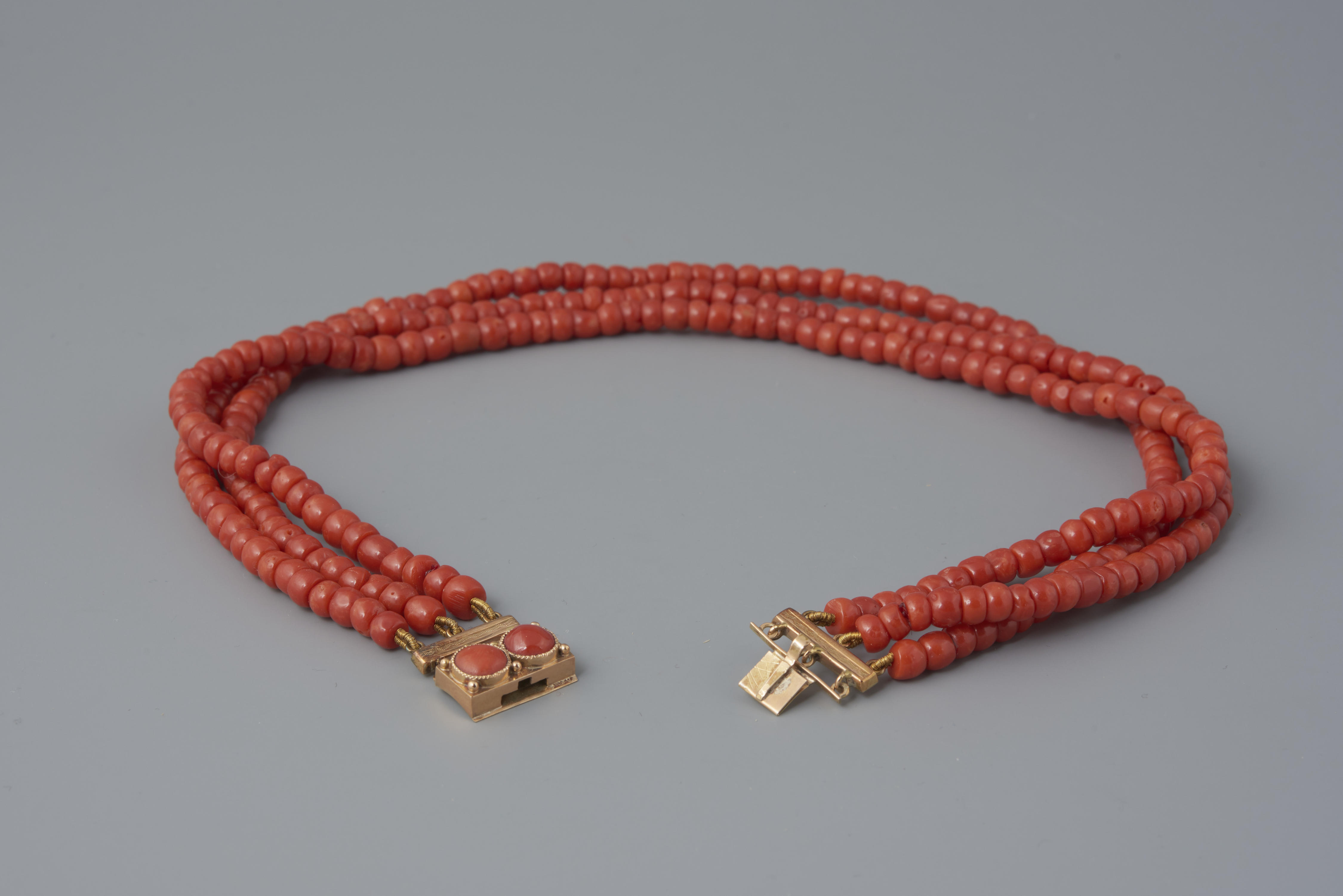 Halssnoer, bestaande uit een 14-karaats gouden slot met drie strengen kralen van bloedkoraal. Het slot is in 1949 verworven zonder kralen. In 1960 zijn drie strengen nieuwe kralen aangeschaft en aan het slot gezet. Het slot is gedragen door een vrouw uit Oldebroek, waarschijnlijk bij de opknapdracht. De vervaardiger is onbekend. Het heeft een gehaltemerk ...