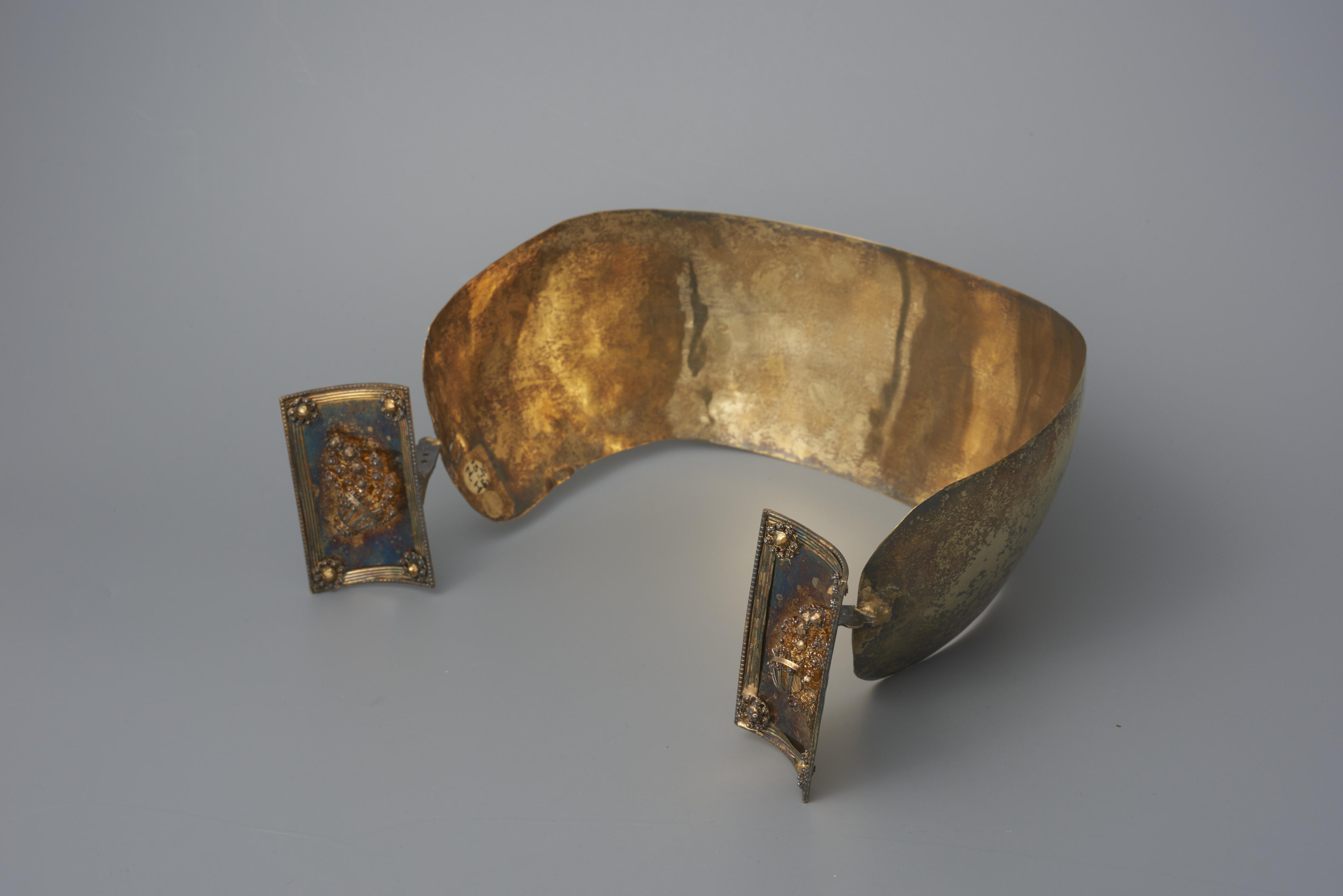 Een verguld zilveren oorijzer. Het oorijzer is in 1955 in opdracht van het Nederlands Openluchtmuseum verguld. Het oorspronkelijke zilveren oorijzer werd omstreeks 1855 gedragen door een vrouw in streekdracht uit de Zaanstreek. Het oorijzer bestaat uit een beugel en twee 'boeken’ (rechthoekige oorijzeruiteinden). In de verbindingsstaafjes tussen de boeken en de beugel zitten drie gaatjes. ...