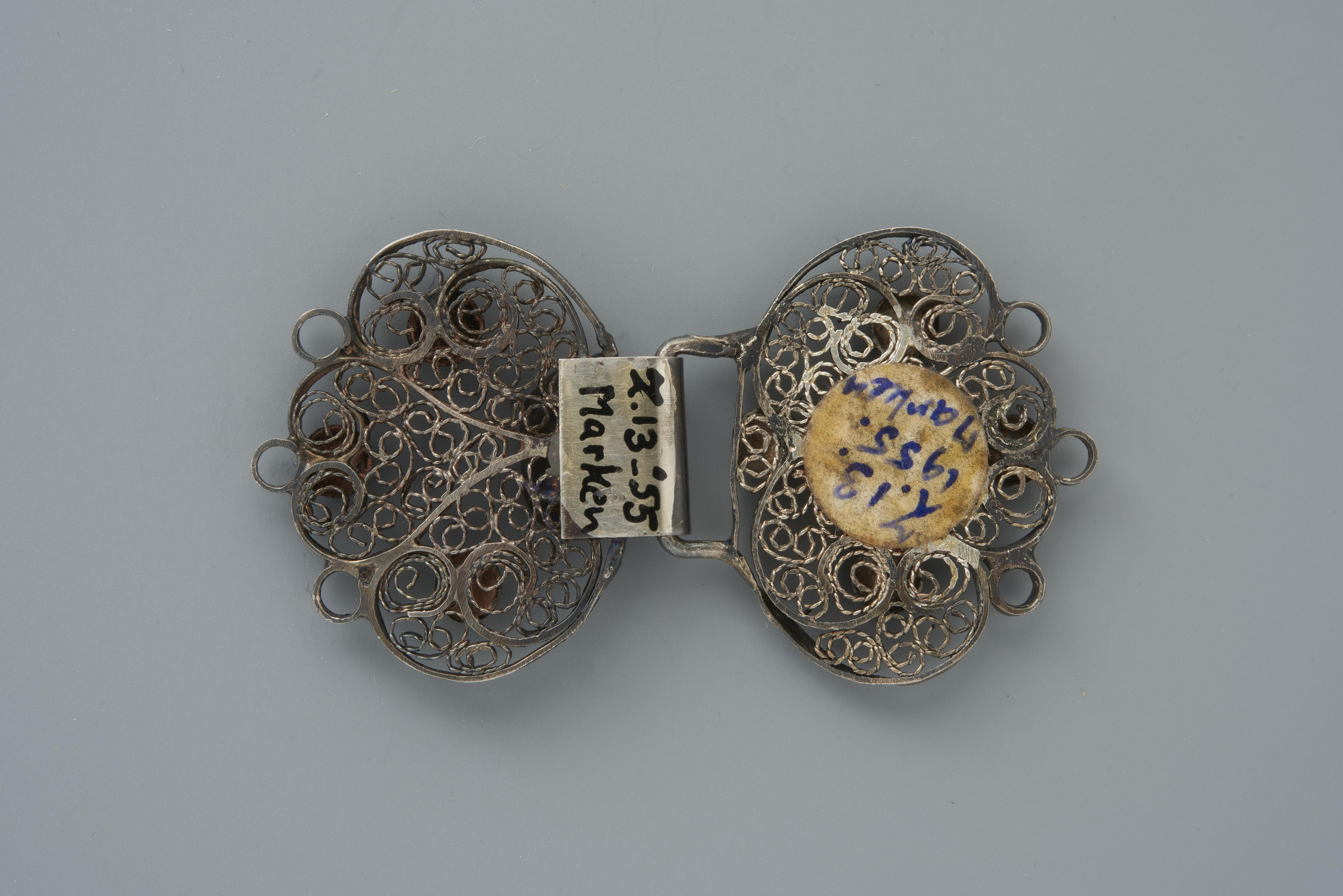 Haak en oog van eerste gehalte zilver, versierd met gladde noppen. De haak is in 1955 nieuw gemaakt naar een model uit circa 1860.