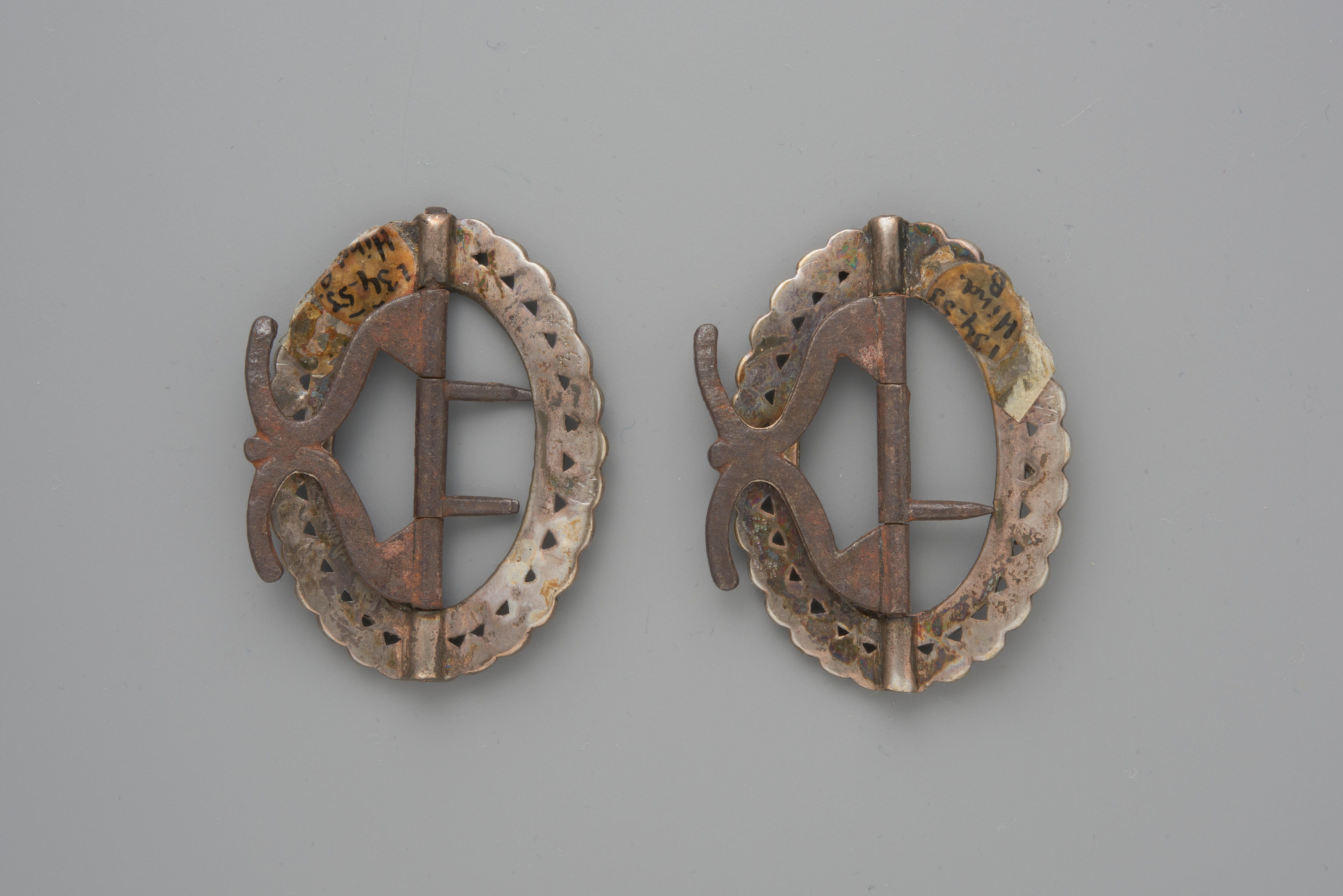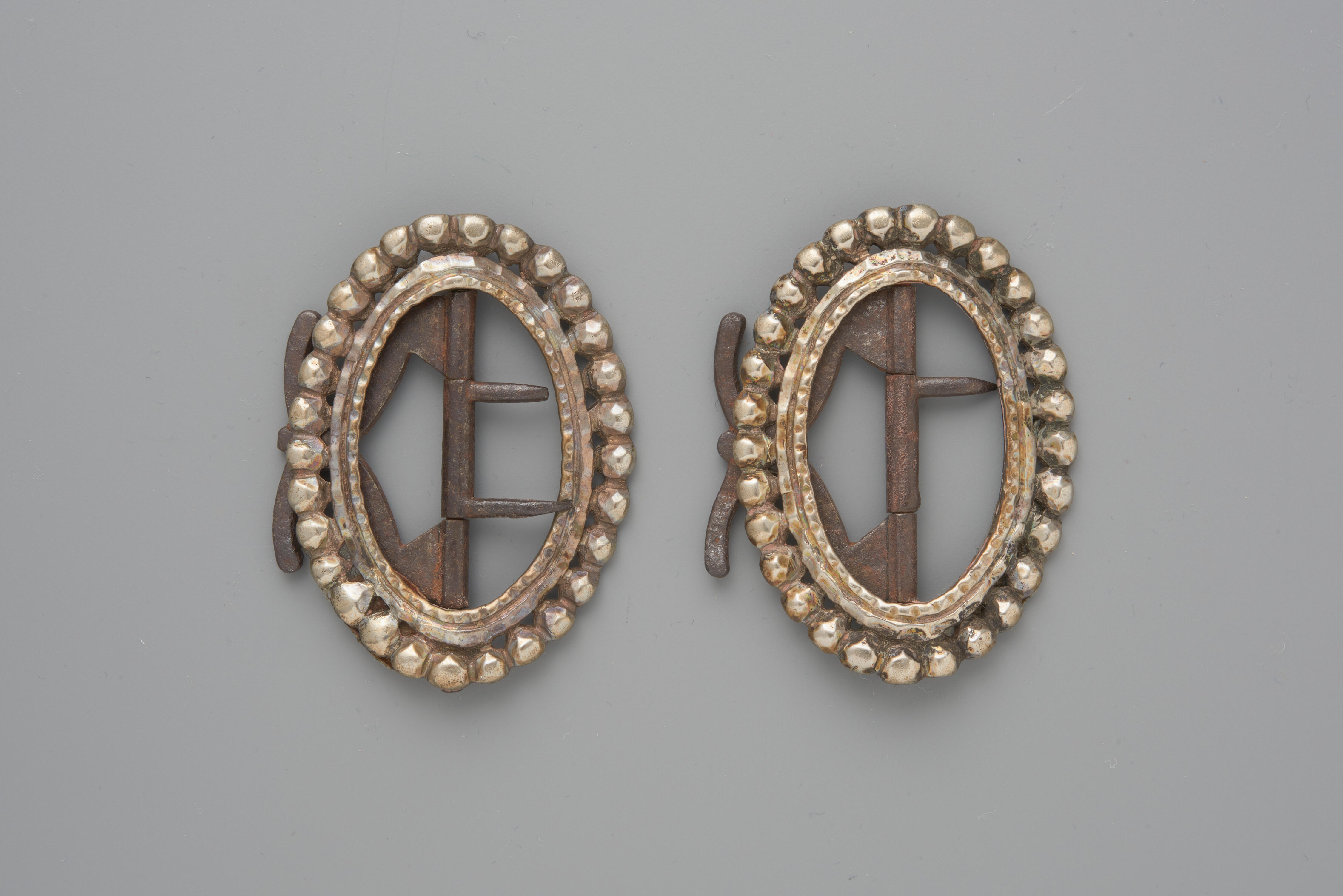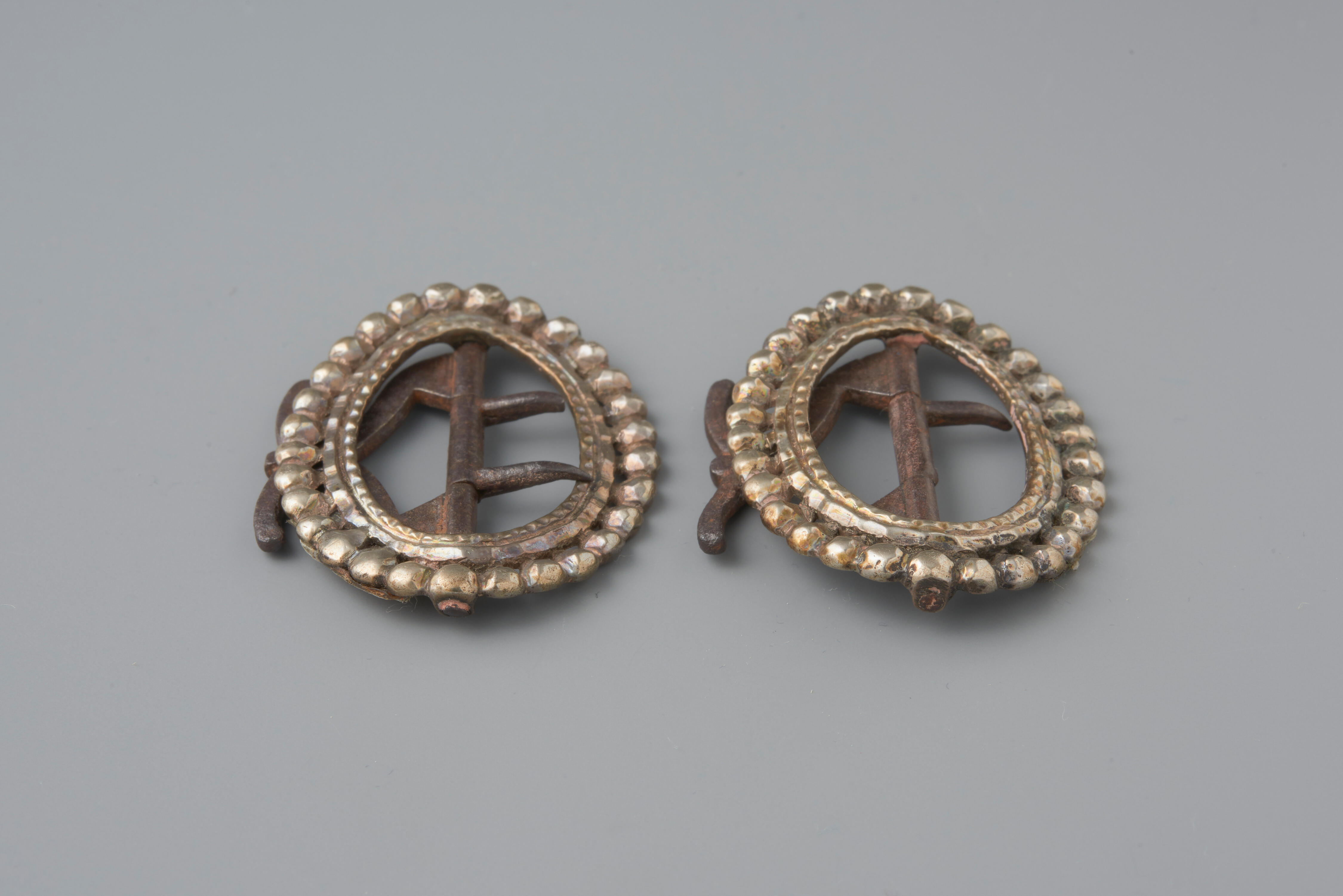 Een paar ovale zilveren kuit- of schoengespen met ijzeren binnenwerk. Kuitgespen werden gebruikt om de broekspijpen van de kuitbroek aan de onderzijde te sluiten. De gespen zijn afkomstig uit Hindeloopen. De vervaardiger is onbekend, want de merktekens zijn onduidelijk.