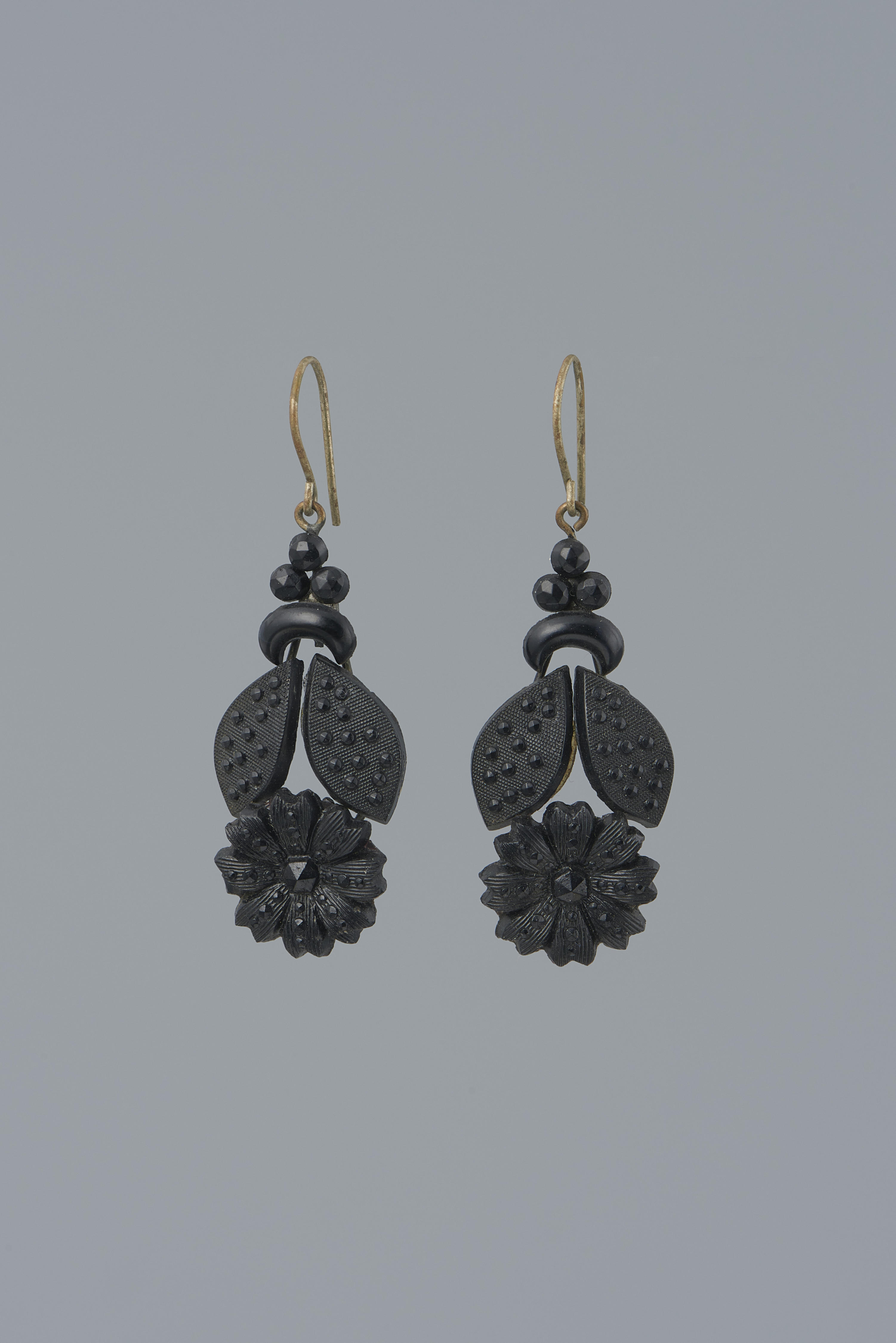 Paar mutsenbellen van zwart kunststof. De messing haakjes zijn verzilverd geweest. Deze mutsenbellen zijn gedragen door een vrouw van de Noord-Veluwe bij de rouwdracht. Ze werden in de voorstrook van de kornetmuts gehaakt. Dit type hanger is niet specifiek streekgebonden. Het kon zowel bij diverse streekdrachten als bij algemene modedracht gedragen worden. De vervaardiger en ...