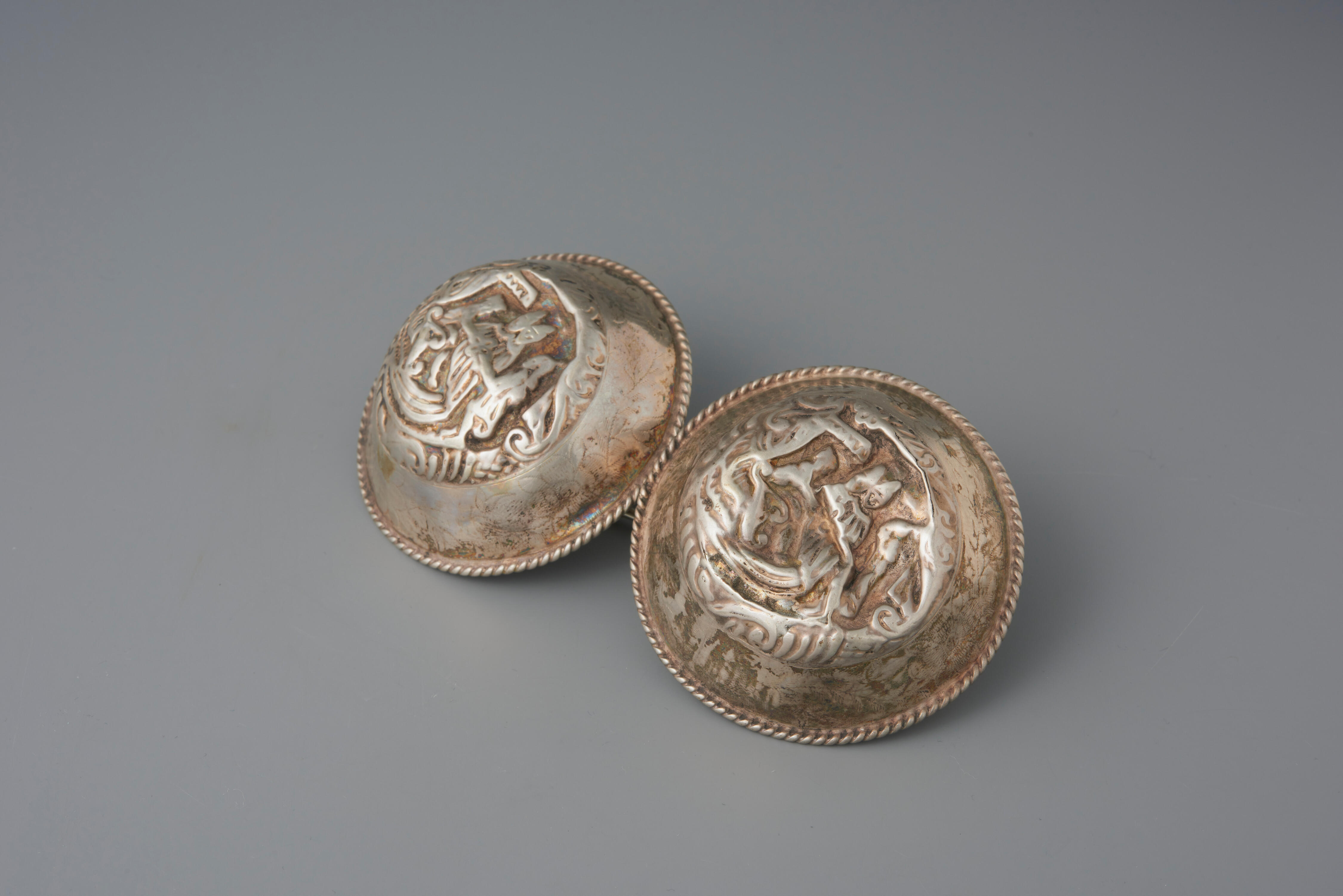 Een paar zilveren broekstukken, gedragen door een man of jongen in streekdracht als sluiting van de broeksboord. Dergelijke broekstukken werden gedragen door mannen en jongens op Urk en Zuid-Beveland. De voorstelling wordt op verschillende manieren geïnterpreteerd: Judas ontvangt de dertig zilverlingen van het Sanhedrin (Mattheus 26: 15-16), Salomo's oordeel (1 Koningen 3:16-28), Jozef voor de ...