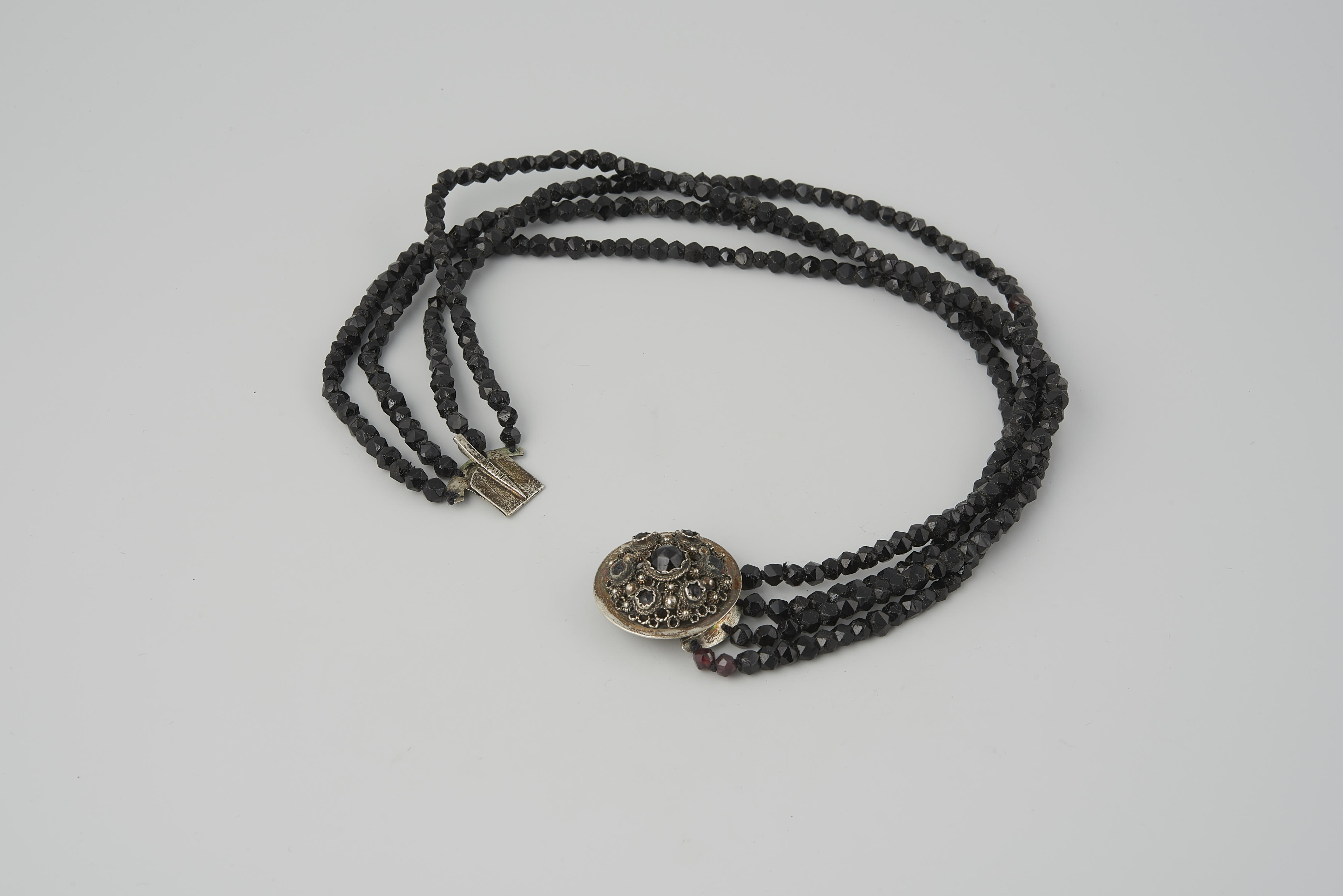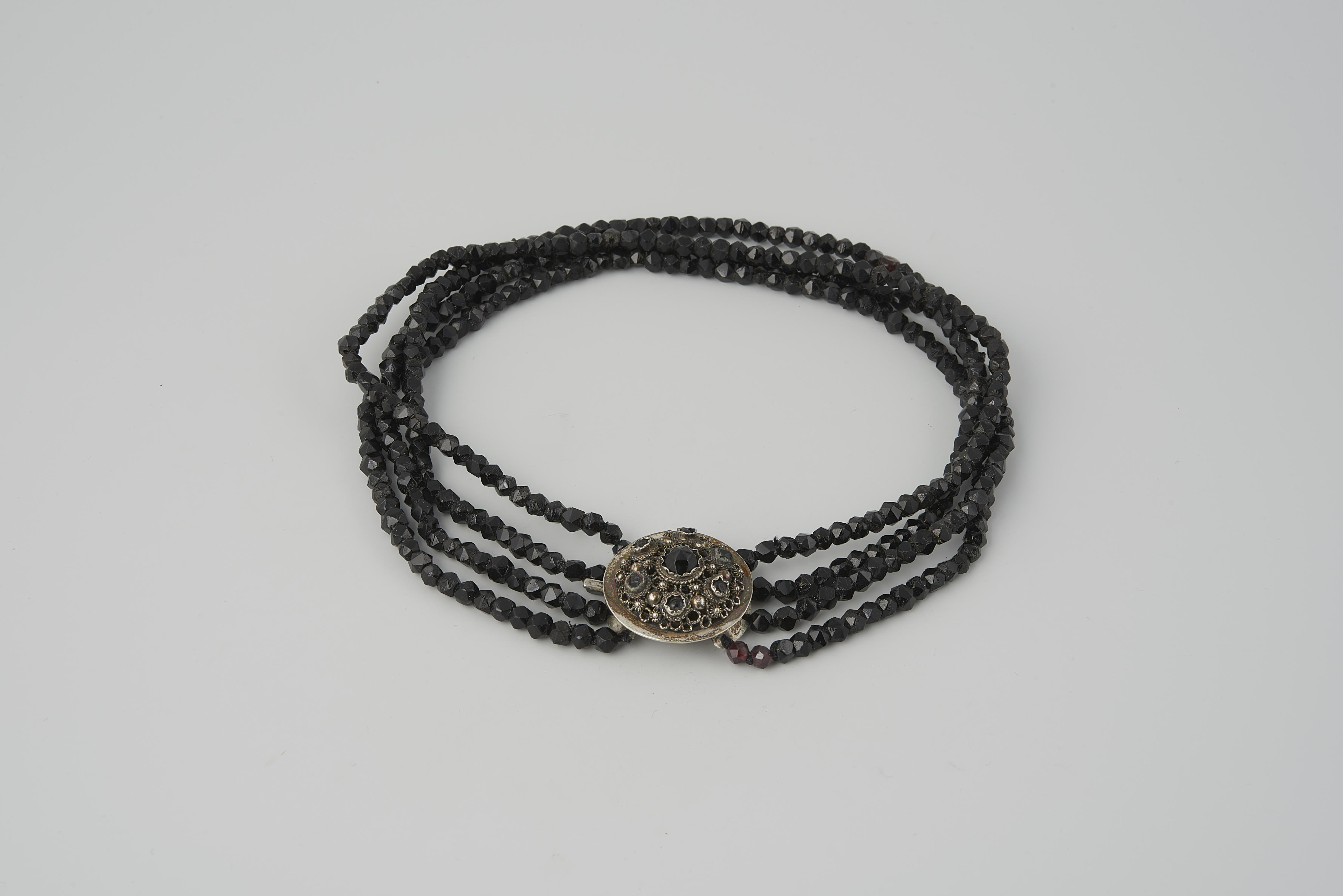 Halssnoer, bestaande uit vier strengen zwarte glazen kralen aan een zilveren slot met stenen van git. Het halssnoer is gedragen door een vrouw van het Kampereiland bij de rouwdracht. De vervaardiger is onbekend.