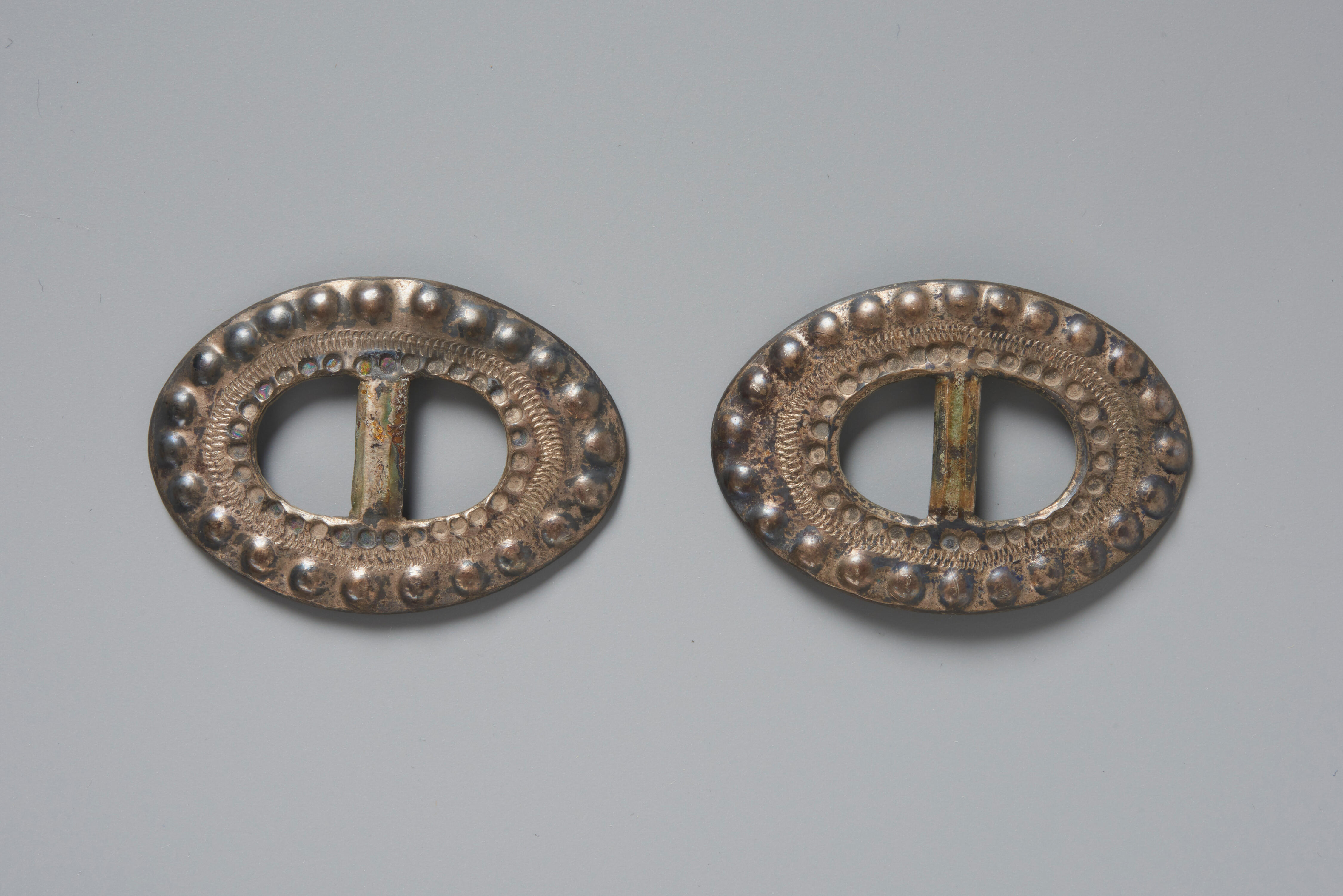 Een paar ovale zilveren schoengespen, gebruikt door een meisje of vrouw in streekdracht uit Staphorst of Rouveen. De gespen zijn uit een zilverplaat geknipt en vervolgens met ponsen bewerkt. In Staphorst en Rouveen worden dit soort kleine schoengespen 'strikjes' genoemd. De gespen hebben geen meesterteken, maar zijn toegeschreven aan de Staphorster smid Berend Brand.