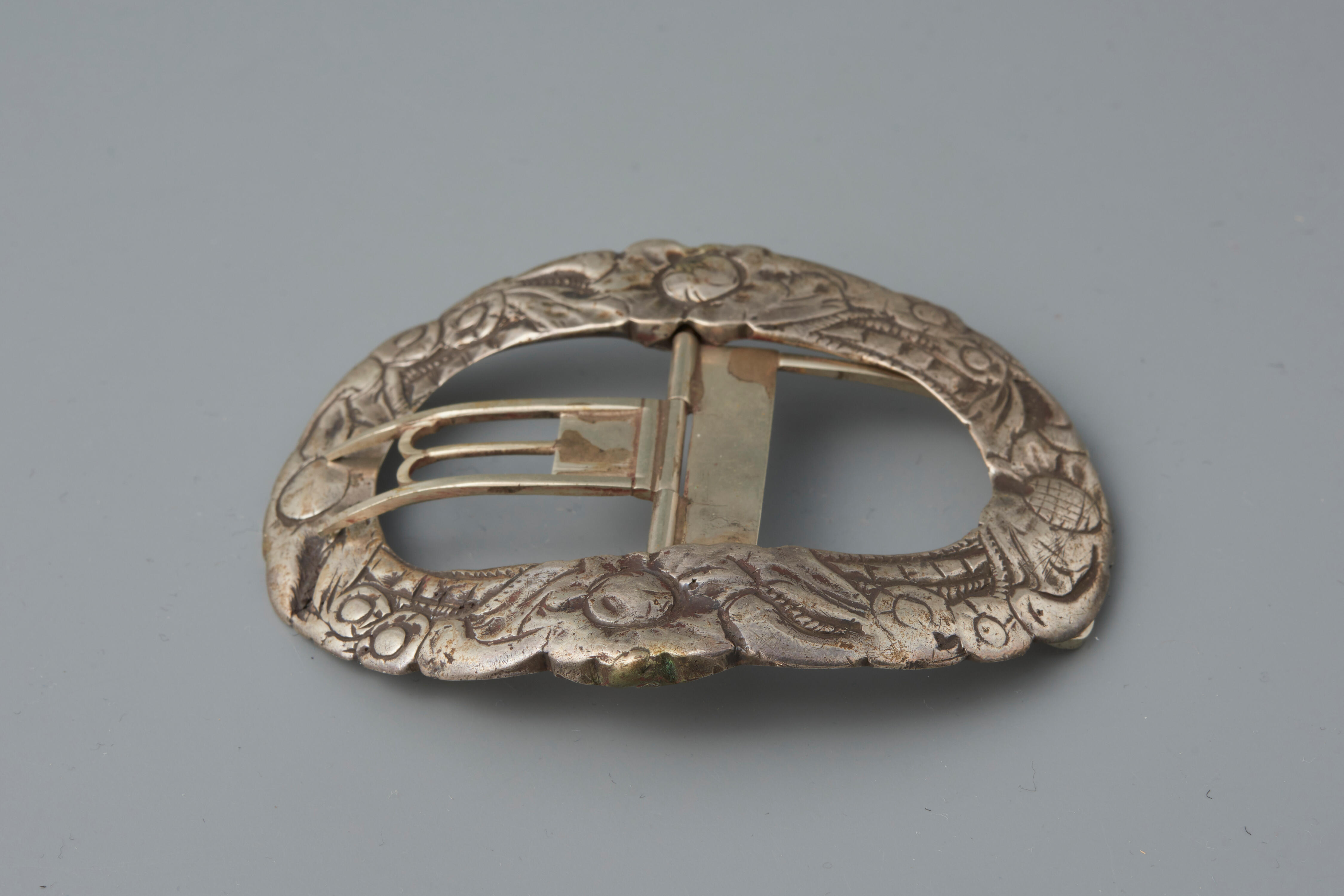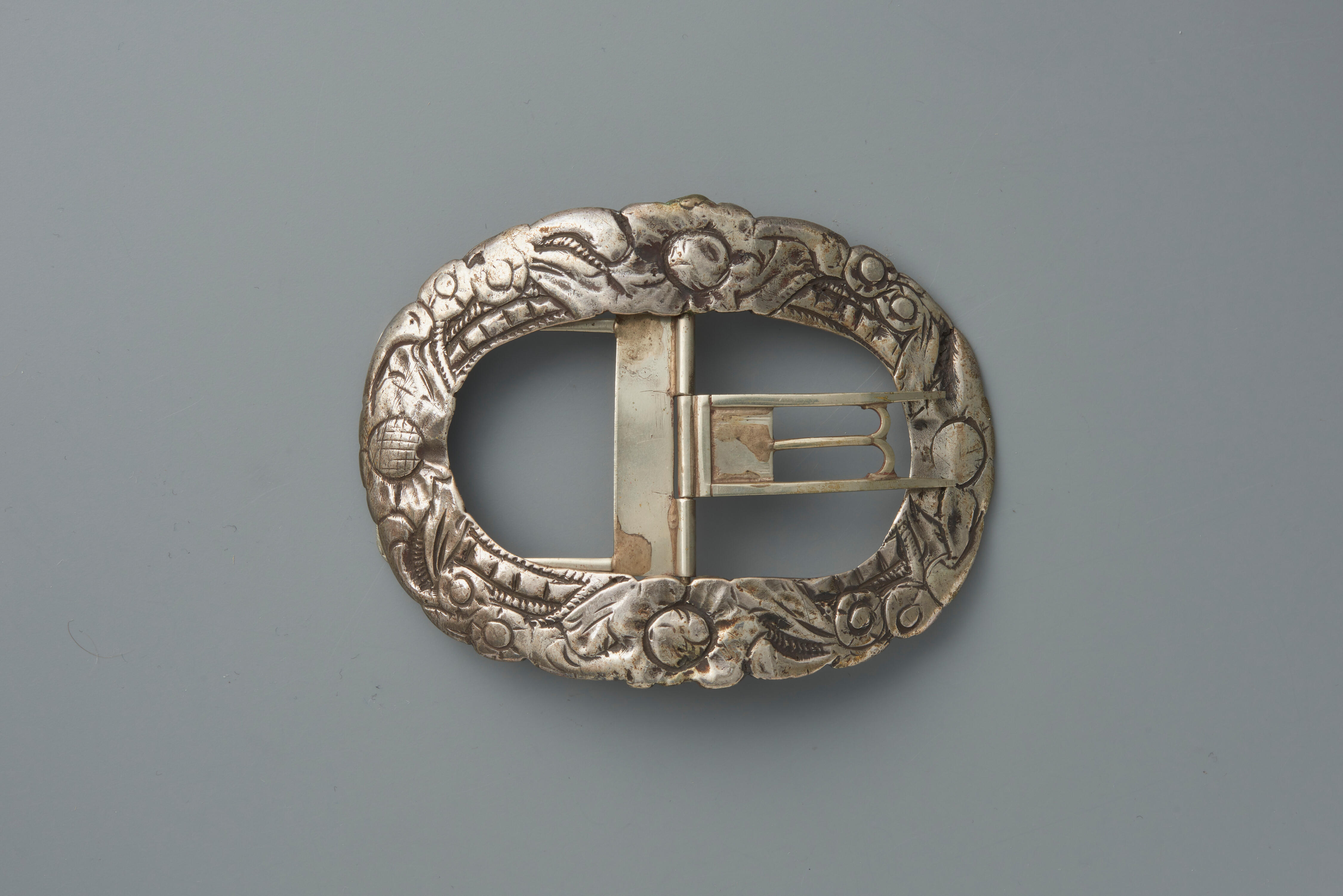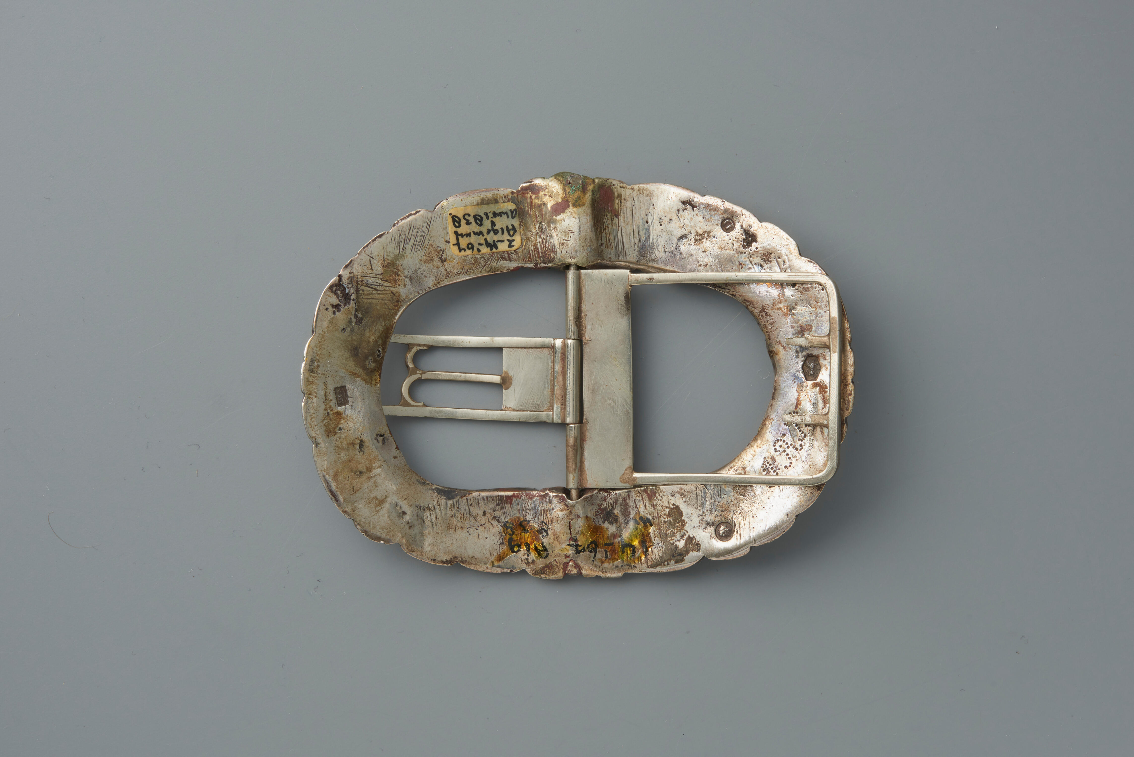 Een ovale zilveren schoengesp. De gesp is in 1838 vervaardigd door Willem van der Wolde, werkzaam in Meppel van 1821 tot 1852. In 1970 is hij in opdracht van het museum voorzien van een binnenwerk. Er is toen ook een kopie van de gesp gemaakt, om ze als paar te kunnen gebruiken. De kopie is ...