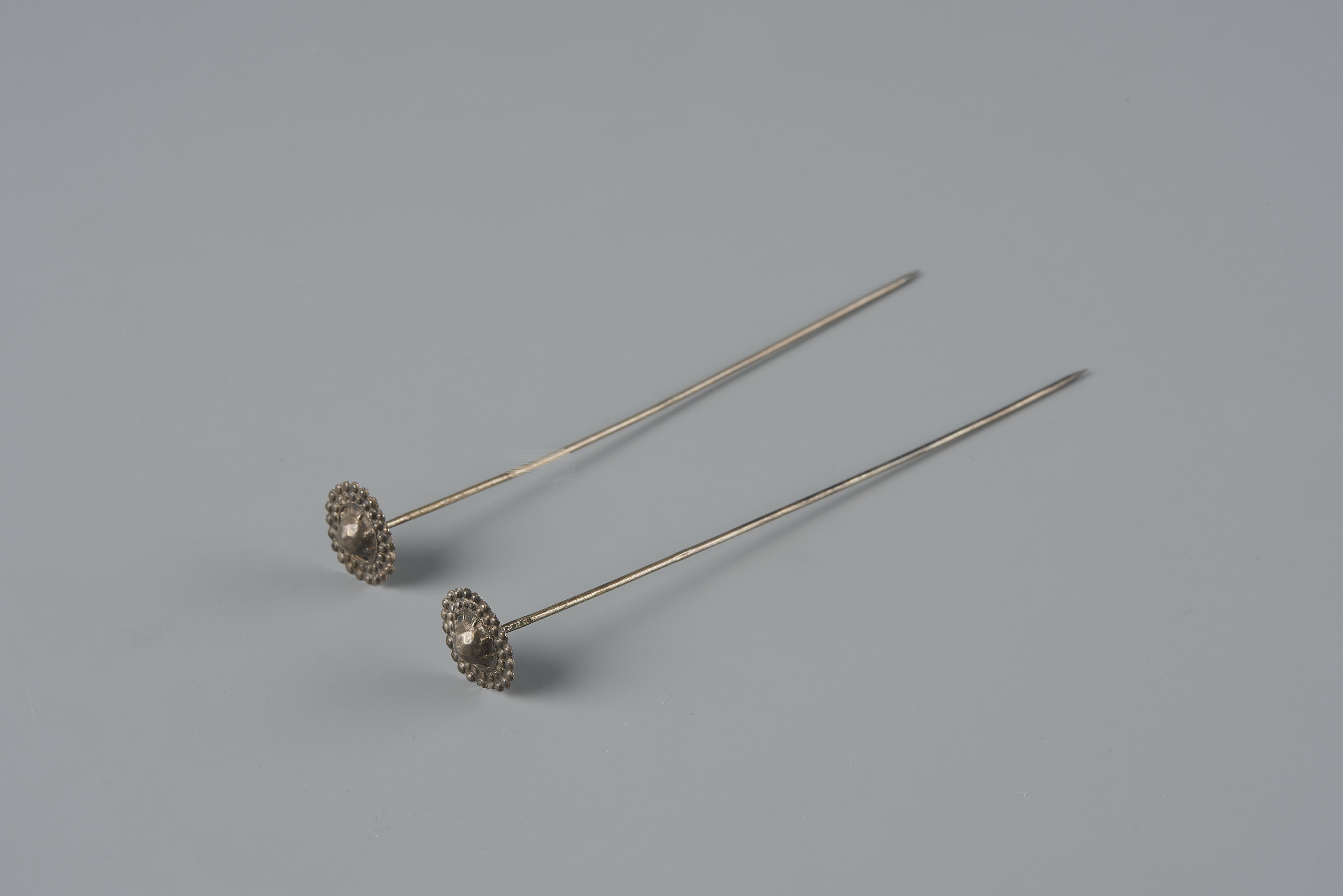 Paar zilveren mutsspelden, gemaakt omstreeks 1870 en gedragen in Friesland. Deze spelden werden in de muts gestoken achter de uiteinden van het oorijzer.