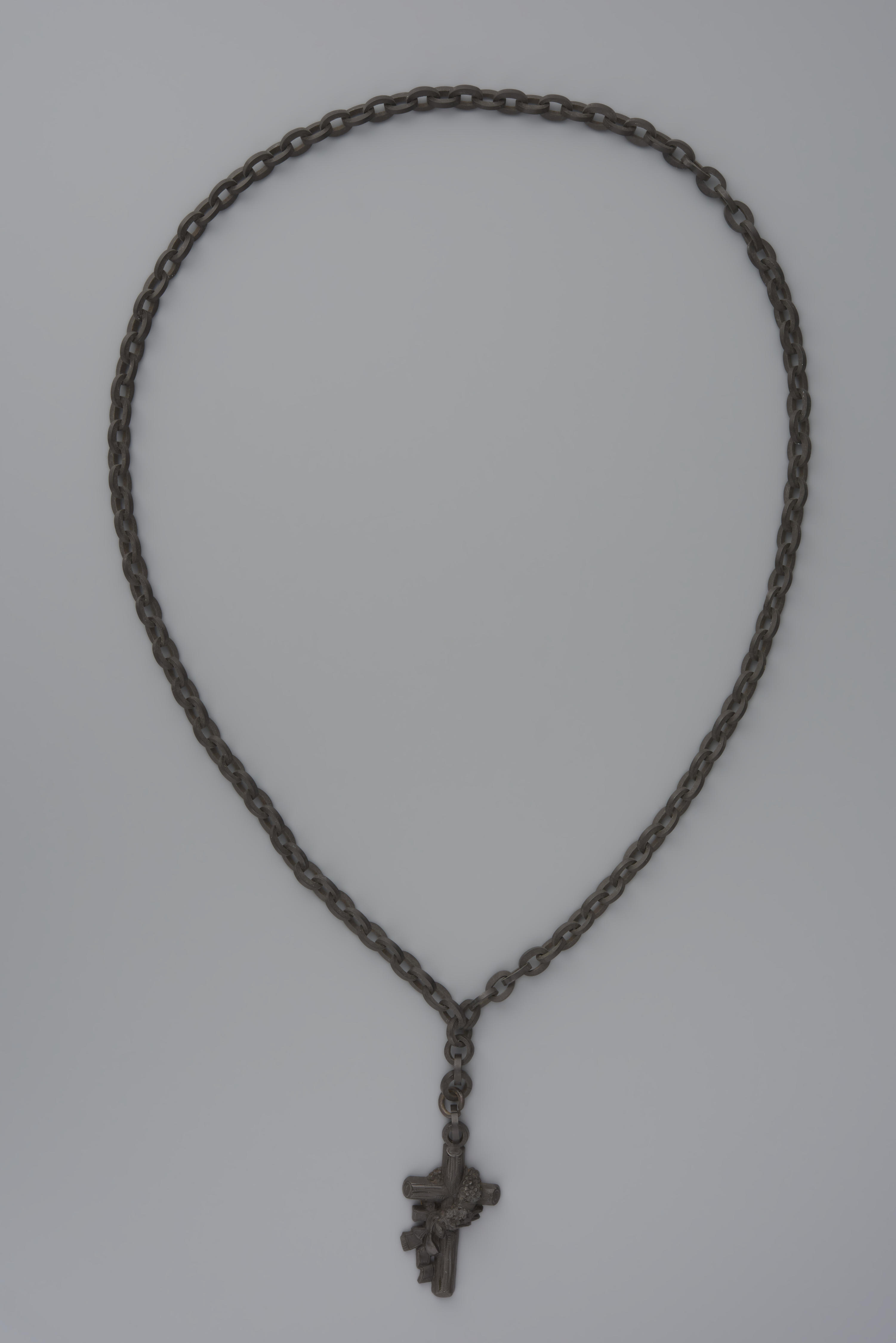Halsketting met kruishanger, gesneden uit fossiel hout. Lange kettingen met een kruishanger van bois durci (versteend hout) zijn vooral in Noord-Brabant en Limburg door rooms-katholieke vrouwen gedragen.