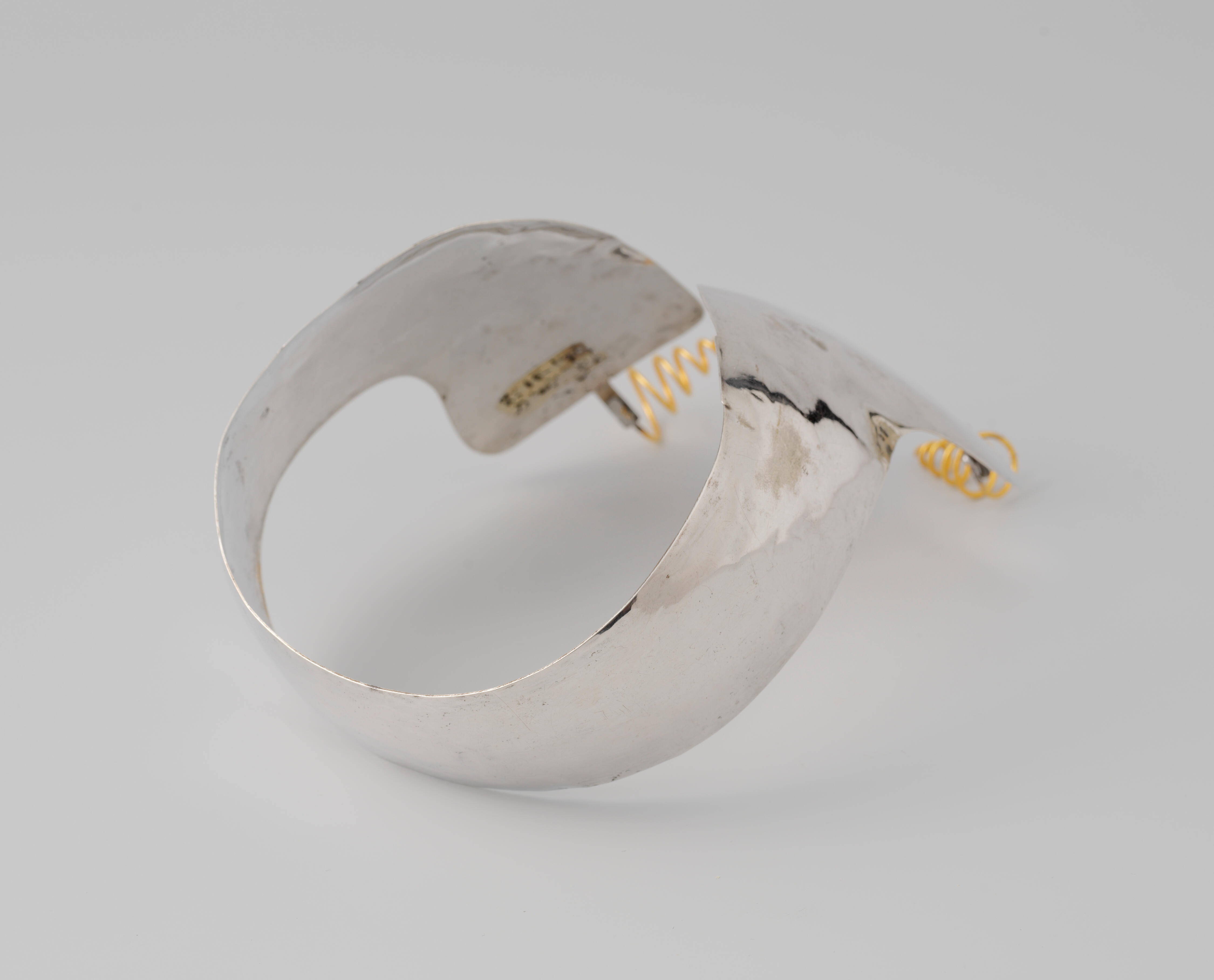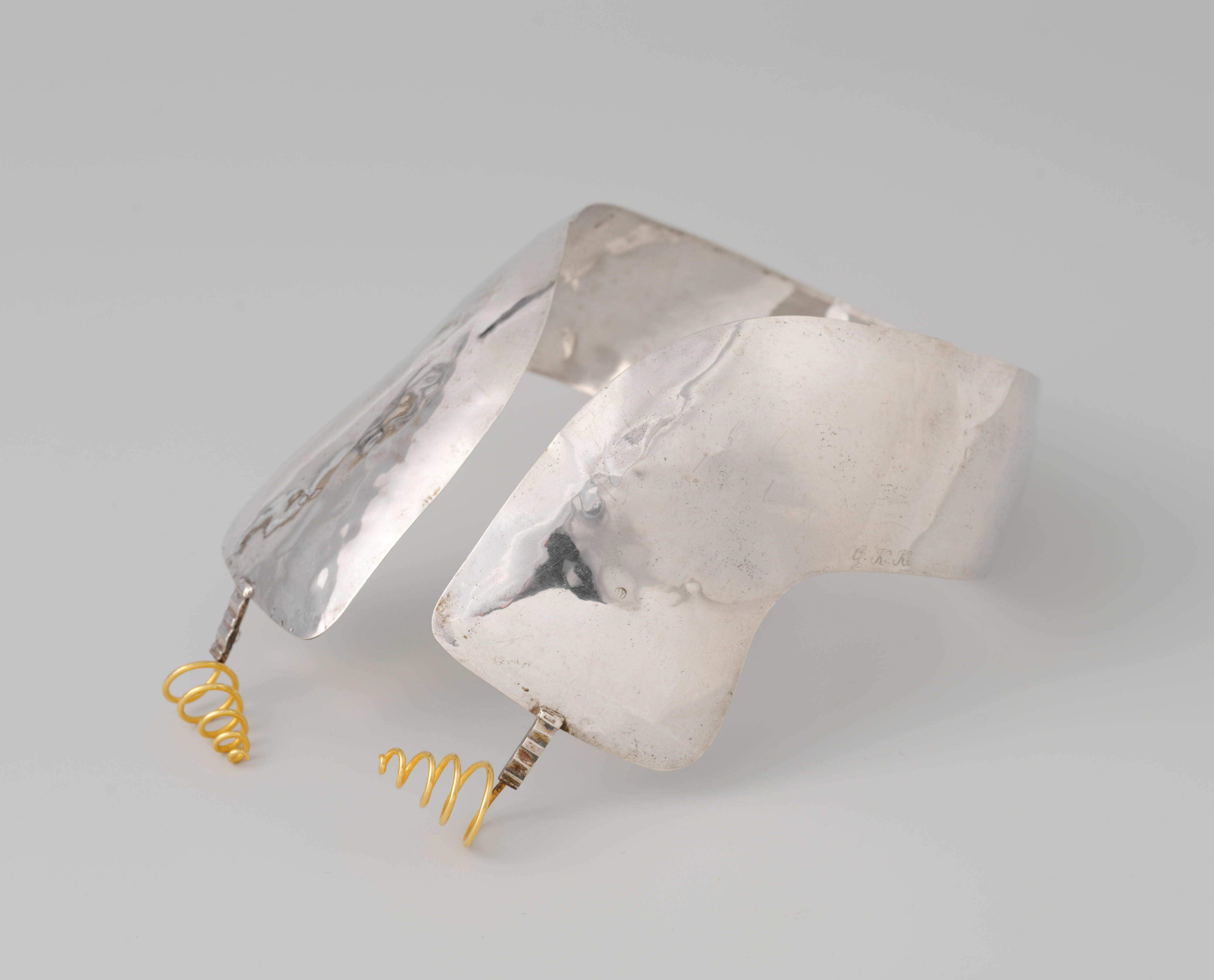 Een zilveren oorijzer met vergulde messing krullen, gedragen door een vrouw in Drentse streekdracht uit Ruinerwold. Het oorijzer is in 1858 vervaardigd door Arjen Sweering in Meppel. In de beugel staan de initialen CKK gegraveerd.