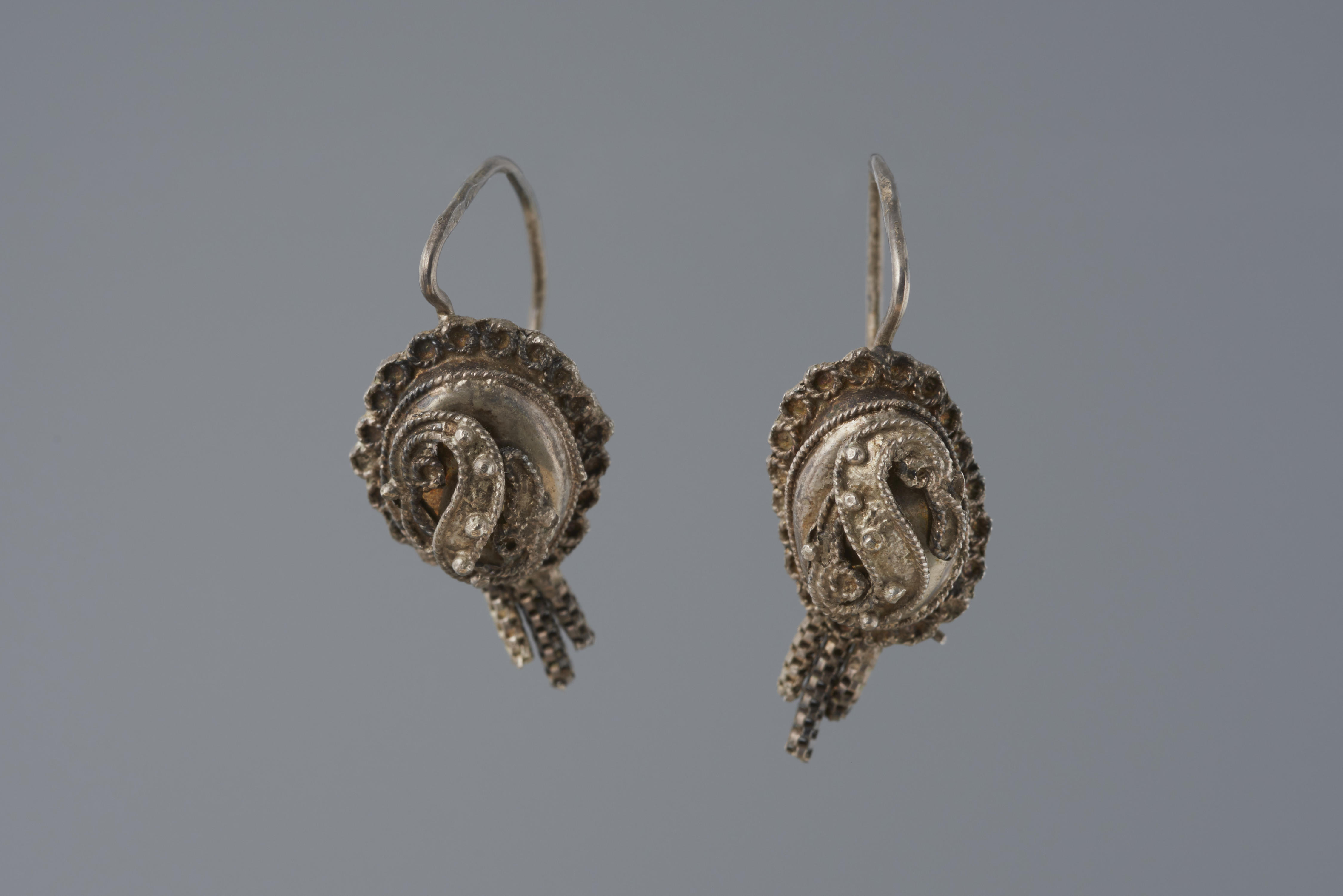 Paar zilveren oorbellen, rond 1915-1925 gedragen bij de rouwdracht door een meisje of vrouw uit Holten. De maker van de oorbellen is onbekend.
