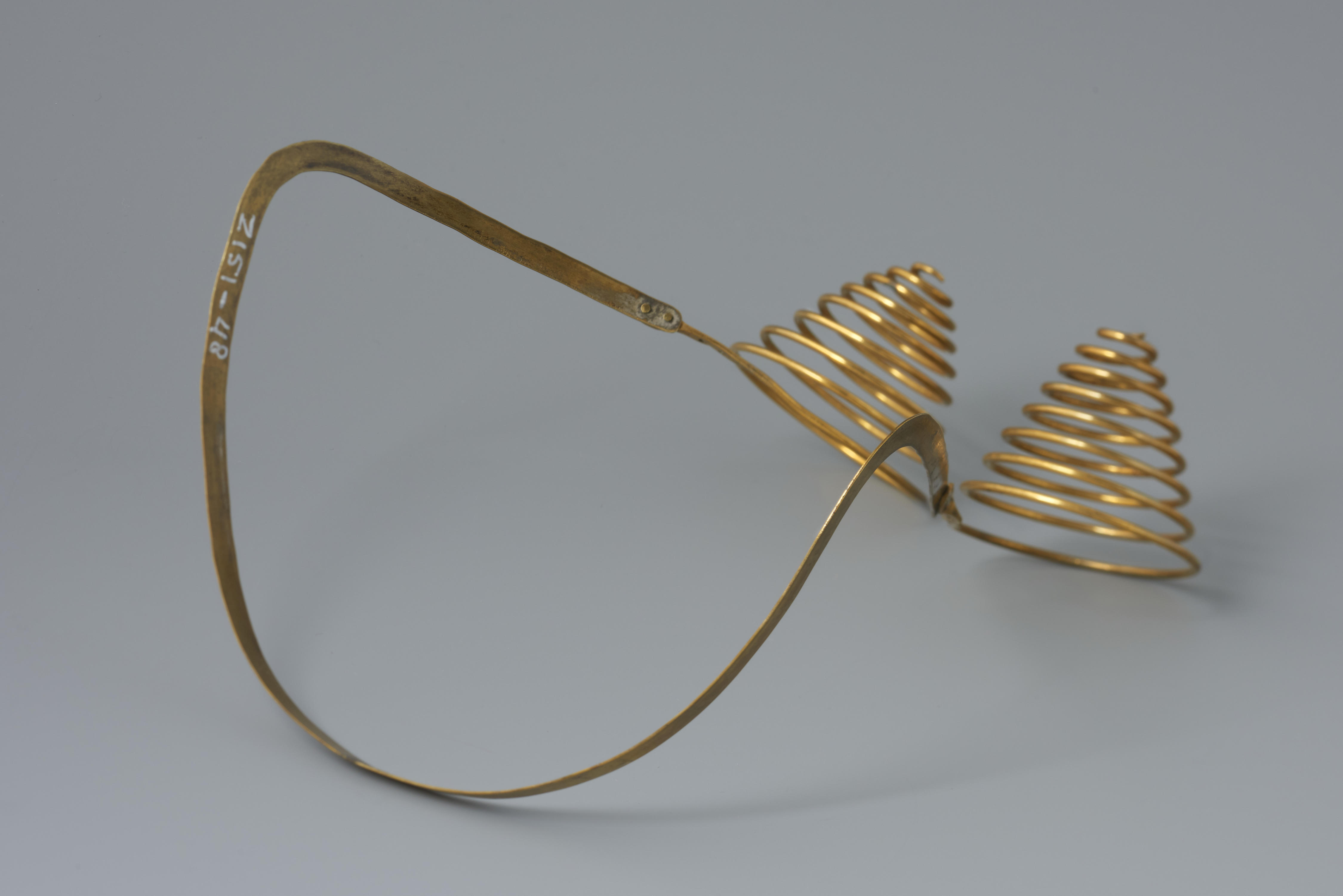Een messing oorijzer met twee vergulde messing krullen, gedragen door een vrouw in streekdracht van de Zuid-Hollandse Eilanden. Het oorijzer zou in 1898 gebruikt zijn in de tentoonstelling 'Nationale Kleederdrachten van Harer Majesteits onderdanen' in Amsterdam. De vervaardiger van het oorijzer is onbekend. In de krullen staan imitatiegoudmerken.