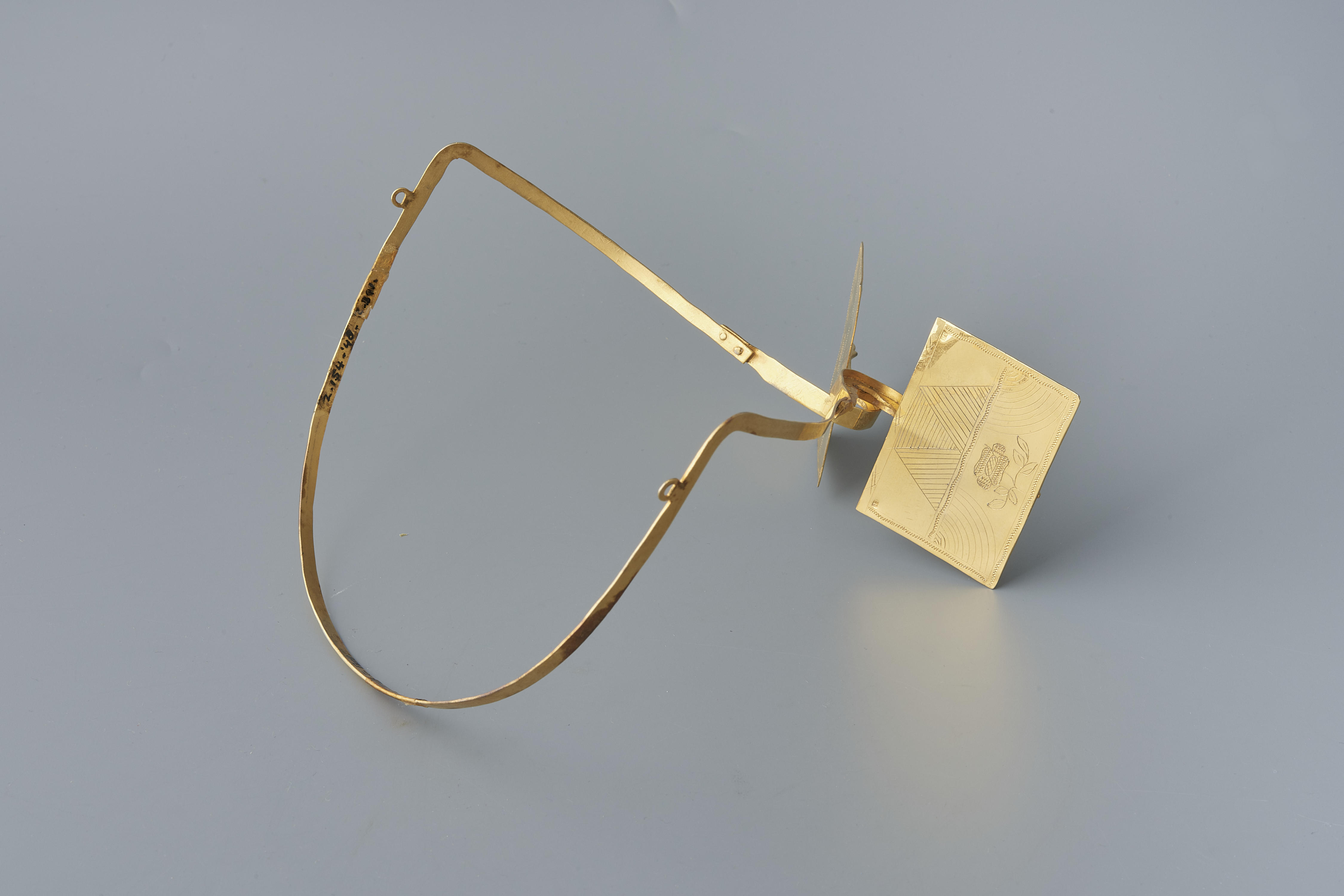 Oorijzer, gedragen door een vrouw in Zuid-Bevelandse streekdracht. Het oorijzer bestaat uit een vergulde messing beugel en twee vergulde messing ‘stikken’ (rechthoekige oorijzeruiteinden). De stikken zijn aan de achterzijde versierd met graveerwerk. Op de stikken staat het merk JT. Het merk JT schijnt in gebruik geweest te zijn bij een koperslager die aan het eind ...