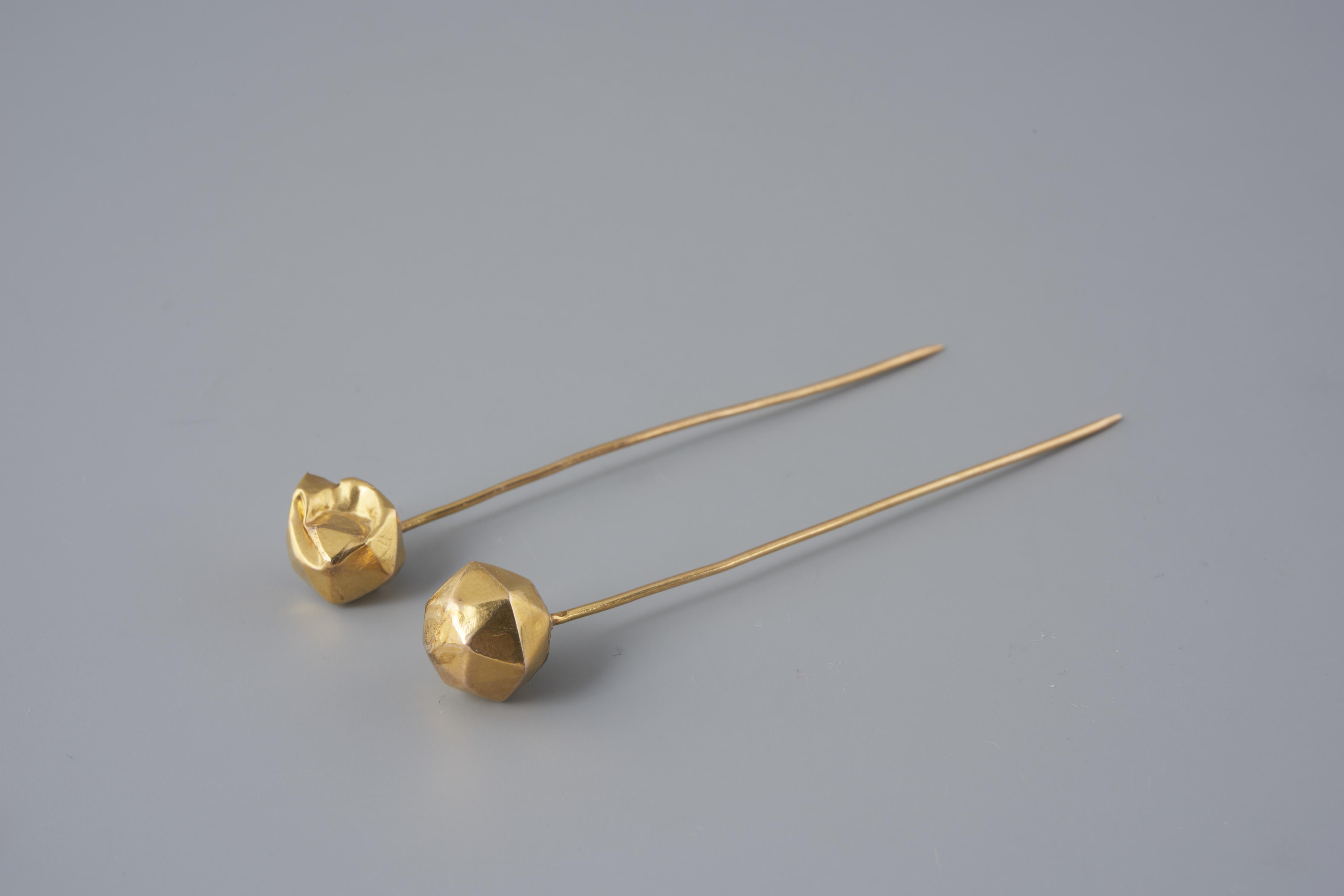 Paar 14-karaats gouden mutsspelden, gedragen in Huizen en gebruikt om de muts aan het oorijzer vast te steken. Dergelijke 'facetspelden' werden bij diverse streekdrachten in Nederland gedragen.