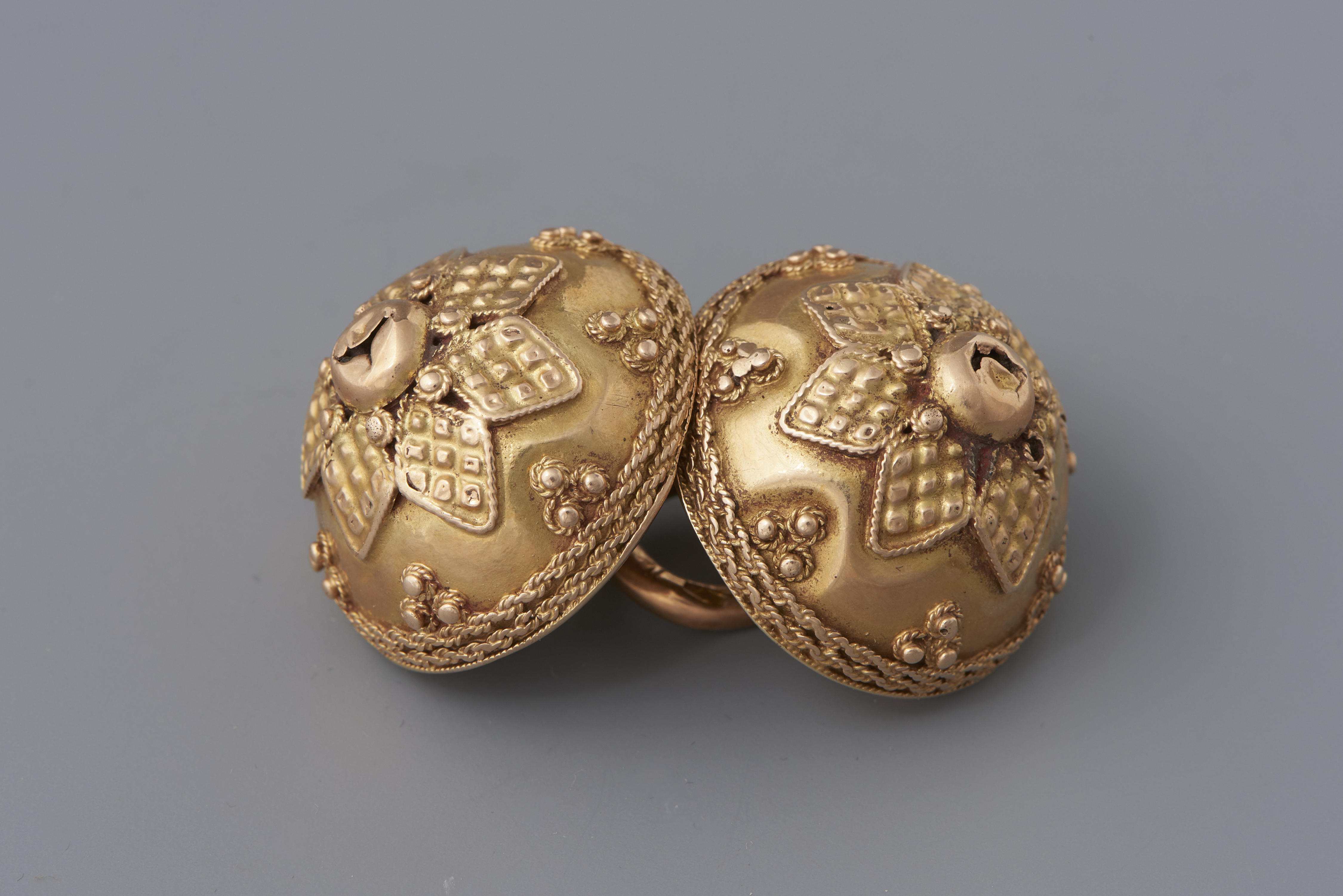 Paar 14-karaats gouden keelknopen. Keelknopen werden gebruikt om de halsboord van het hemd of het overhemd te sluiten. De vervaardiger is onbekend. De knopen hebben een gehaltemerk dat gebruikt is vanaf 1853. Ze zijn toegeschreven aan Schokland en door het museum verworven samen met een aantal Schokker kledingstukken. De toeschrijving is niet helemaal zeker. Het ...