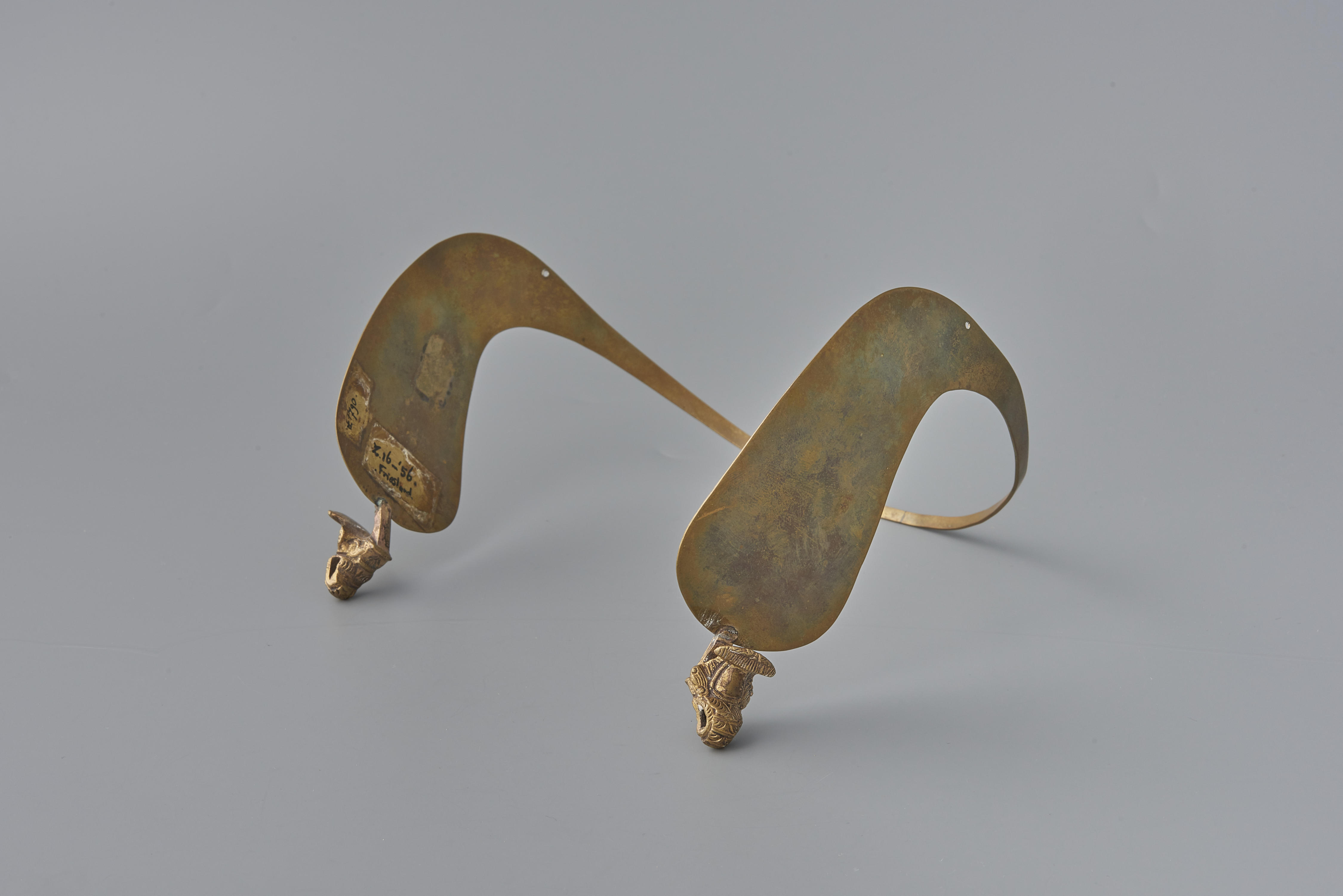 Een reconstructie van een Fries oorijzer uit omstreeks 1790. De beugel van dit exemplaar is in 1956 vervaardigd in opdracht van het Openluchtmuseum. Vervolgens zijn er een paar gegoten knoppen van een ander oorijzer aangezet. In beugel en knoppen staan geen merken.