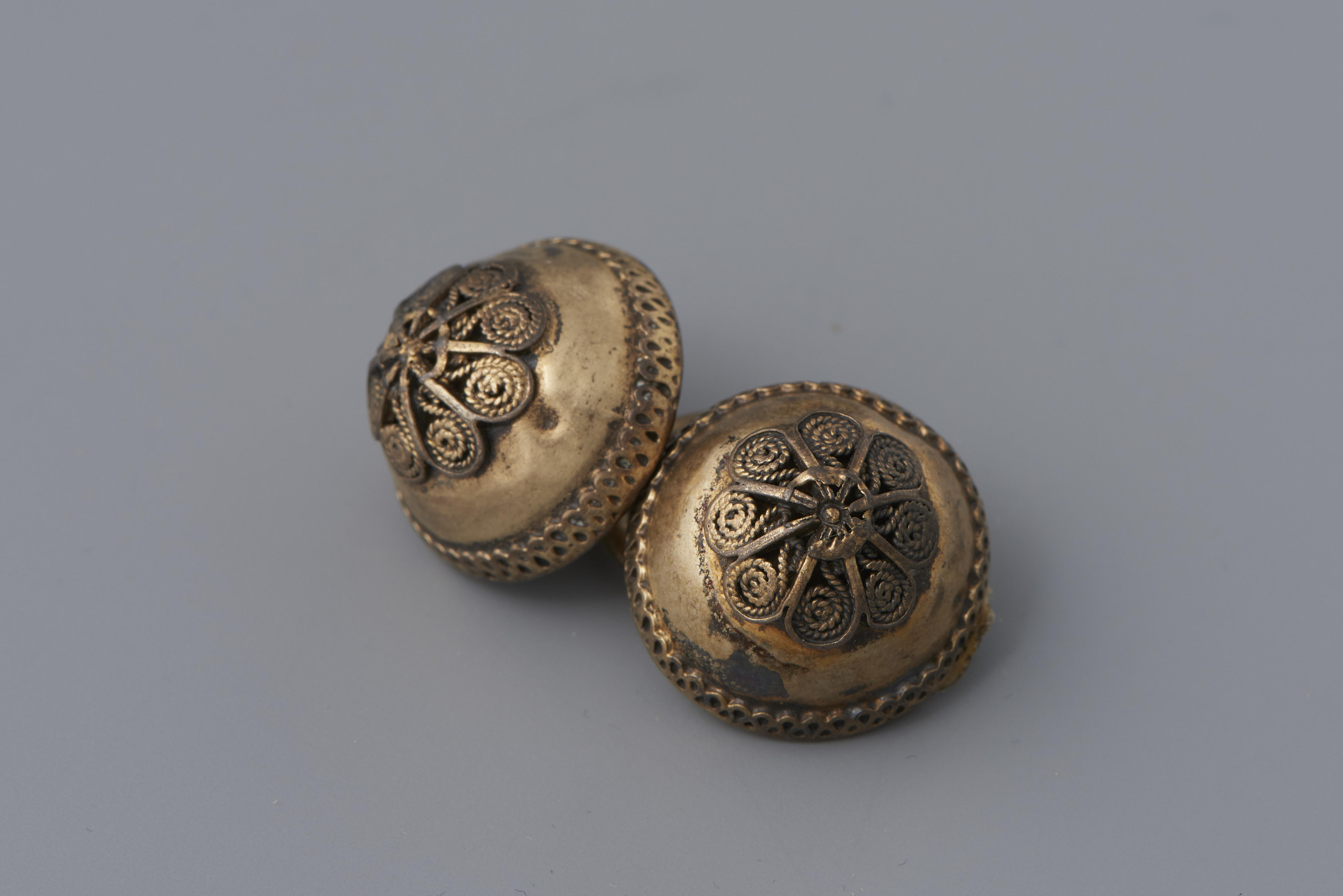 Paar vergulde zilveren keelknopen, gedragen door een jongen uit Volendam. Keelknopen werden gebruikt om de halsboord van het hemd of het overhemd te sluiten. De vervaardiger is onbekend. De knopen hebben een gehaltemerk dat gebruikt is tussen 1814 en 1906.