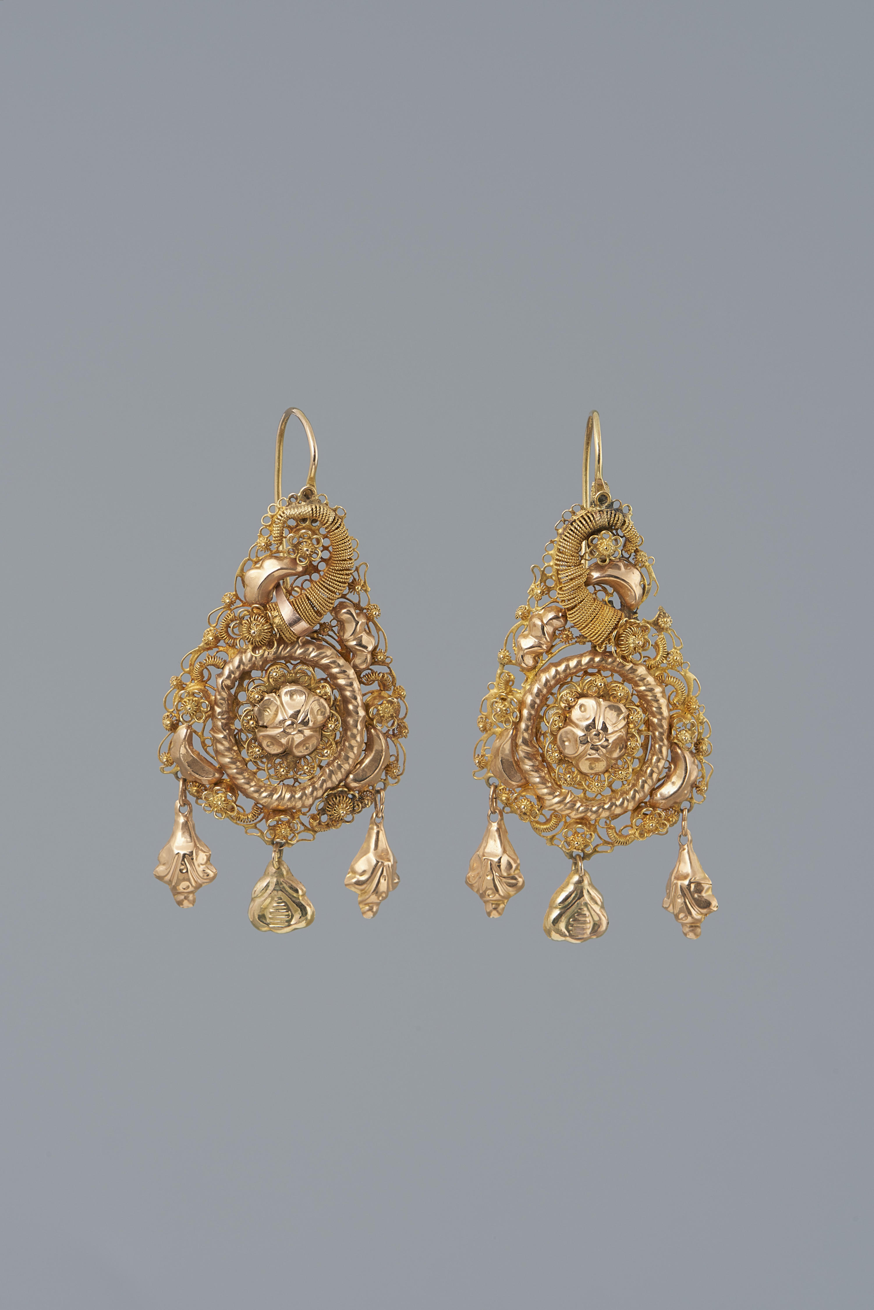 Paar gouden oorbellen uit omstreeks 1865-1875, gedragen door een vrouw uit de provincie Groningen. De vervaardiger is onbekend. Dit type oorhanger kwam voornamelijk voor in de noordelijke provincies.