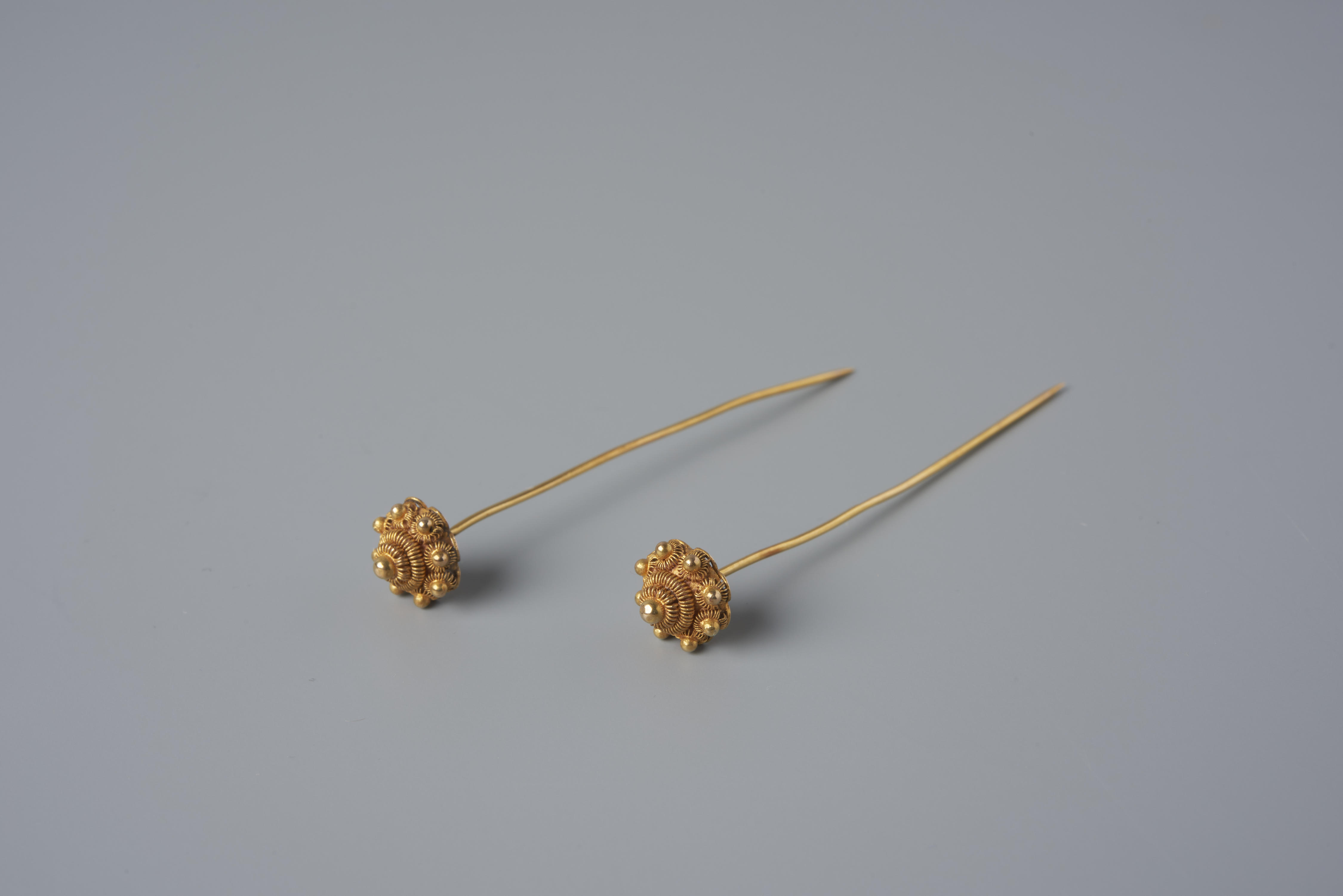 Paar gouden mutsspelden, gedragen op Walcheren. Dit type mutsspeld kwam er omstreeks 1915 in de mode en werd knopspeld genoemd. De spelden werden opzij in de ondermuts gestoken. Men droeg soms twee of drie paar knopspelden tegelijk, oplopend in grootte.