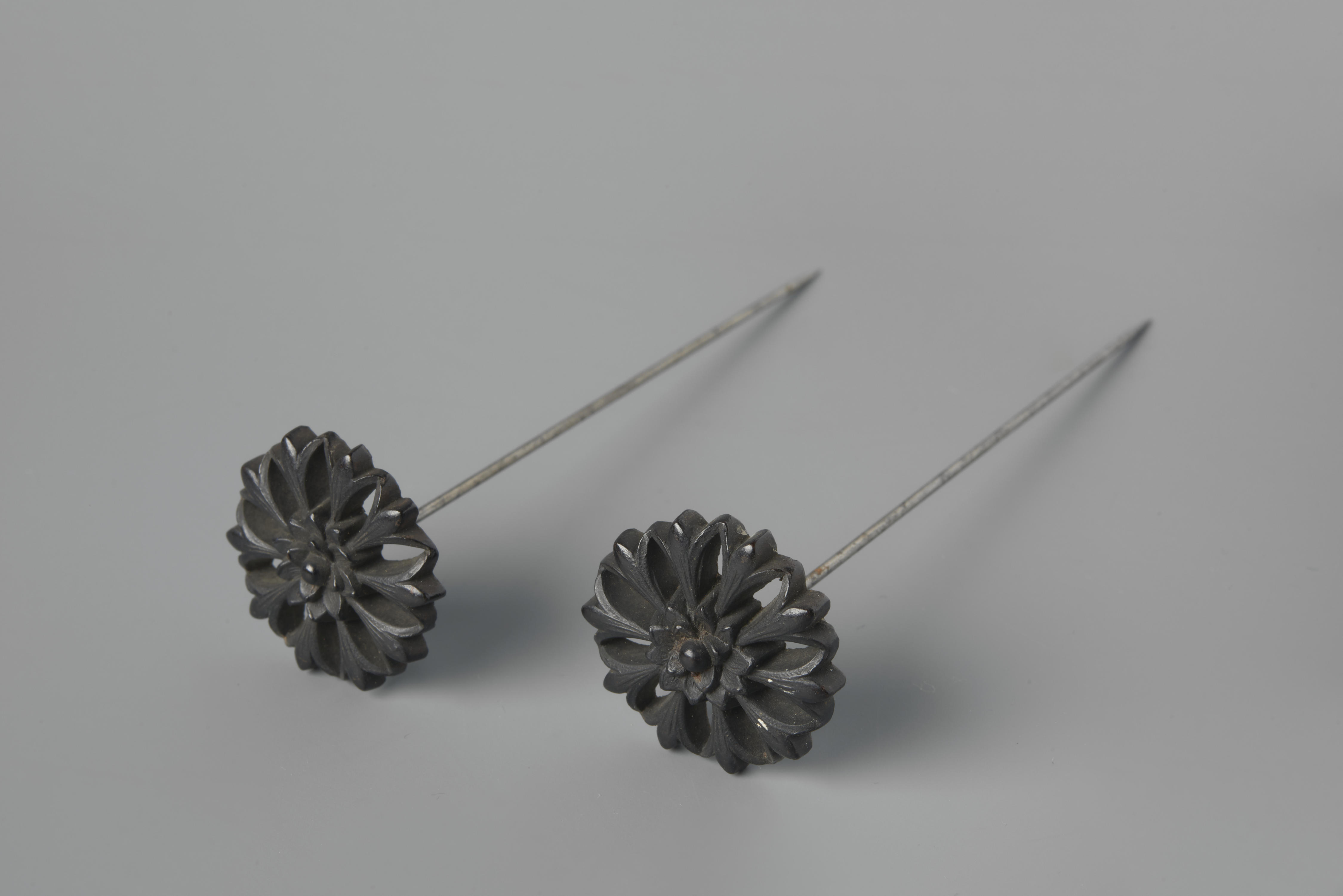 Paar mutsspelden, gemaakt omstreeks 1890 en gedragen door een vrouw op Sint Philipsland bij de rouwdracht. De knoppen zijn waarschijnlijk gemaakt van eboniet. De spelden werden horizontaal achterwaarts in de sluiermuts gestoken tussen de krullen van het oorijzer. De vervaardiger is onbekend.