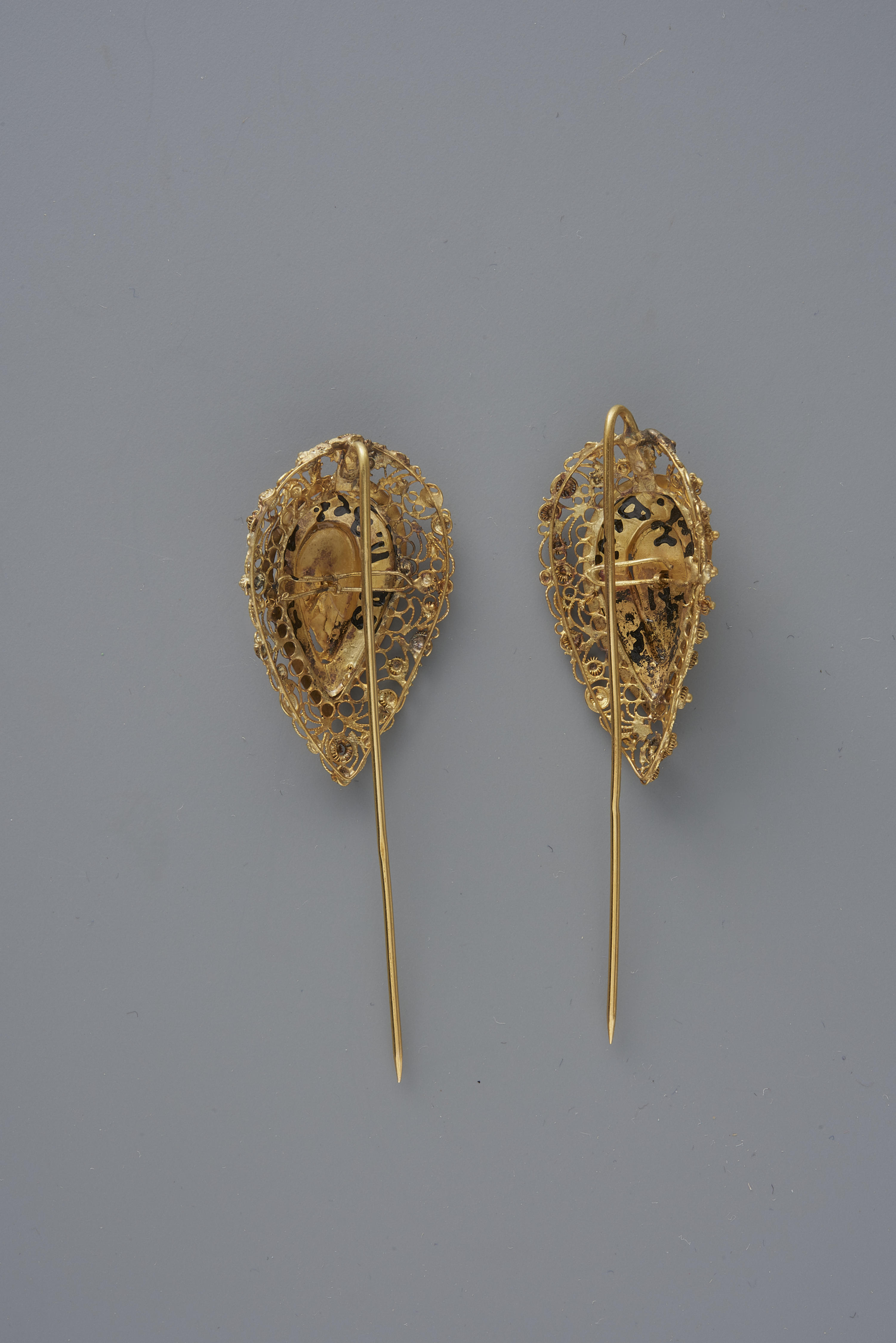 Paar 14-karaats gouden spelden uit omstreeks 1880. De vervaardiger is onbekend. Deze spelden zijn bij binnenkomst in het museum in 1958 geïdentificeerd als Noord-Bevelandse bovenspelden, bedoeld om bovenop de sluiermuts te steken. Recent meende een expert echter dat het hier gaat om twee 'borstspelden', behorend bij een Zuid-Bevelandse ‘borstzeug’, een type broche. Aan het eind ...