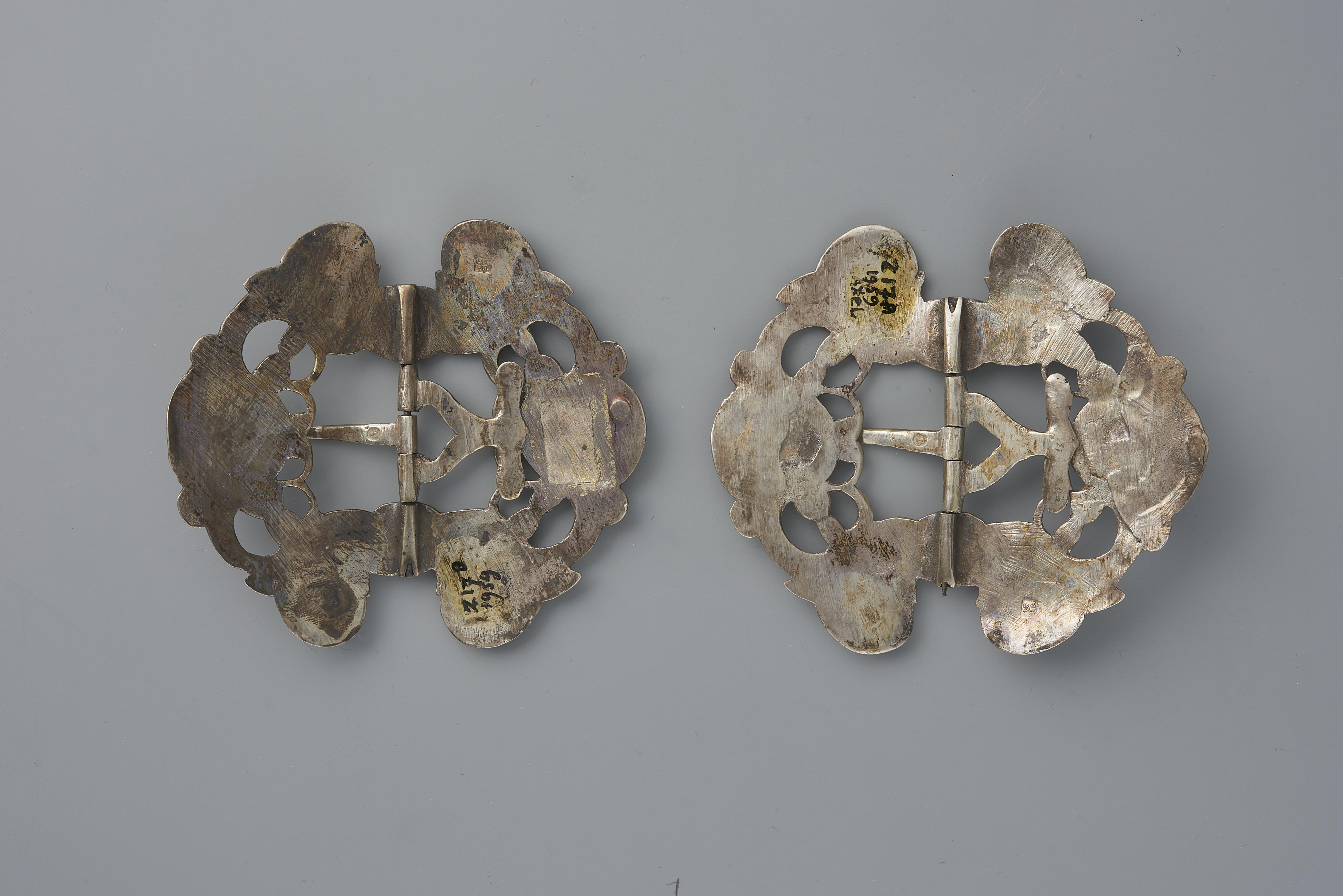 Paar zilveren schoengespen, gedragen door een meisje of vrouw uit Axel. Dit model gesp is typisch voor Axel en werd in principe niet op de andere Zeeuwse eilanden gedragen. De gespen zijn in 1853 vervaardigd door de Firma Gebroeders G. en D. Wendels in Middelburg.