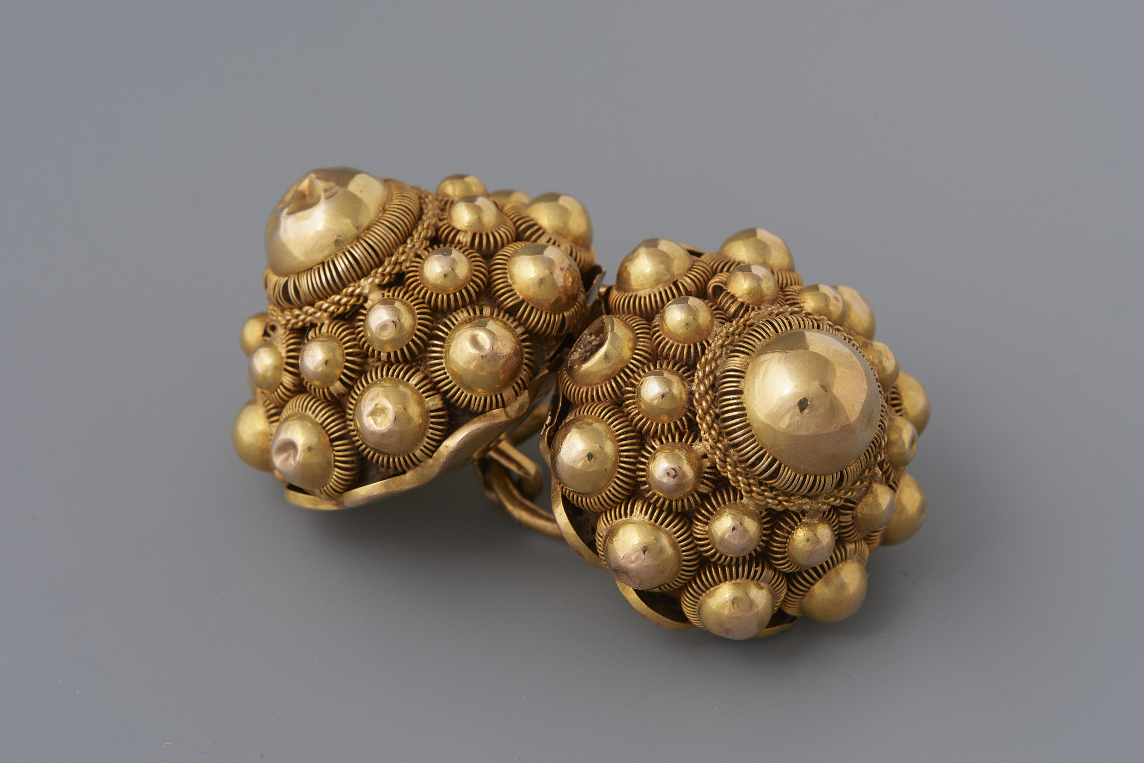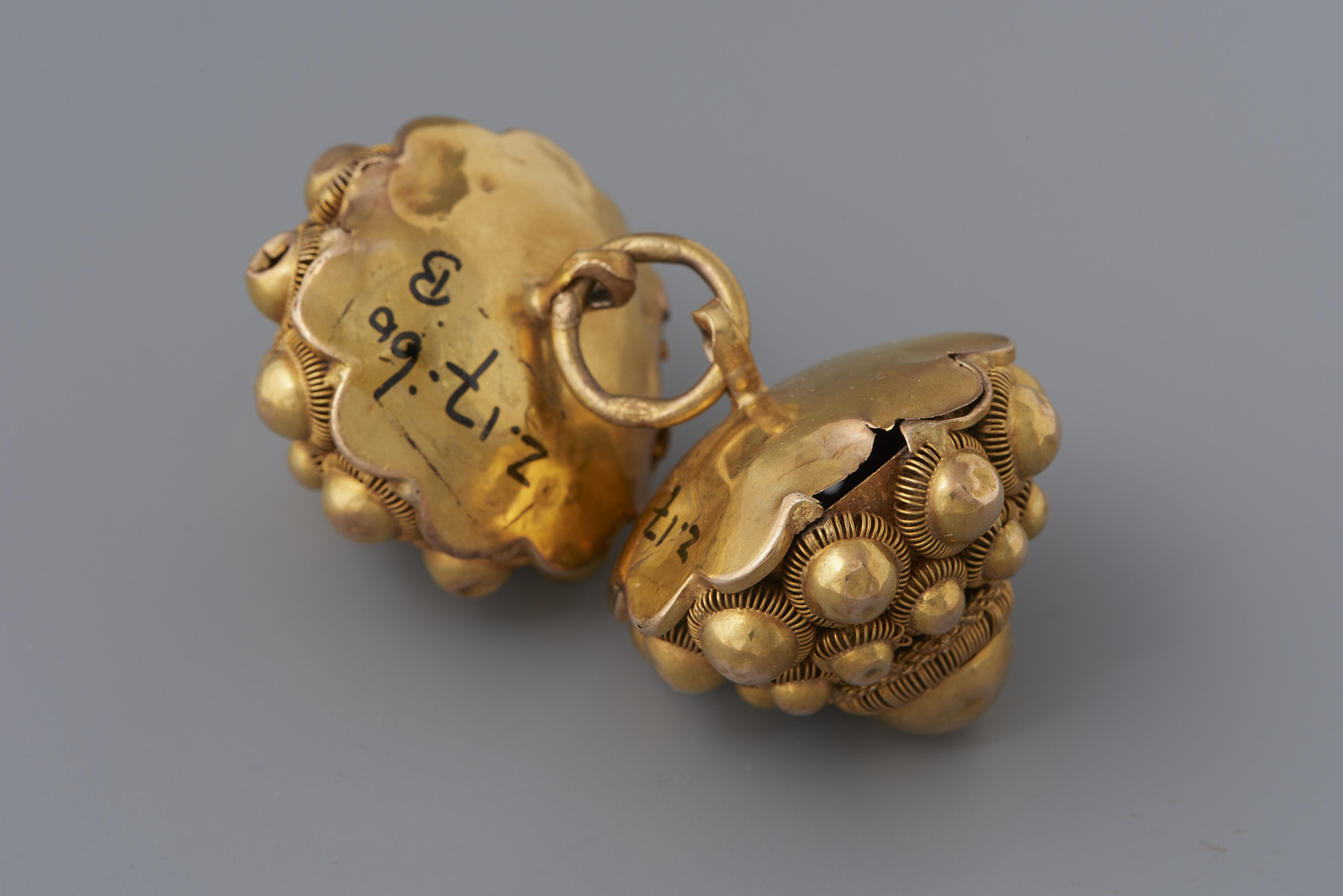 Jongens kregen rond hun eerste verjaardag hun eerste keelknopen. Dit waren meestal zilveren of kleine gouden knopen. Dit paar is van 14-karaats goud en is gezien het model gedragen door een man of oudere jongen uit Staphorst of Rouveen. Keelknopen werden gebruikt om de halsboord van het hemd te sluiten. Knopen met een dubbele rij ...