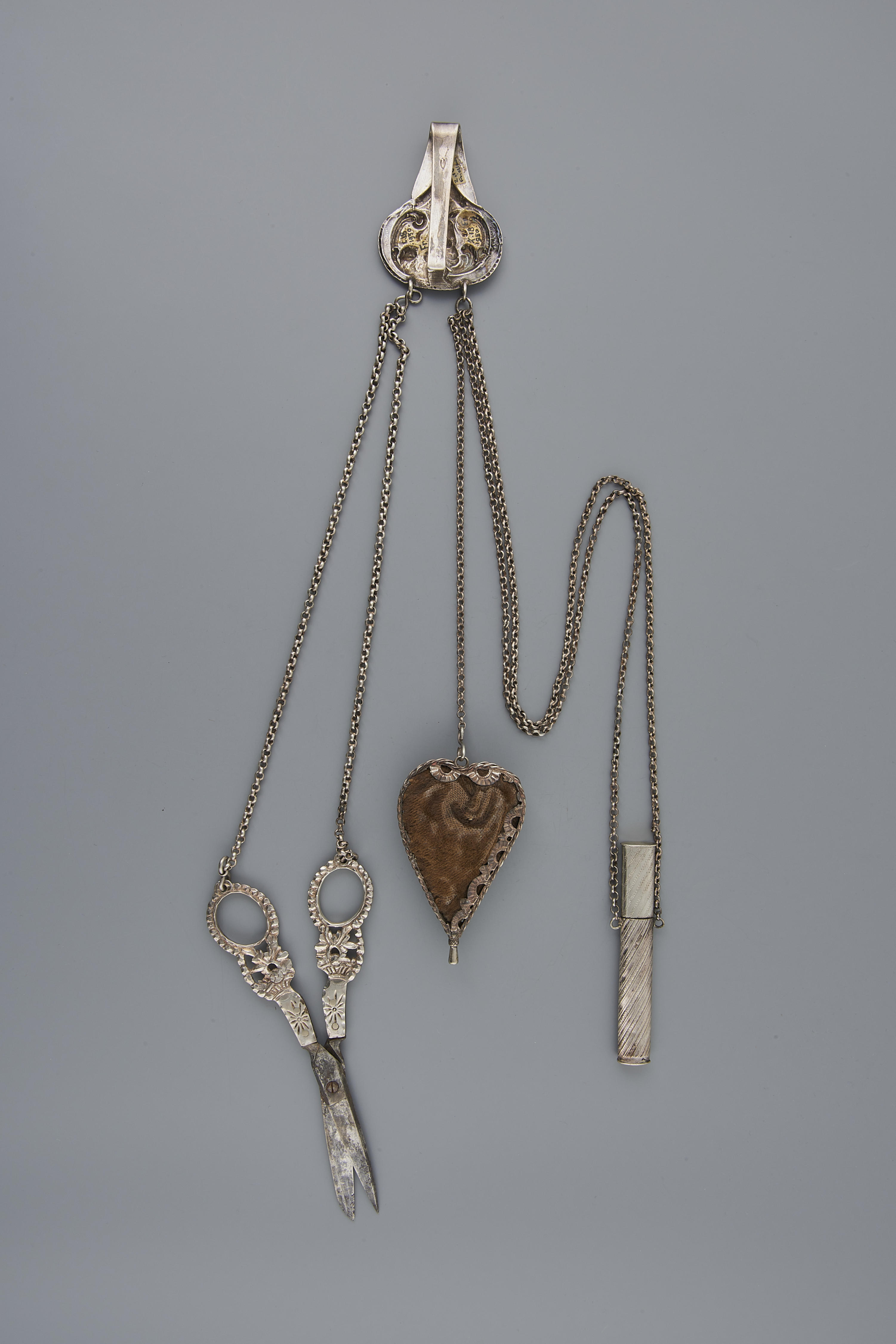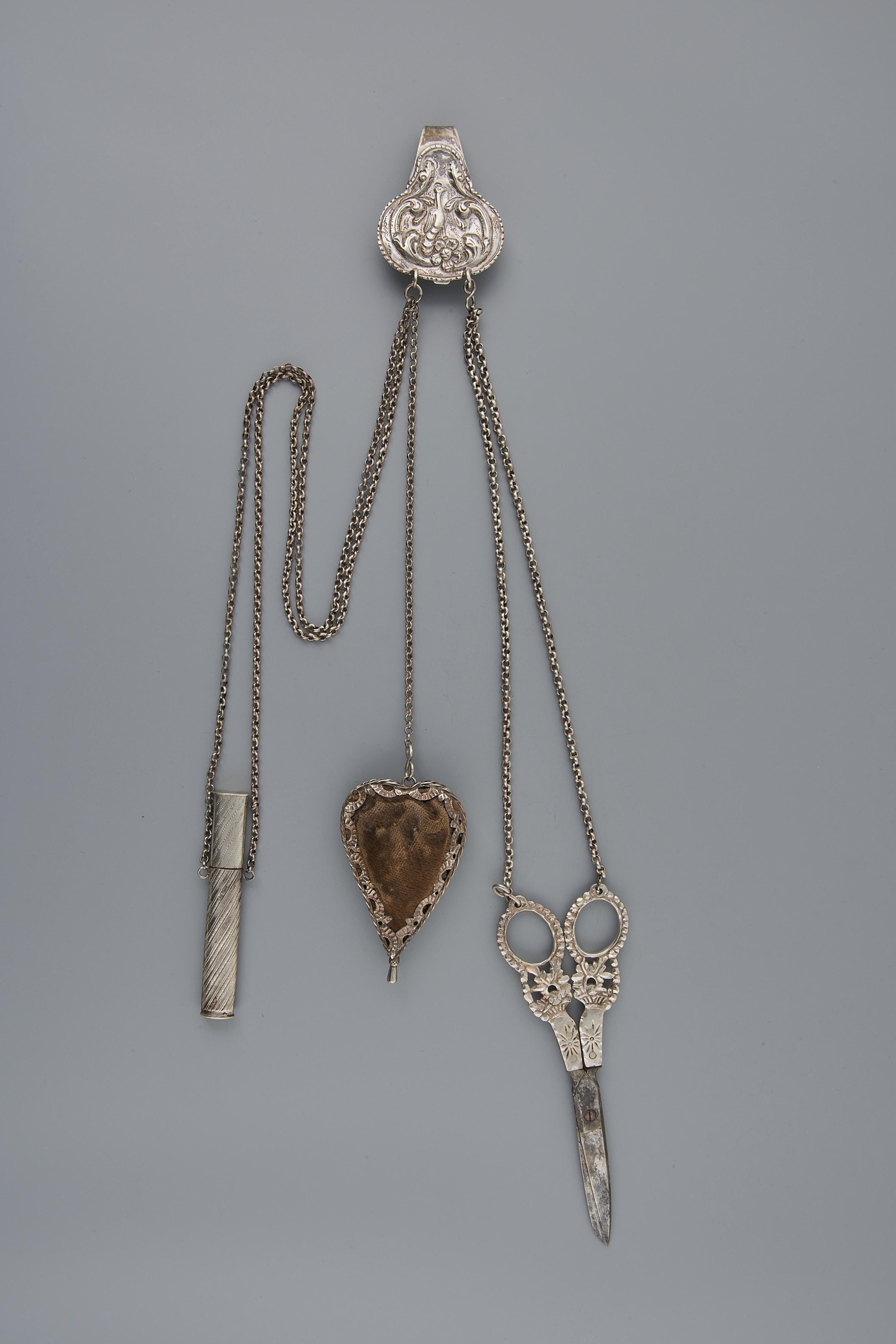 Chatelaine of 'prak', bestaande uit een haak, schaar, speldenkussen en naaldenkoker. Dergelijke chatelaines werden gedragen door vrouwen in Friesland. De schaar heeft rond de ogen een versiering van 'diamantkoppen'. Het meesterteken op de schaar is onleesbaar. Het merkteken op de haak is onduidelijk. Op de rand van het speldenkussen staan geen merken. De naaldenkoker is ...