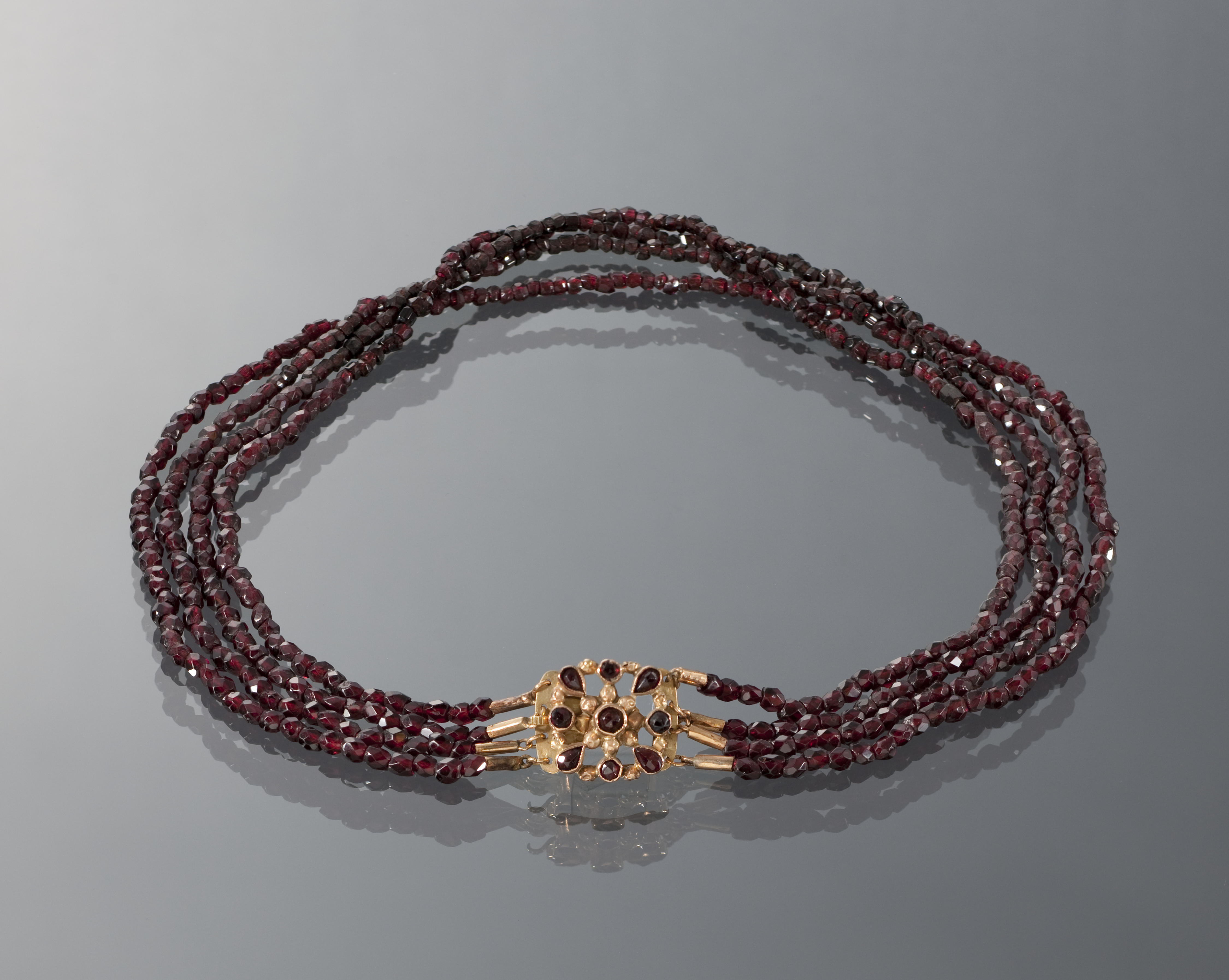 Halssnoer, bestaande uit vier strengen glazen kralen aan een 14-karaats gouden slot en gemaakt omstreeks 1900-1915. Het halssnoer is gedragen door een vrouw afkomstig uit het stroomgebied van de IJssel. Dit type is niet specifiek voor een bepaalde streek en werd ook bij de algemene modedracht gedragen.