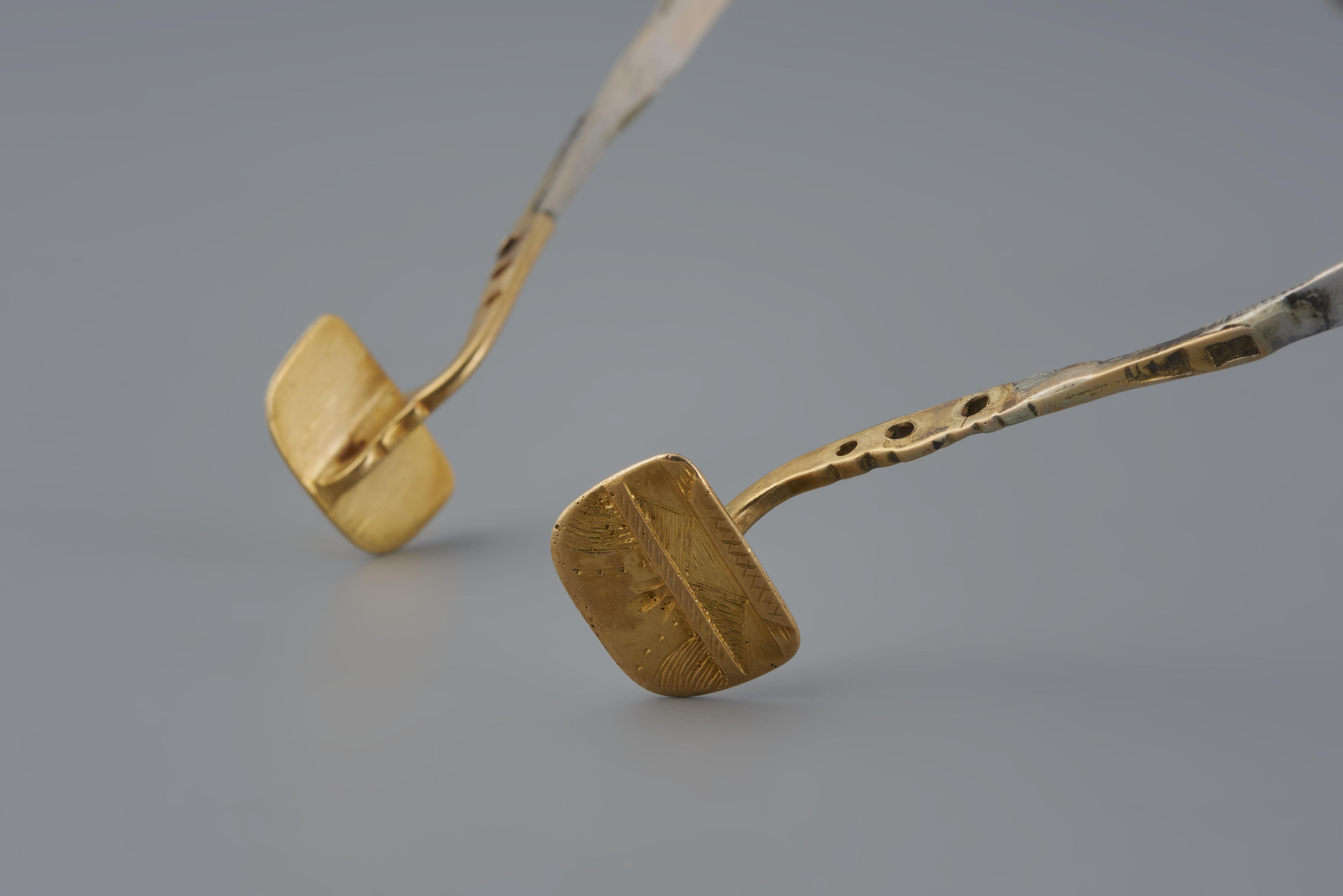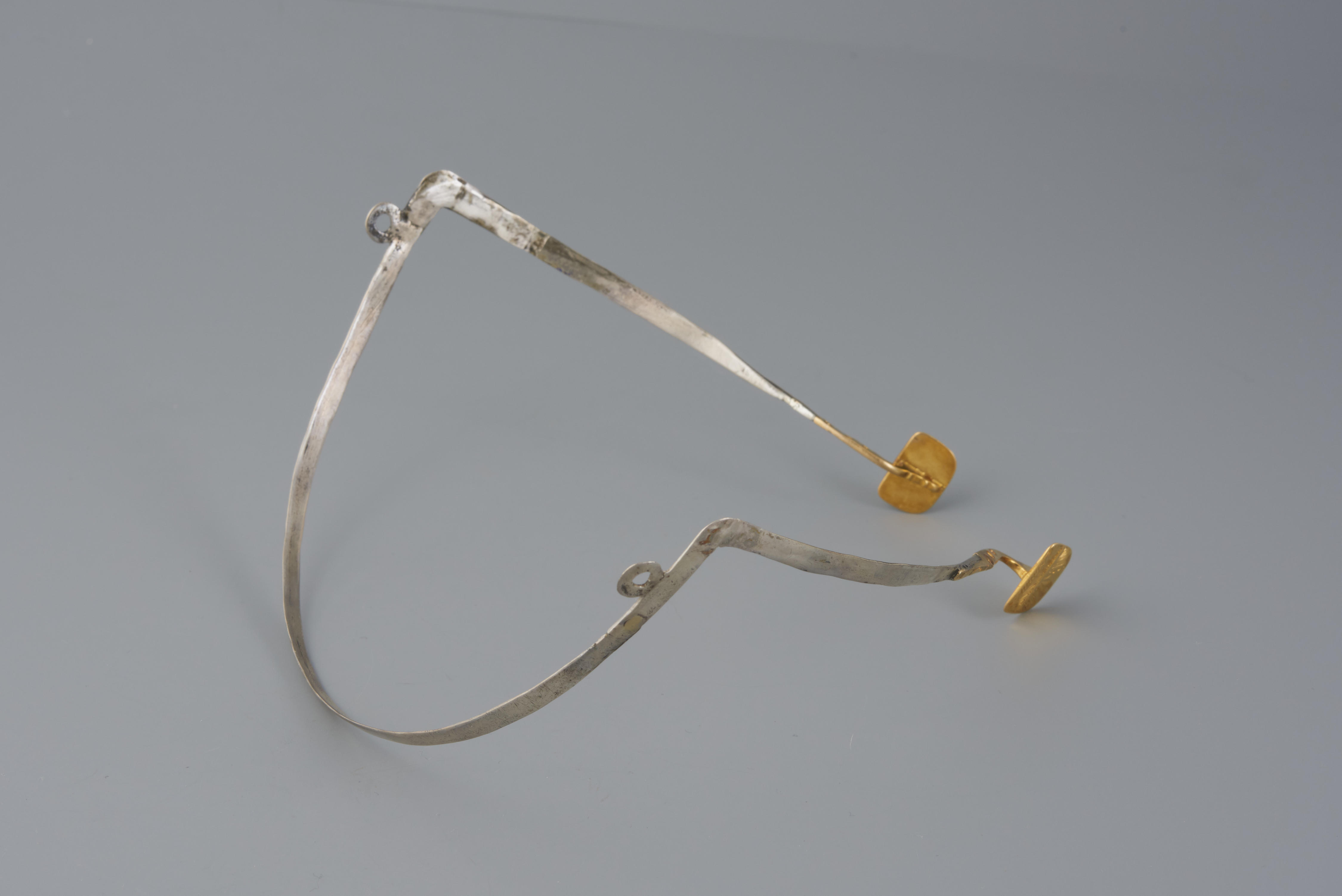 Een oorijzer, gedragen door een vrouw in streekdracht van Walcheren. Het oorijzer bestaat uit een smalle zilveren beugel met gouden 'stikken' aan de uiteinden. De stikken hebben een gegraveerde versiering. In de aanzet van de stikken zitten drie gaatjes. Hierdoor kunnen spelden gestoken worden om het oorijzer aan de muts te spelden. Deze gaatjes zijn ...