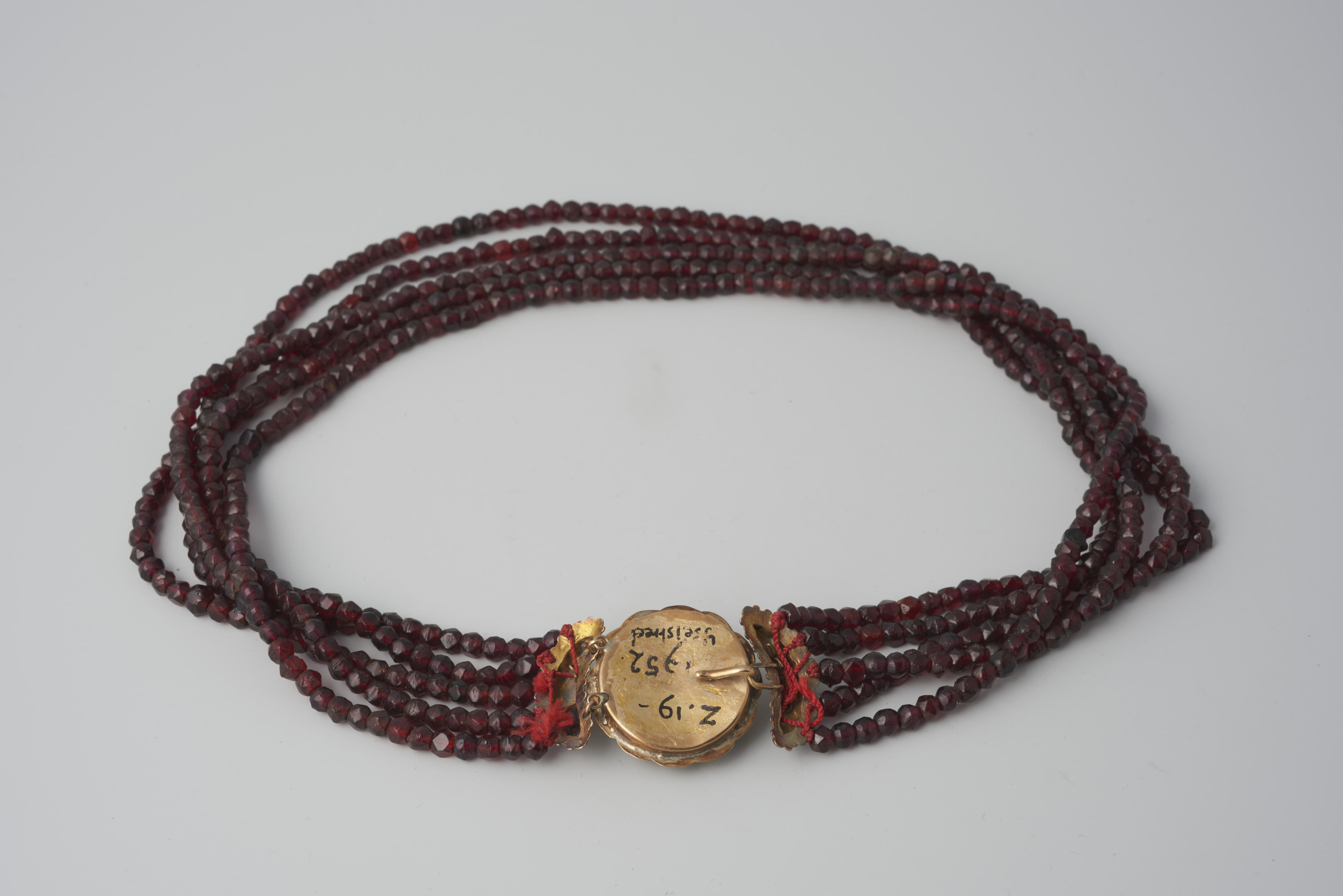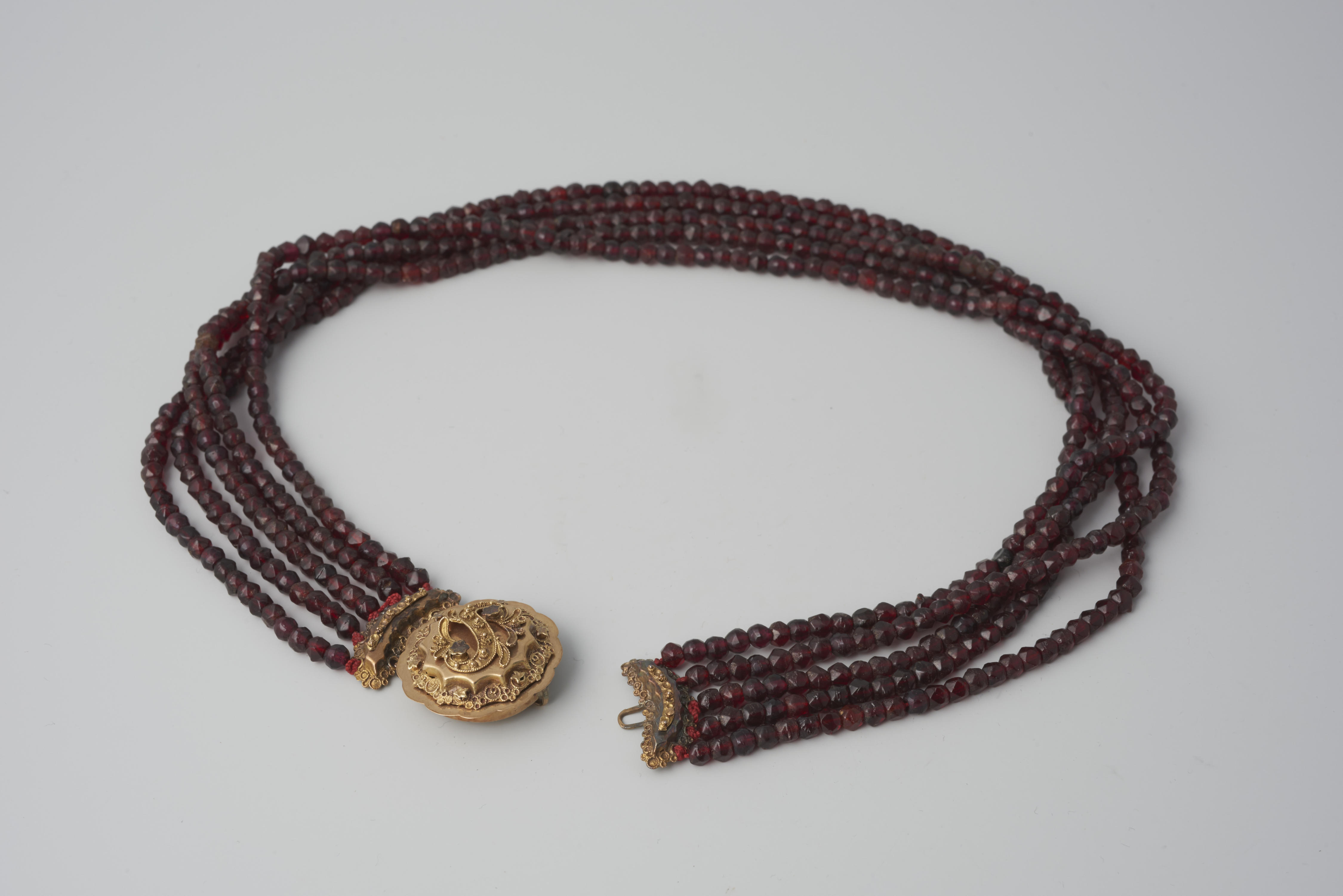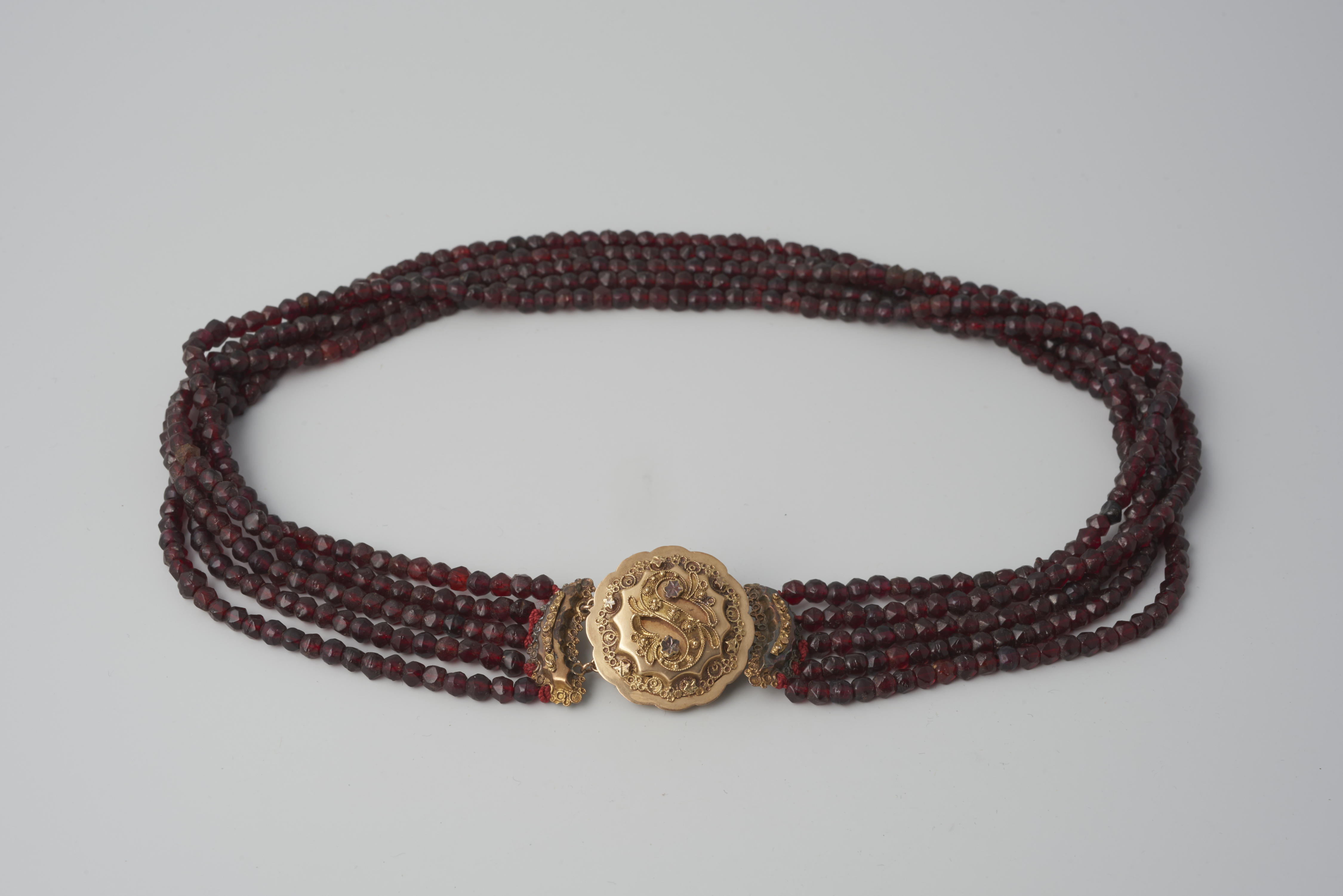 Halssnoer, bestaande uit vijf strengen glazen kralen aan een 14-karaats gouden slot uit omstreeks 1910. Het halssnoer is gedragen door een vrouw afkomstig uit het stroomgebied van de IJssel. Het is in 1952 verworven met vier strengen kralen. In 1976 werd door het Openluchtmuseum een vijfde streng kralen toegevoegd.