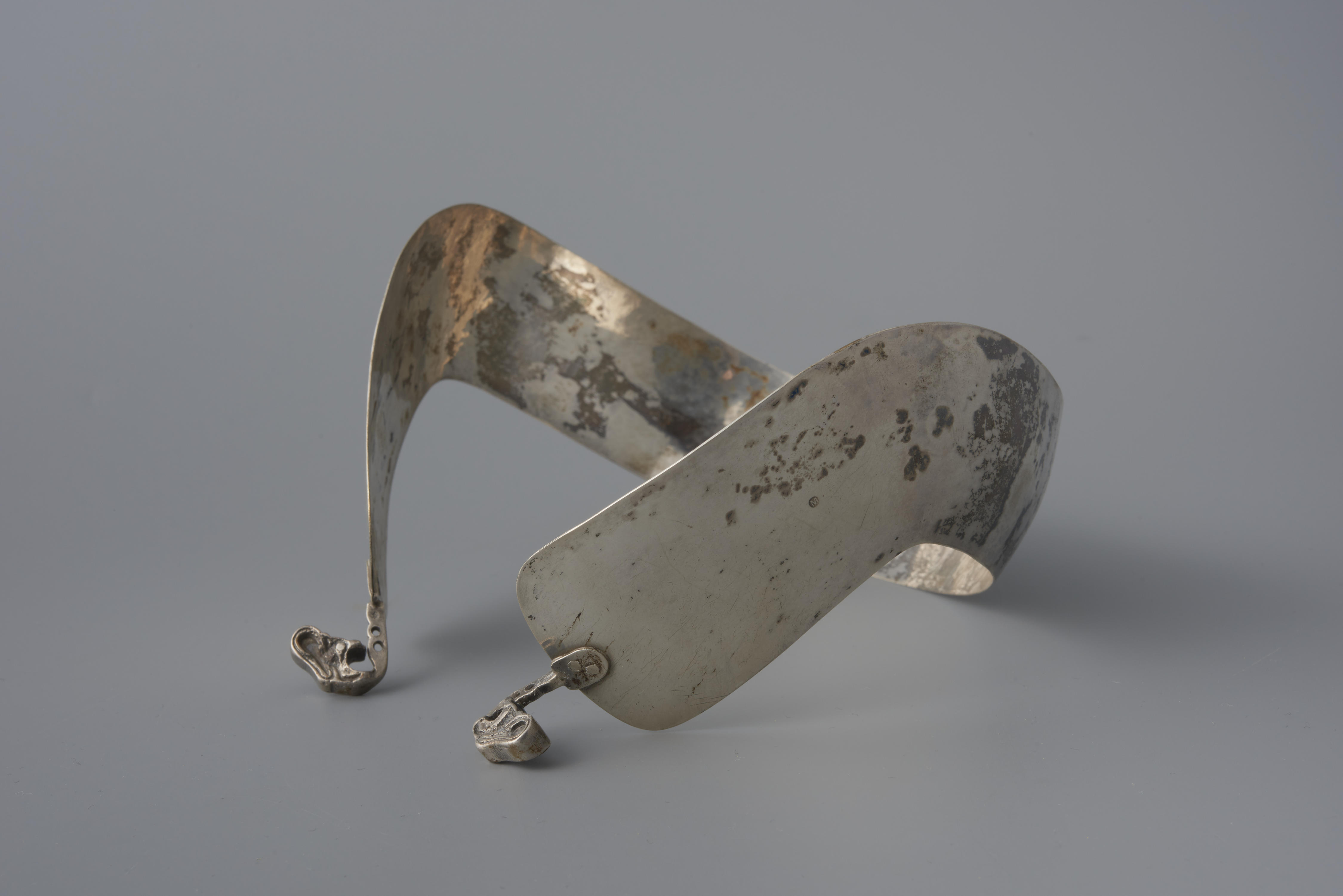 Zilveren oorijzer, gedragen door een vrouw of ouder meisje in streekdracht van het eiland Urk. Aan de uiteinden van de beugel zijn twee gegoten zilveren 'knoppen' bevestigd. In de aanzet van de knoppen zitten twee gaatjes, waardoor spelden gestoken kunnen worden om de muts aan het oorijzer vast te steken. De uiteinden van het Urker ...