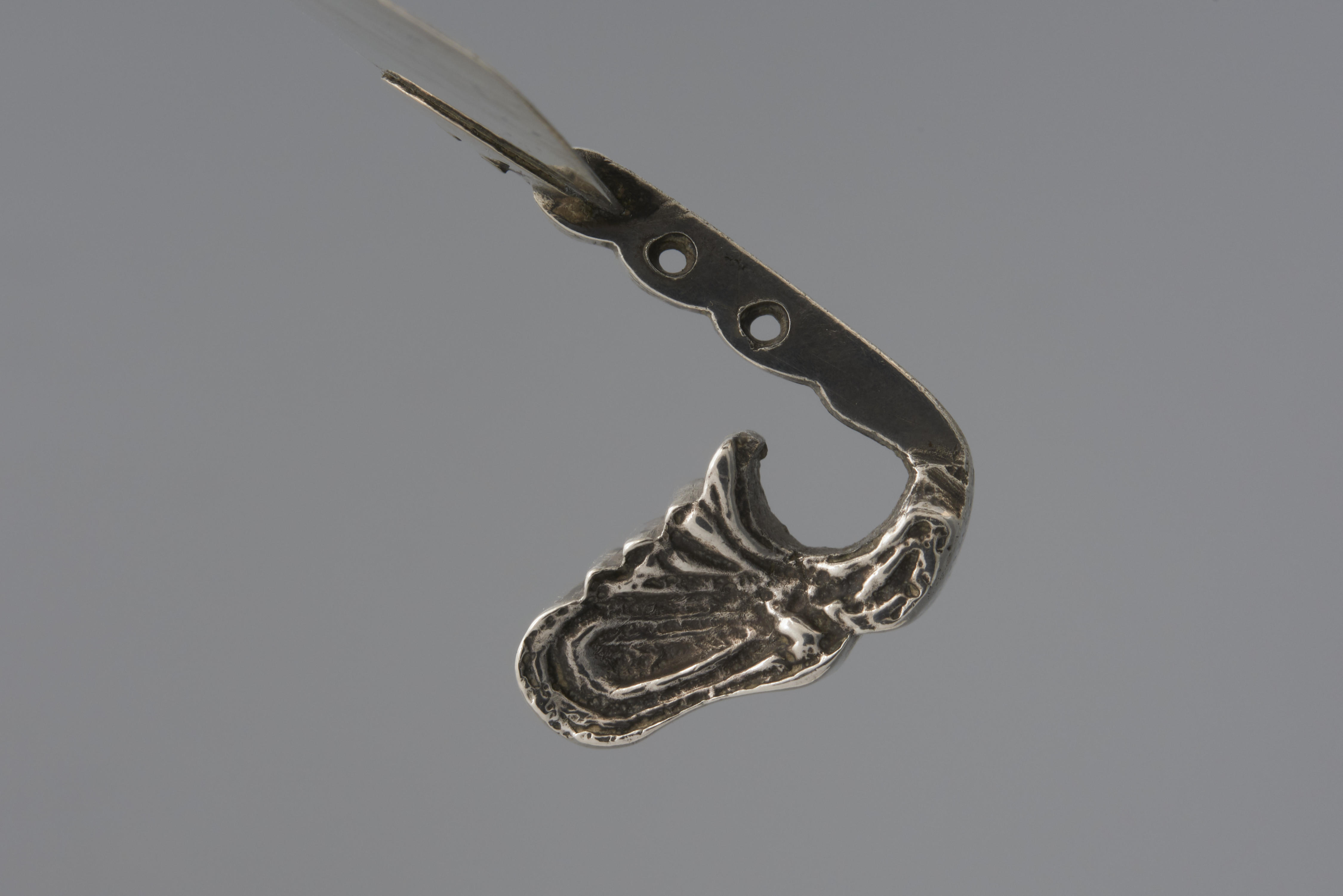 Zilveren oorijzer, gedragen door een vrouw of meisje in streekdracht van het eiland Urk. Aan de uiteinden van de beugel zijn twee gegoten zilveren 'knoppen' bevestigd. In de aanzet van de knoppen zitten twee gaatjes, waardoor spelden gestoken kunnen worden om de muts aan het oorijzer vast te steken. De uiteinden van het Urker oorijzer ...