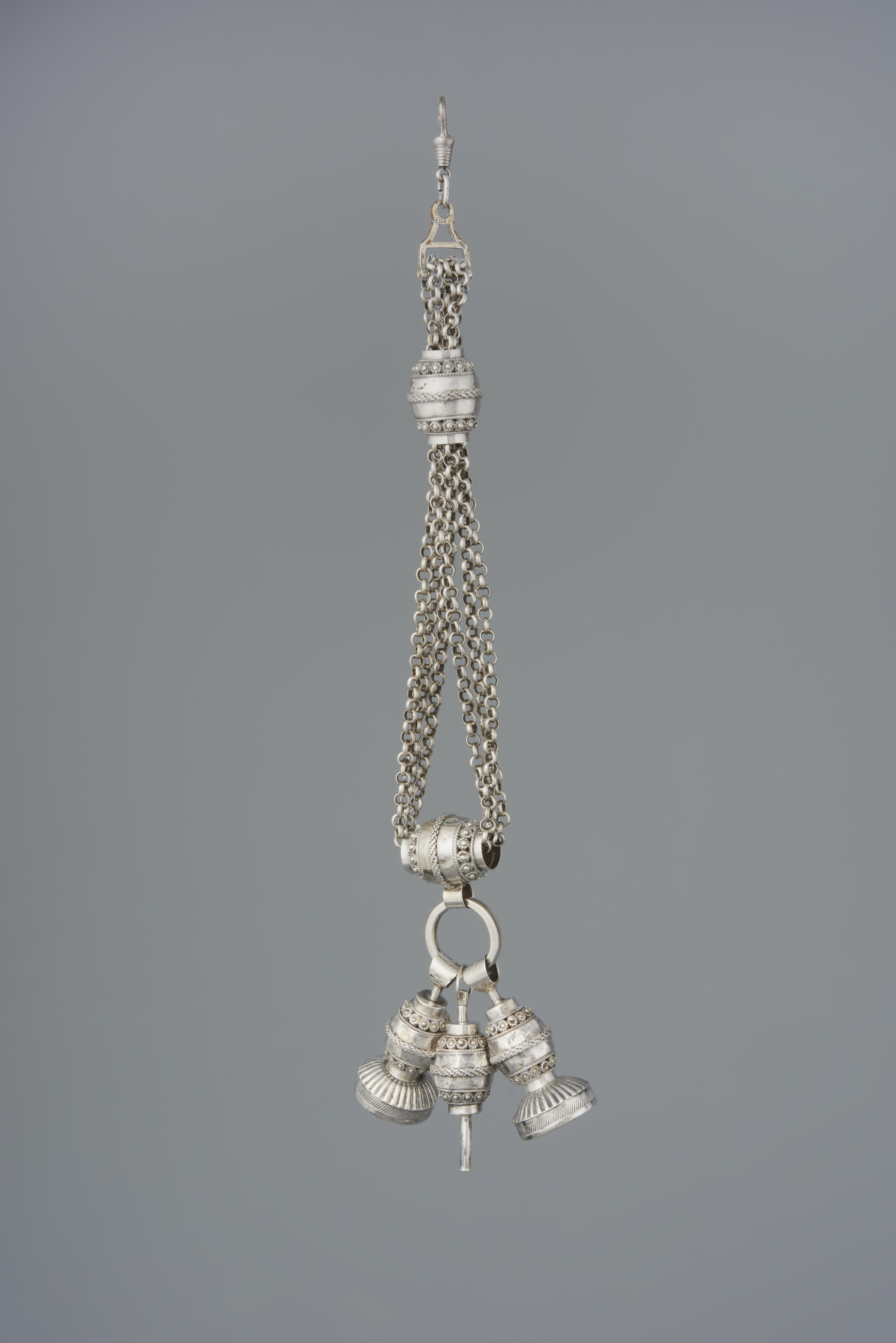 Zilveren horlogeketting. Dit type is algemeen in Nederland gedragen. Dit exemplaar is afkomstig uit Noord-Brabant. De ketting is tussen 1863-1897 vervaardigd door Th. Verroen in Schoonhoven. De signetten zijn tussen 1865-1886 gemaakt door W. Kooiman in Schoonhoven.