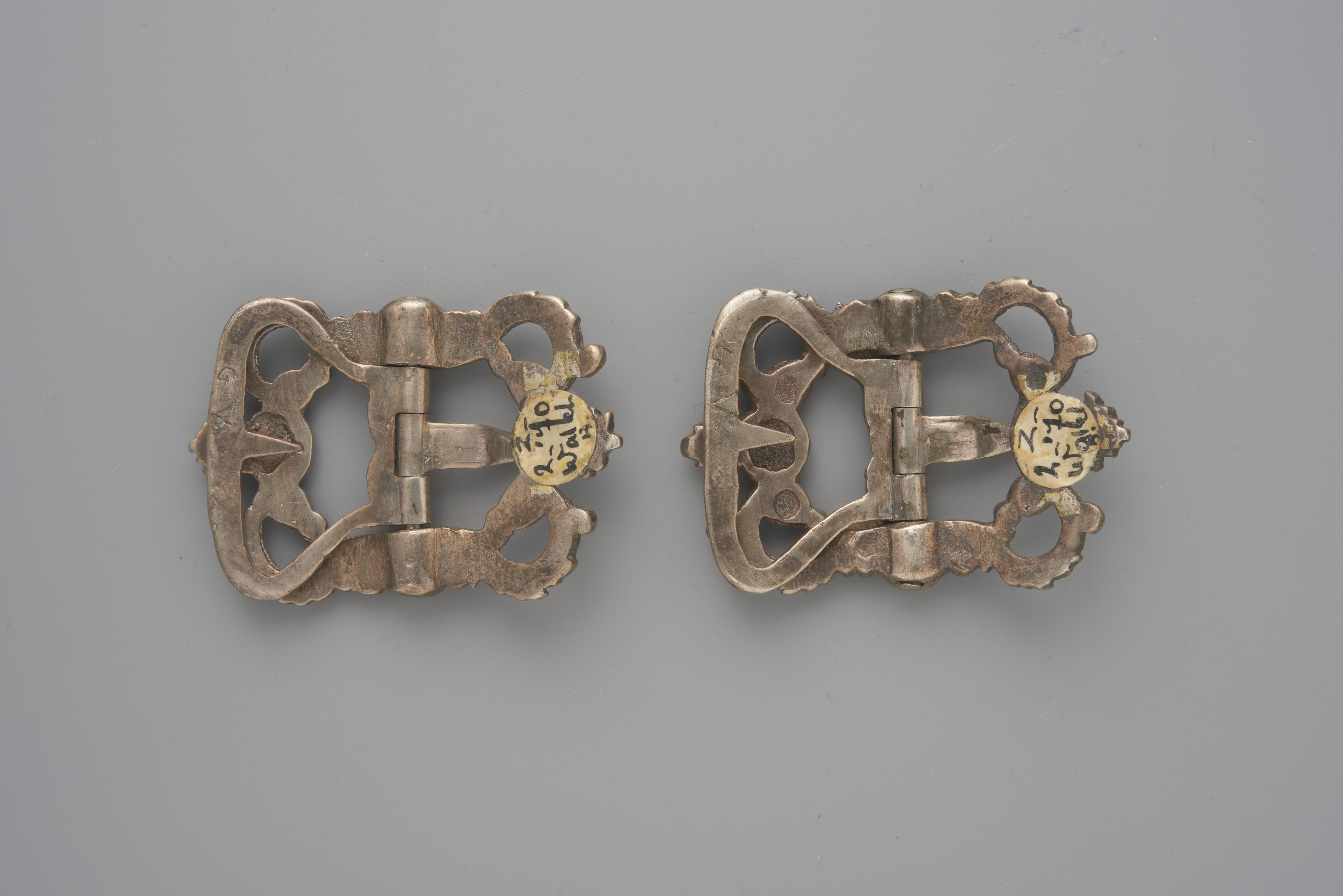 Paar schoengespen van ongewaarborgd zilver, afkomstig van Walcheren. De gespen hebben een achttiende-eeuws model. Mogelijk zijn ze nagegoten naar oudere voorbeelden. De merktekens zijn onduidelijk.