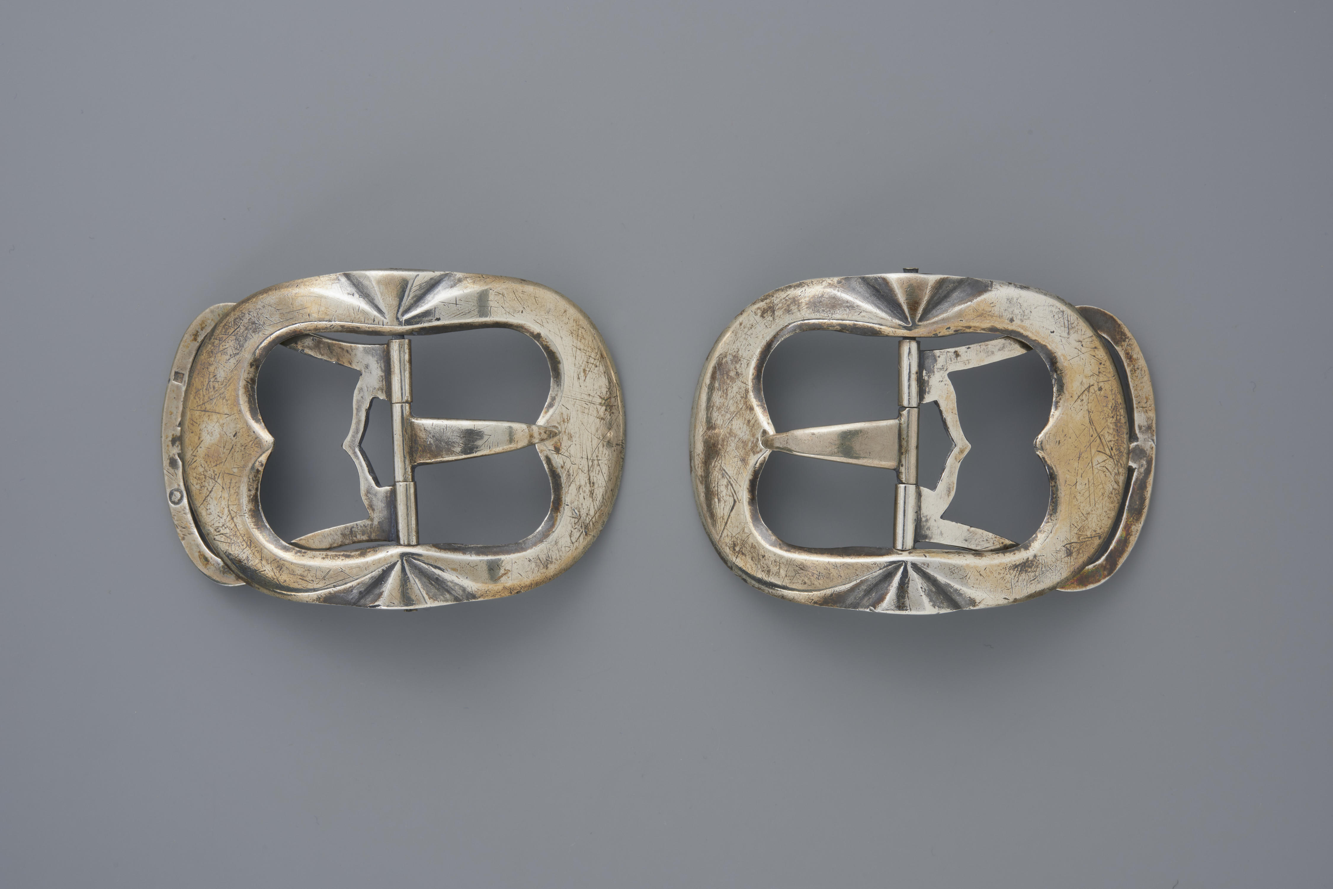 Een paar zilveren schoengespen. Dit type werd onder meer gedragen door mannen van het eiland Urk. De gespen zijn vervaardigd in 1860 door J. Held in Amsterdam en ook gekeurd in Amsterdam. Dit paar is in 1978 van een antiquair verworven en naderhand in het Nederlands Openluchtmuseum toegeschreven aan Urk.