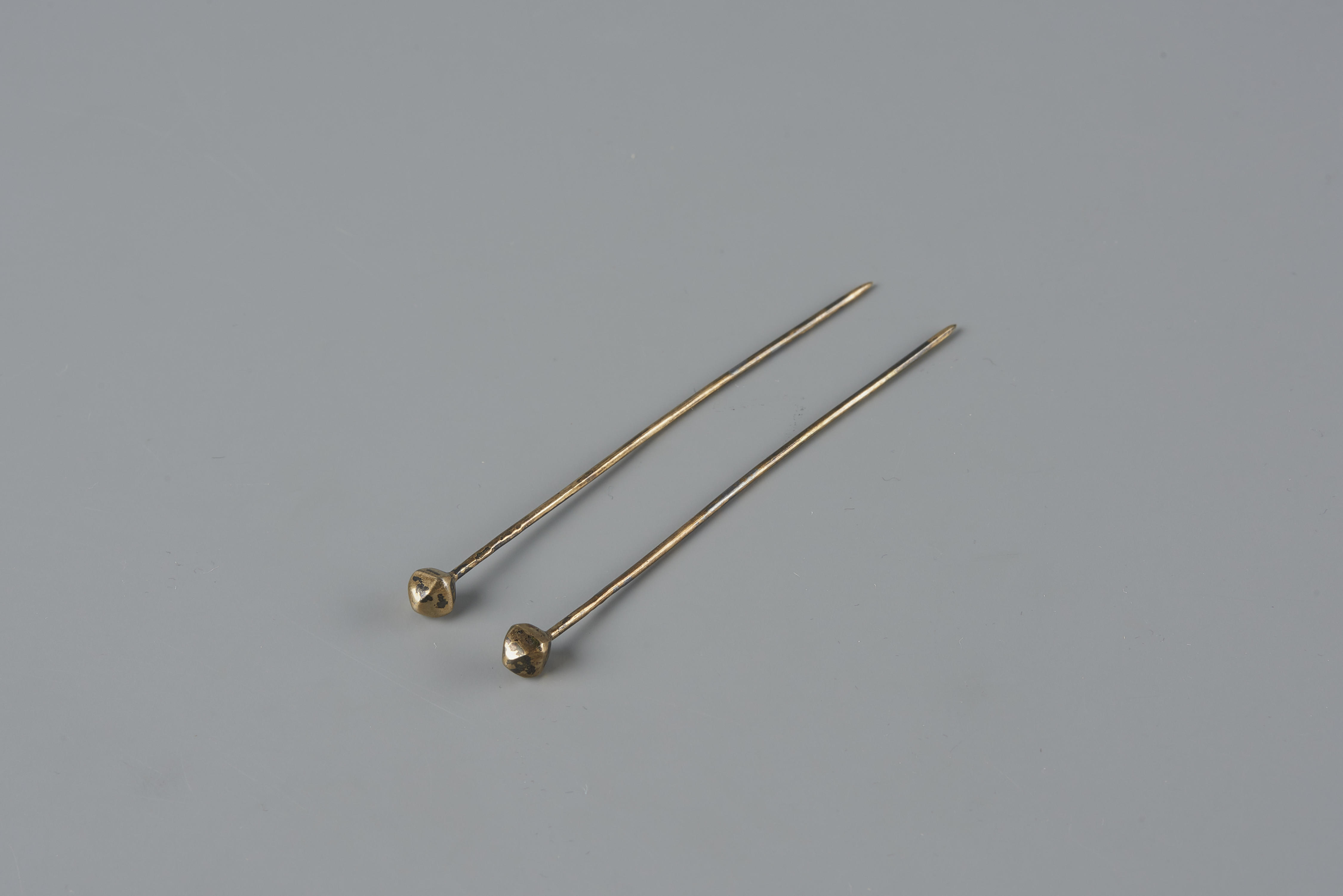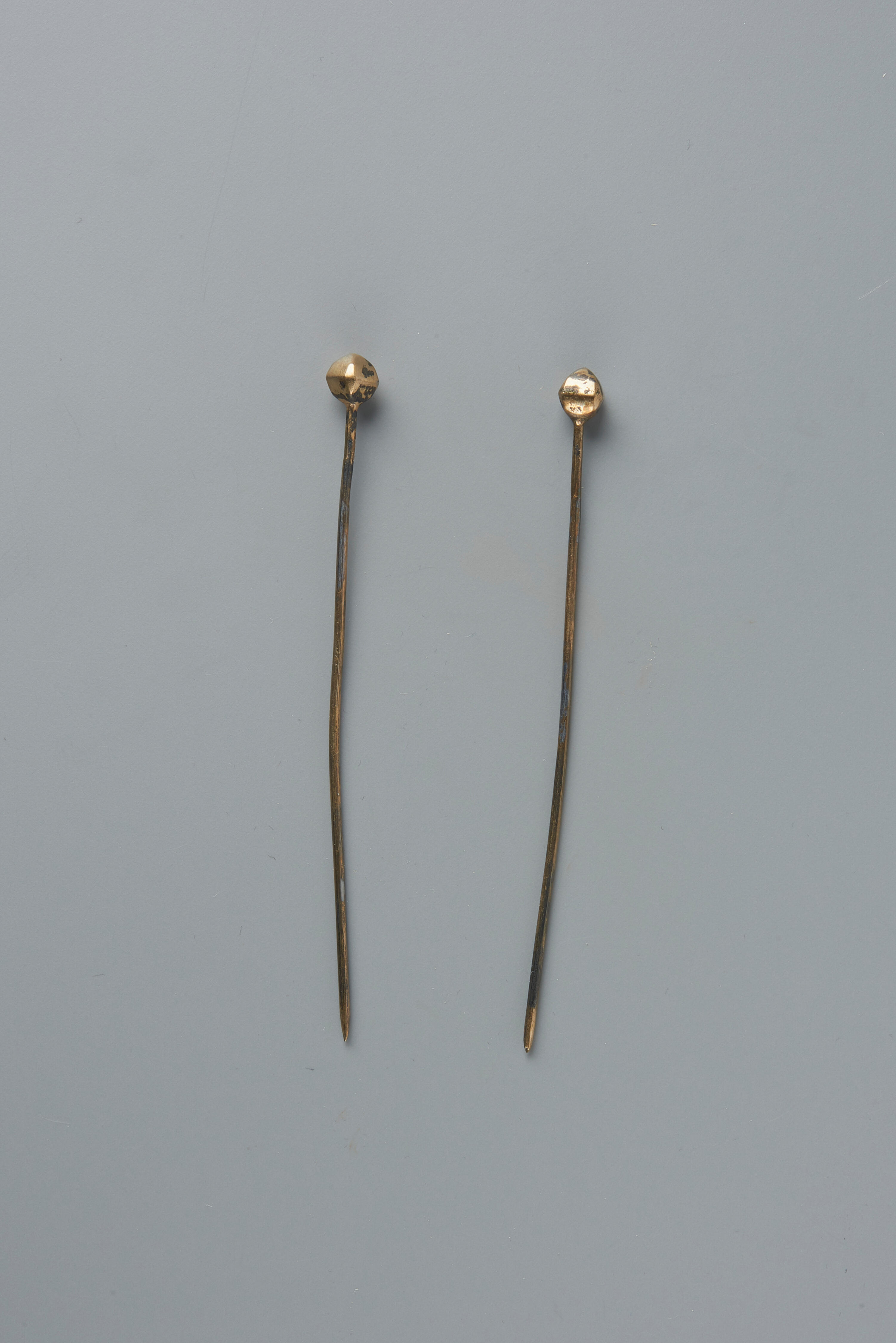 Een paar vergulde zilveren kapspelden, gedragen door een meisje in streekdracht van het eiland Urk. Kapspelden worden op Urk hullespelden genoemd. Ze worden gebruikt om de hul (muts) aan het oorijzer vast te spelden. De gefacetteerde bolletjes worden in een mal gemaakt. Beide helften worden apart geperst en daarna aan elkaar gesoldeerd. In de spelden ...