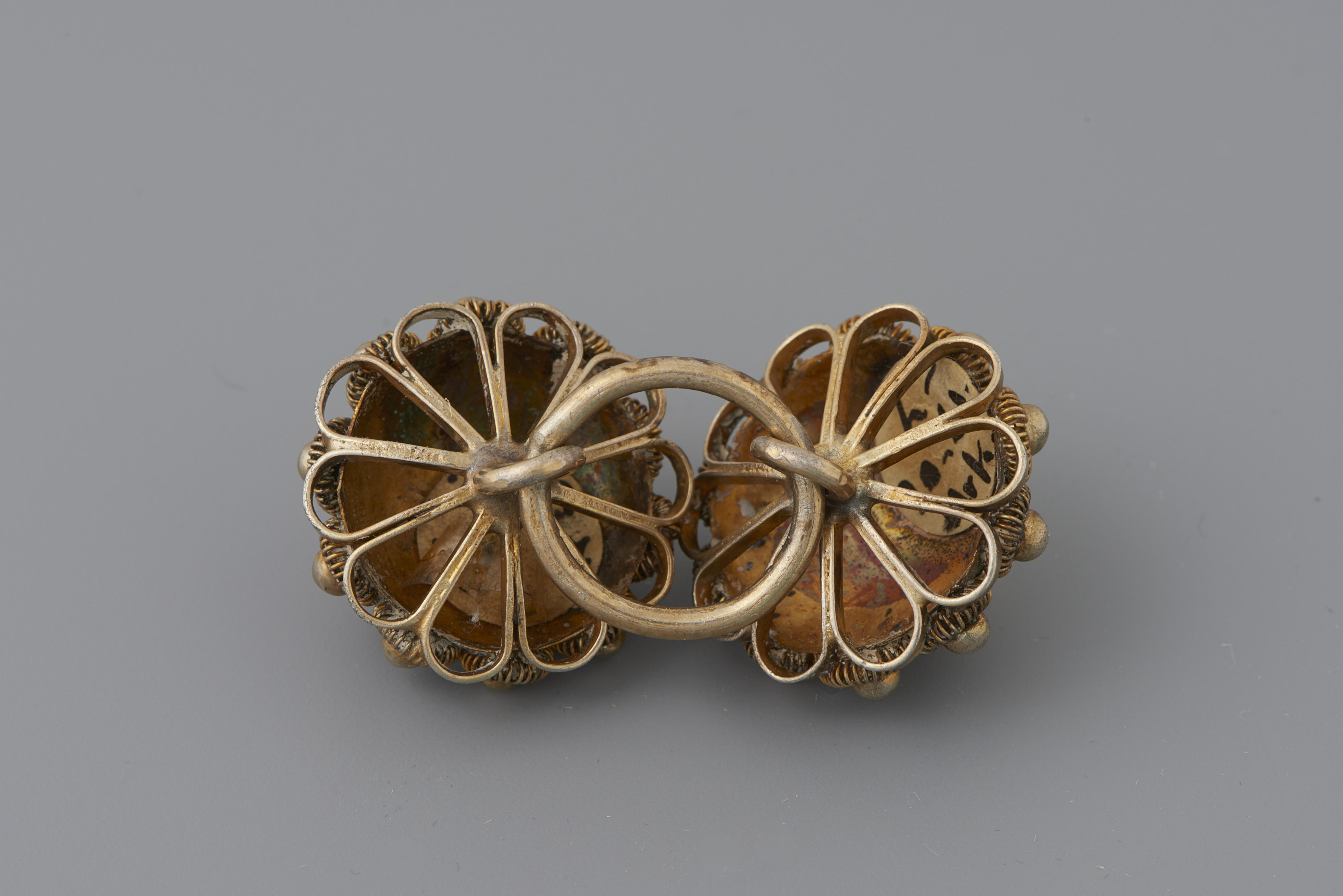 Paar vergulde zilveren keelknopen. De keelknopen zijn door het museum aangeschaft in 1961 ter completering van een set kleding voor een jongen van circa 8 jaar oud in streekdracht van Urk. Keelknopen werden gebruikt om de halsboord van het hemd of het overhemd te sluiten. Het meesterteken is niet geïdentificeerd. De knopen hebben een gehaltemerk ...