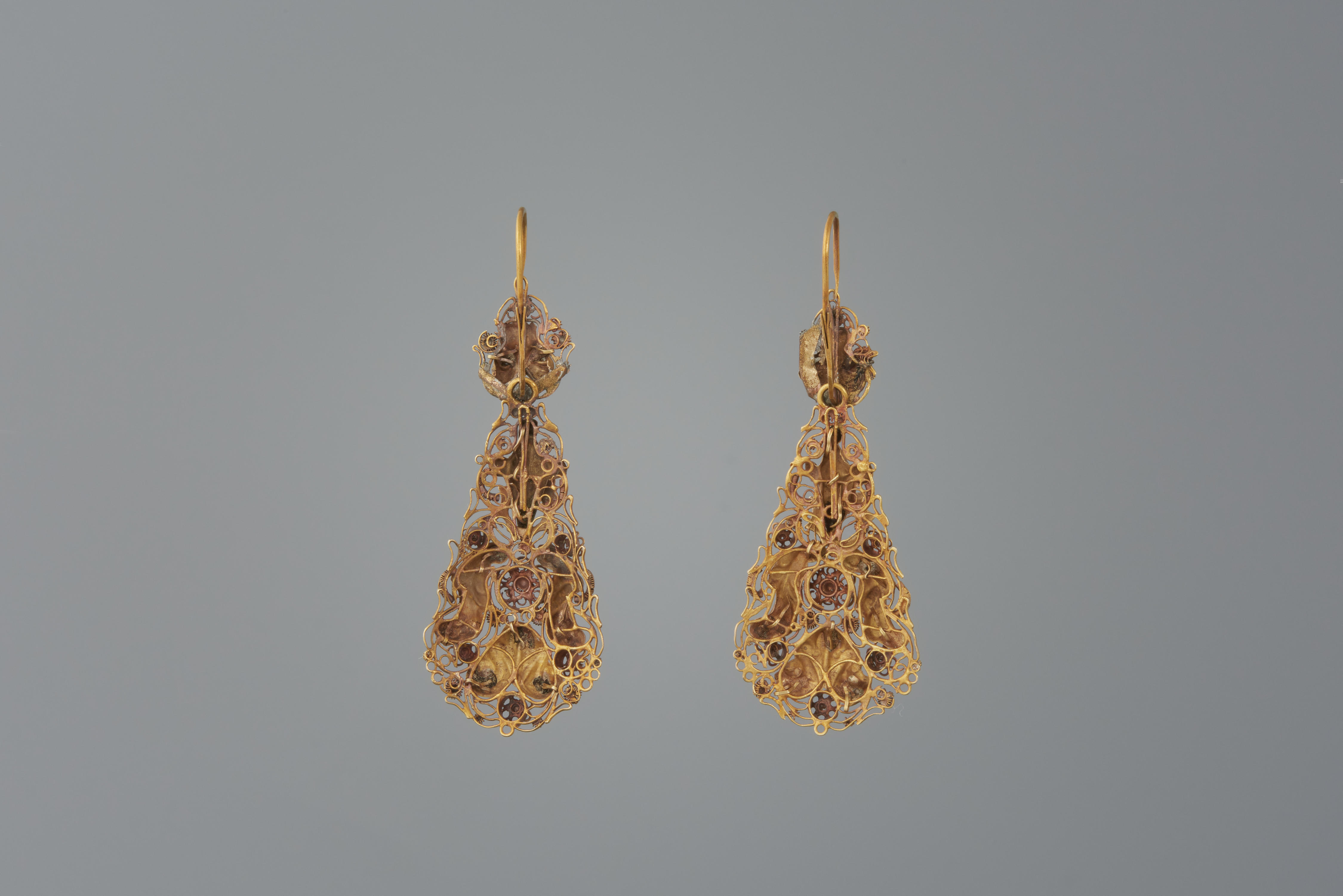 Paar 14-karaats gouden mutsenbellen, gemaakt rond 1865. Dit paar is gedragen in Overijssel. Dit type kwam echter op diverse plaatsen in Nederland voor en is niet specifiek voor Overijssel. De vervaardiger is onbekend.
