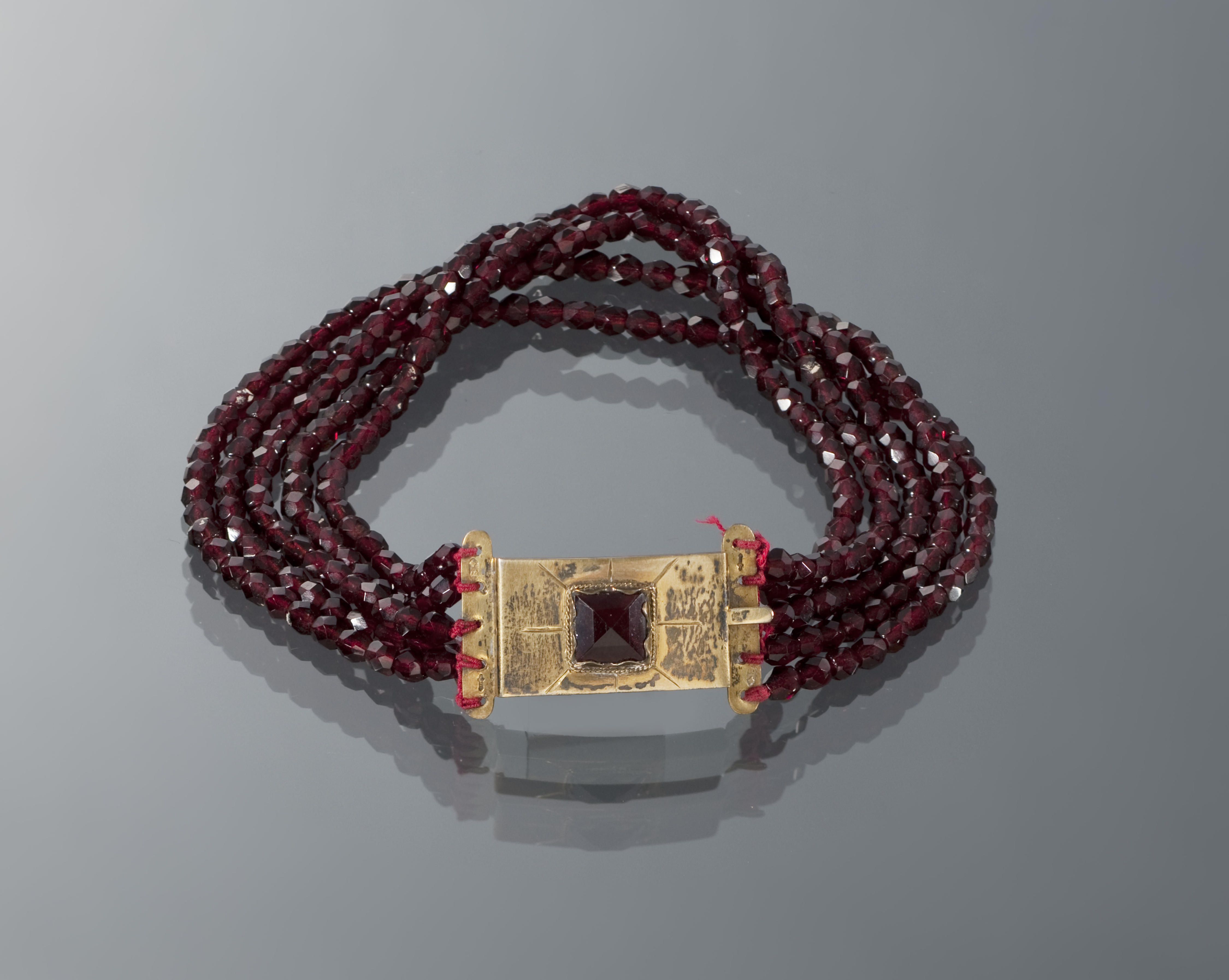 Halssnoer, bestaande uit vijf strengen donkerrode glazen kralen aan een verguld zilveren slot. Het halssnoer is gedragen door een meisje van het eiland Urk. Op Urk wordt de sluiting van het halssnoer in de nek gedragen. In het slot staat vermoedelijk het meesterteken van J.C. van den Berg, werkzaam in Kampen vanaf 1924. Het slot ...