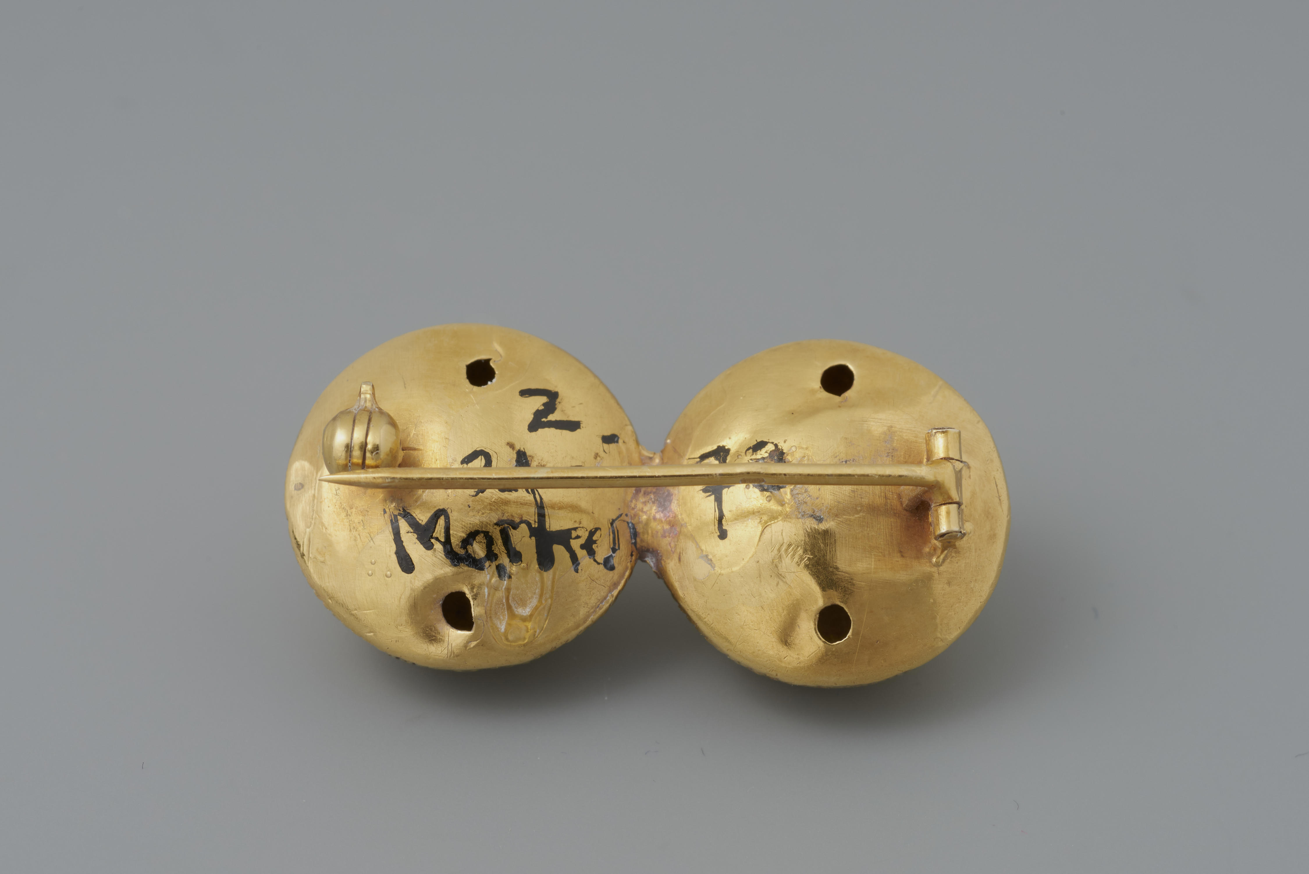 Paar gouden keelknopen van omstreeks 1850 die tussen 1955 en 1973 vermaakt zijn tot een broche. De knopen zijn op een moderne 14-karaats gouden speld gezet. De speld heeft een gehaltemerk dat gebruikt is vanaf 1955.