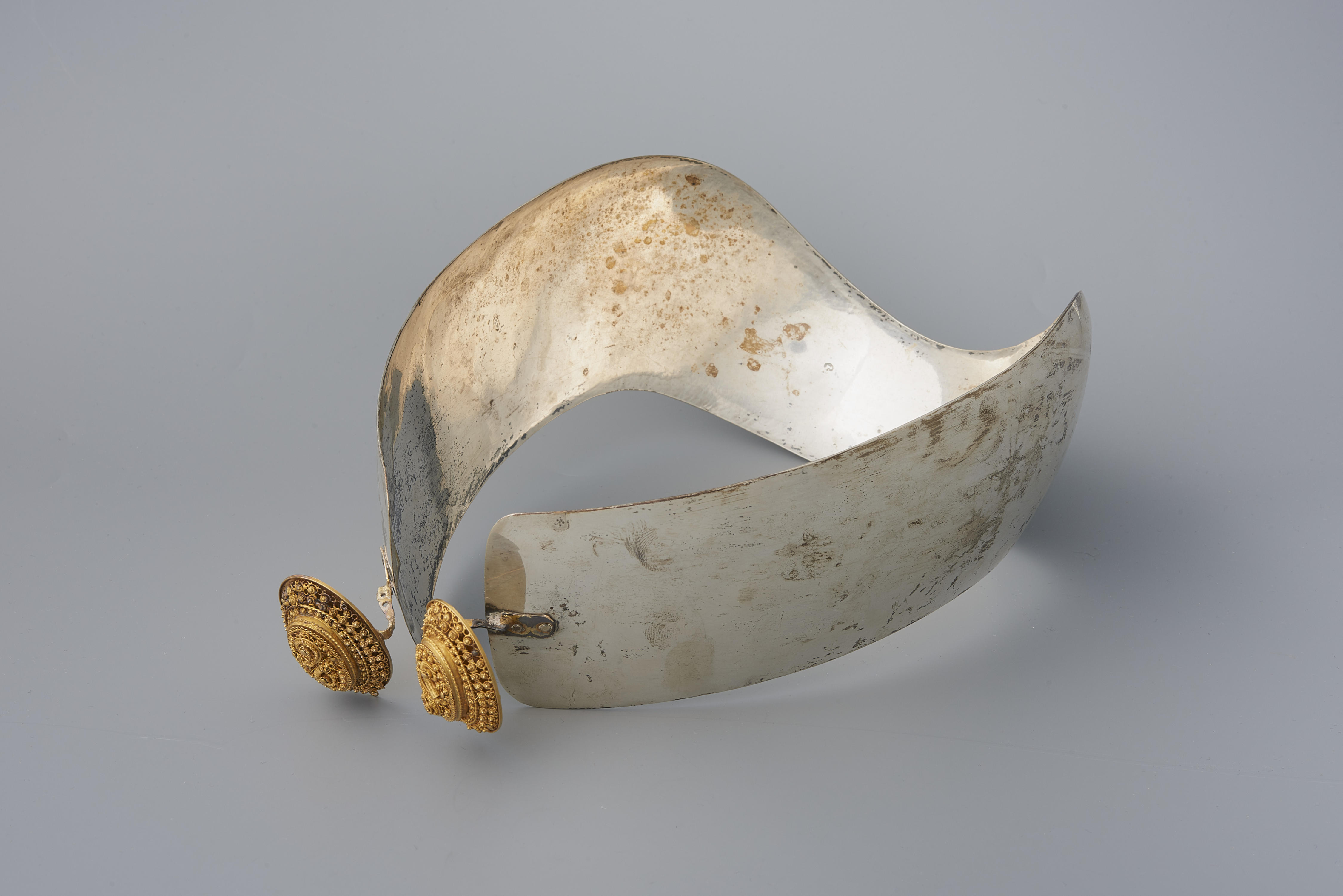 Zilveren oorijzer met 18-karaats gouden 'boeken', gedragen door een vrouw in streekdracht uit Scheveningen. Naast de oorijzers met ovale 'boeken' werden in Scheveningen ook oorijzers met 'stukken' gedragen. In de aanzetten van de boeken zitten twee gaatjes waardoor spelden gestoken kunnen worden om de muts aan het oorijzer vast te steken. De zilveren beugel van ...