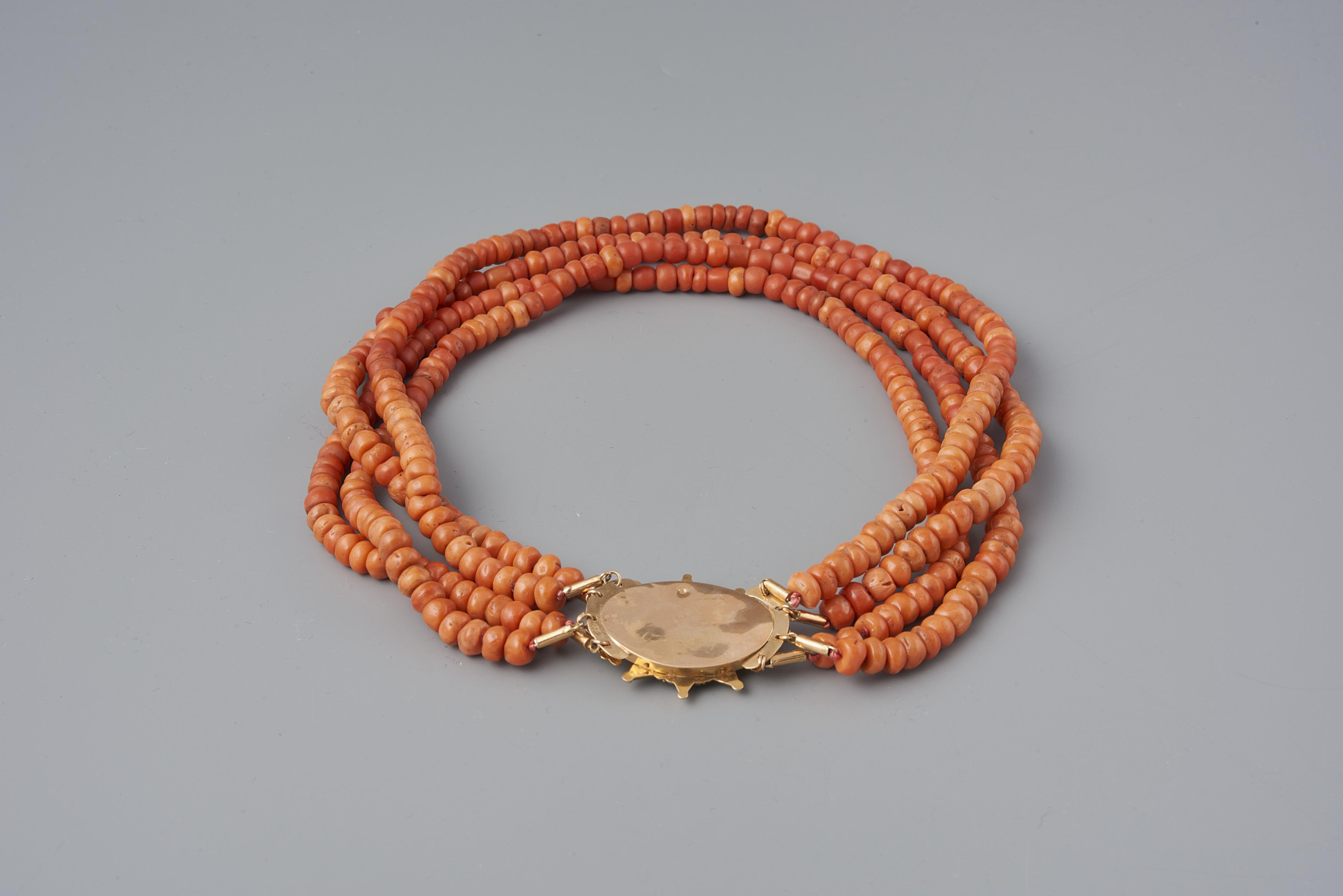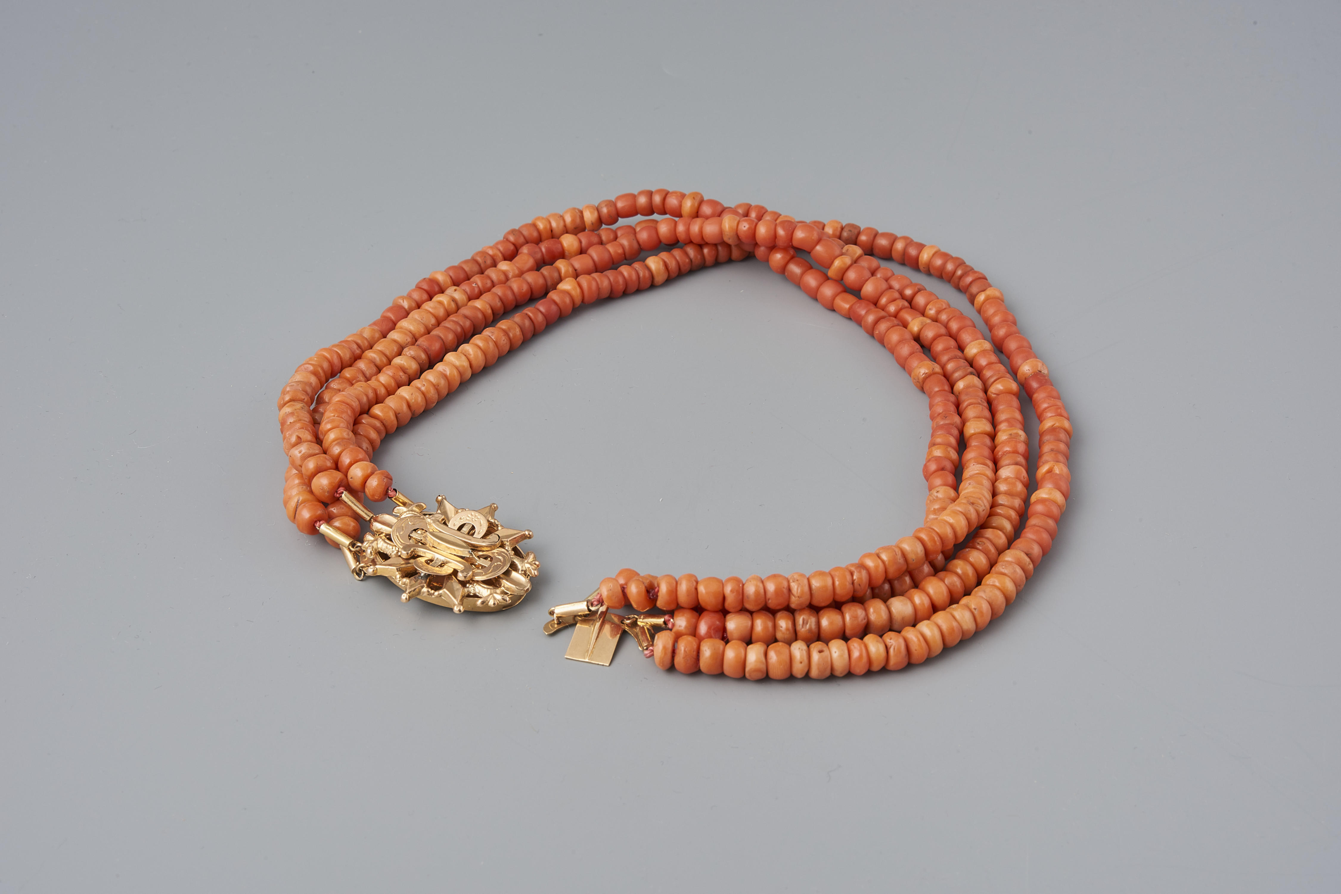 Een halssnoer, bestaande uit een driedelig gouden slot en vier strengen kralen van bloedkoraal. Het slot is zonder kralen in 1960 aangekocht van een Amsterdamse antiquair. De kralen zijn in of na 1976 in het museum aan het slot gezet. Het slot is toegeschreven aan Zandvoort. De vervaardiger is Abraham Blok uit Amsterdam, werkzaam van ...