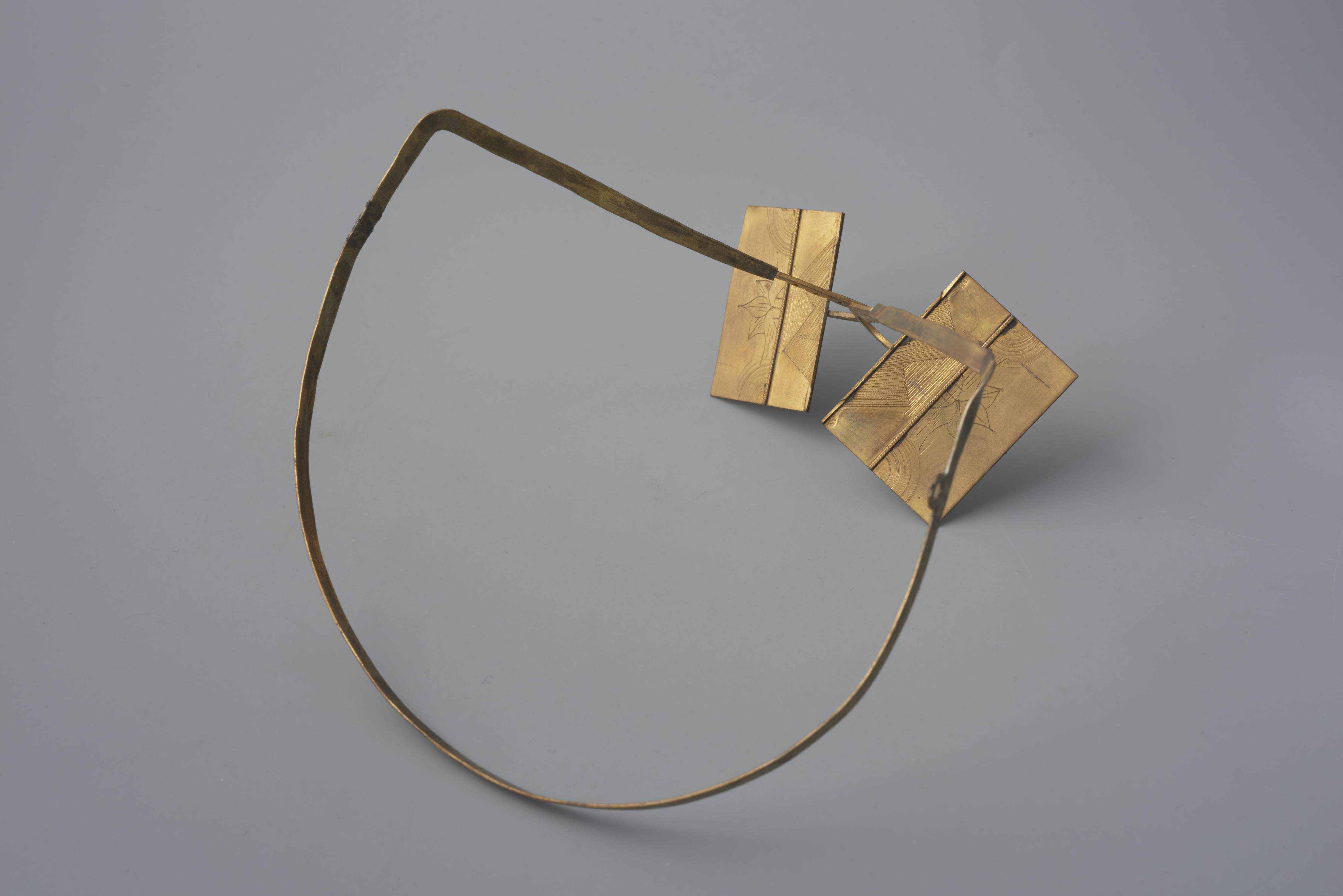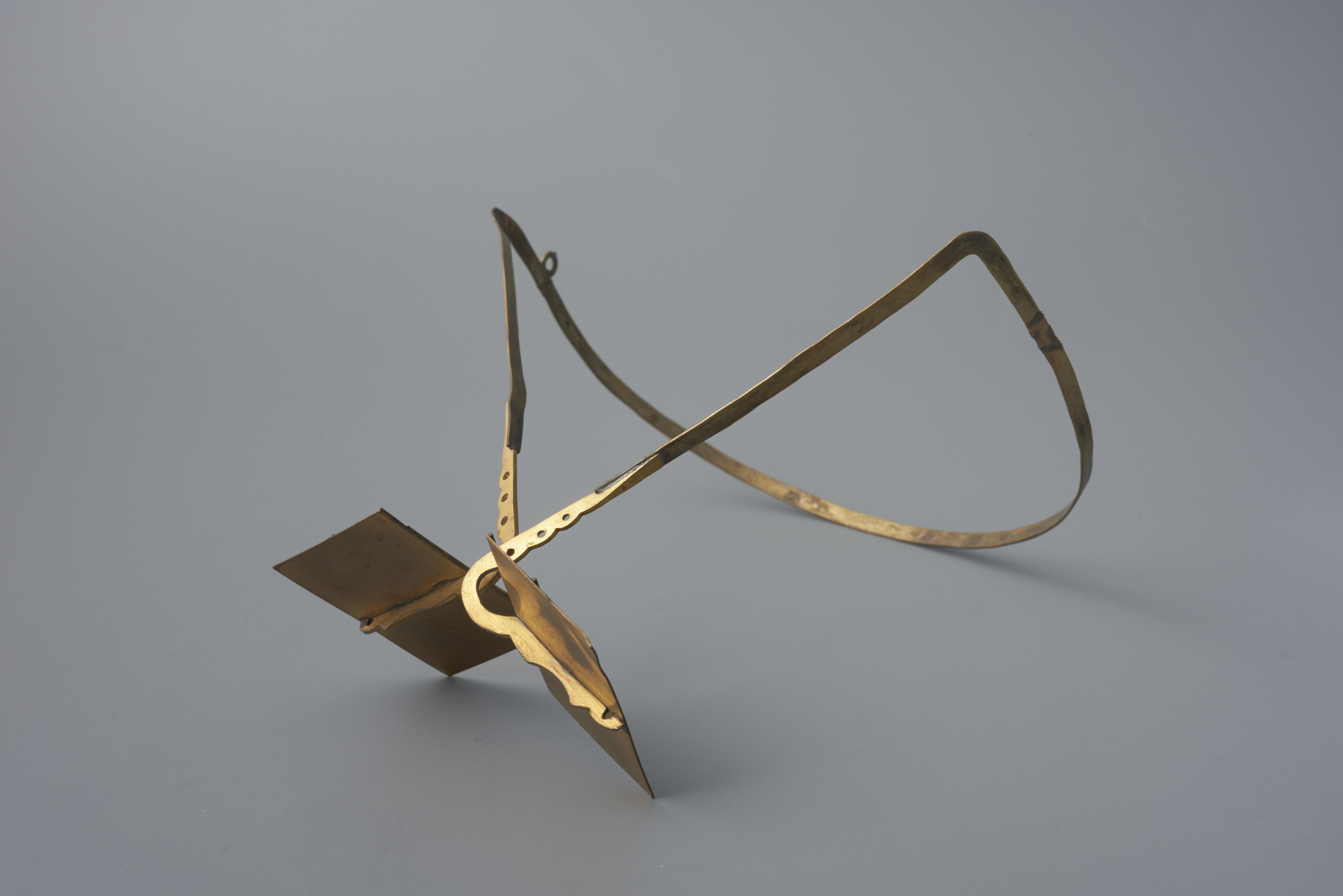 Oorijzer, gedragen door een vrouw in Zuid-Bevelandse streekdracht. Het oorijzer bestaat uit een messing beugel en twee vergulde messing ‘stikken’ (rechthoekige oorijzeruiteinden). De stikken zijn aan de achterzijde versierd met graveerwerk. Op de stikken staat het merk JT. Het merk JT schijnt in gebruik geweest te zijn bij een koperslager die aan het eind van ...