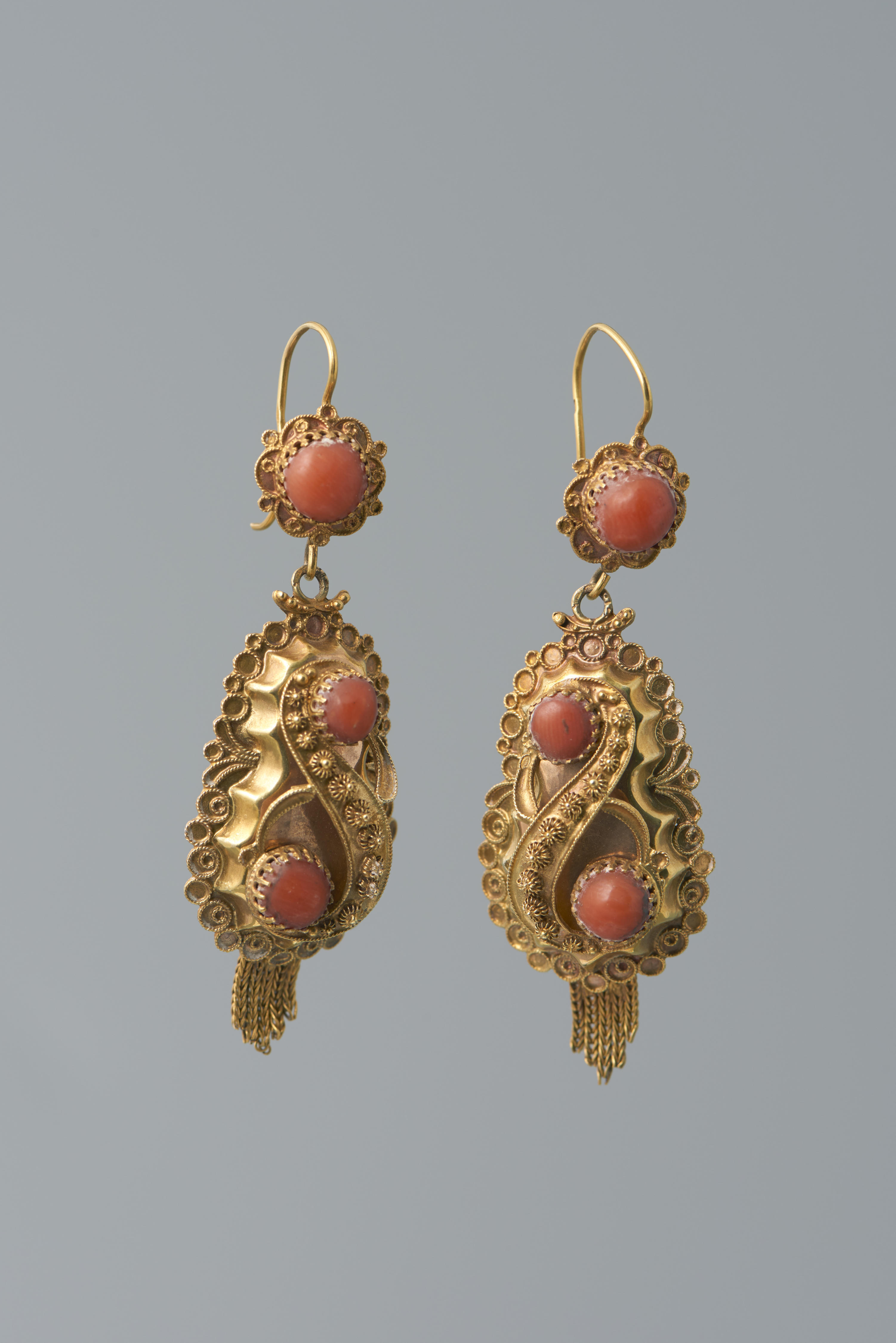 Paar 14-karaats gouden mutsenbellen, gemaakt omstreeks 1915-1925 en gedragen door een vrouw uit Kampen of van het Kampereiland. De mutsenbellen werden in de voorstrook van de kornetmuts gehaakt. De vervaardiger is onbekend.