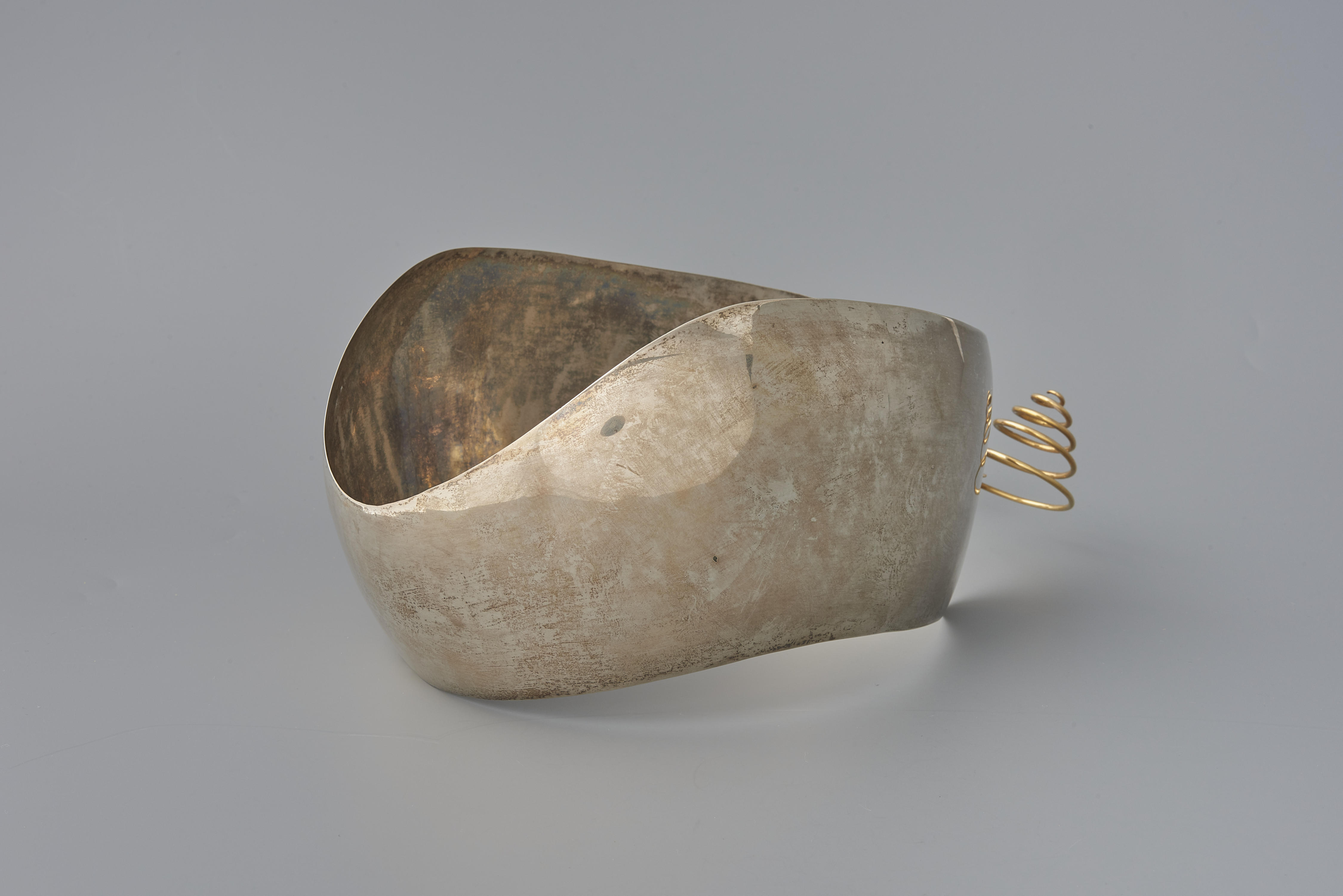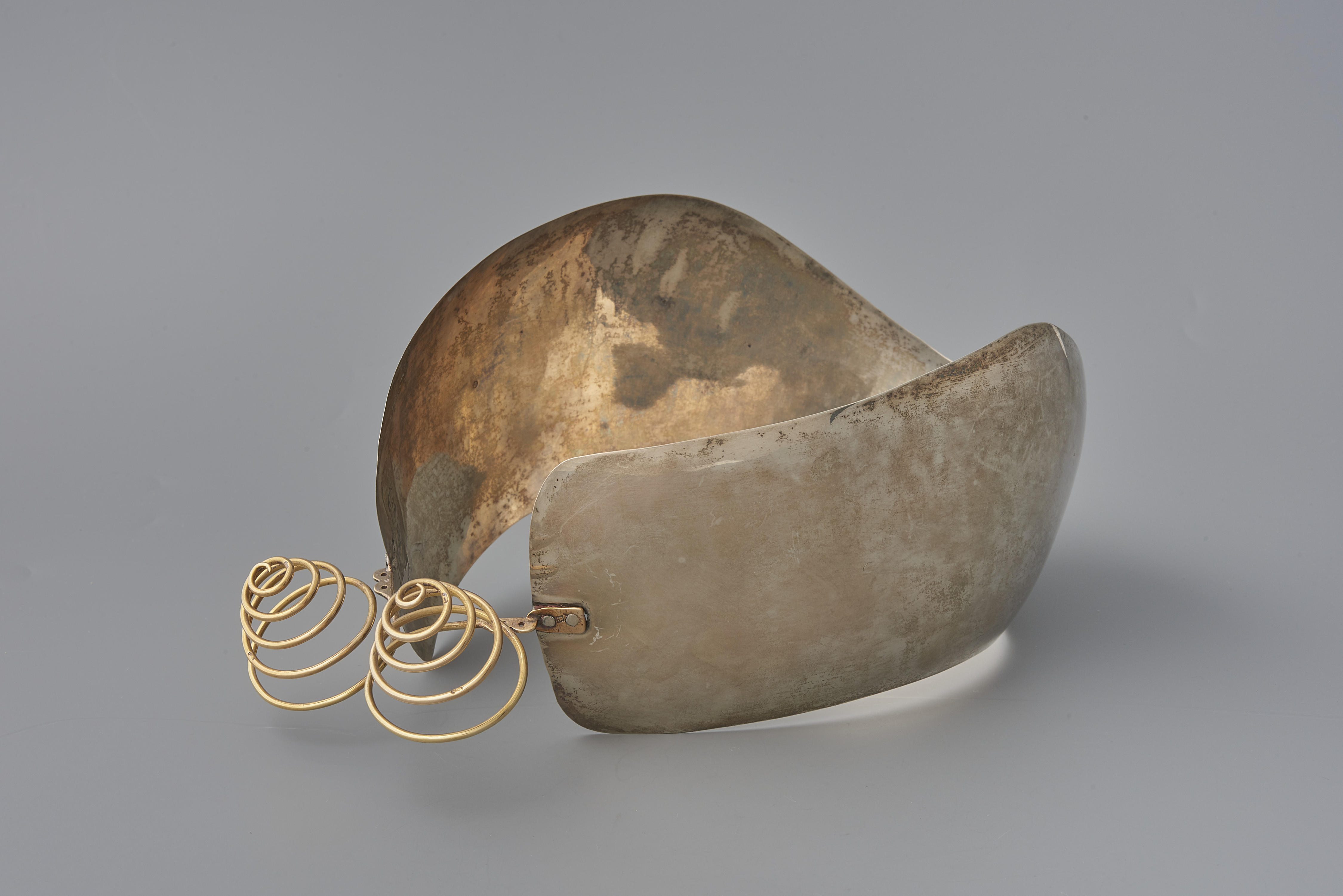 Een oorijzer, bestaande uit een zilveren beugel waaraan gouden krullen met vijf windingen. Het oorijzer is gedragen door een vrouw in streekdracht uit Vlaardingen. De beugel is in 1896 vervaardigd door J.H. Maartense in Leiden. In de krullen staan de jaarletter van 1850 en een onbekend meesterteken. Er zijn dus oudere krullen aan een jongere ...