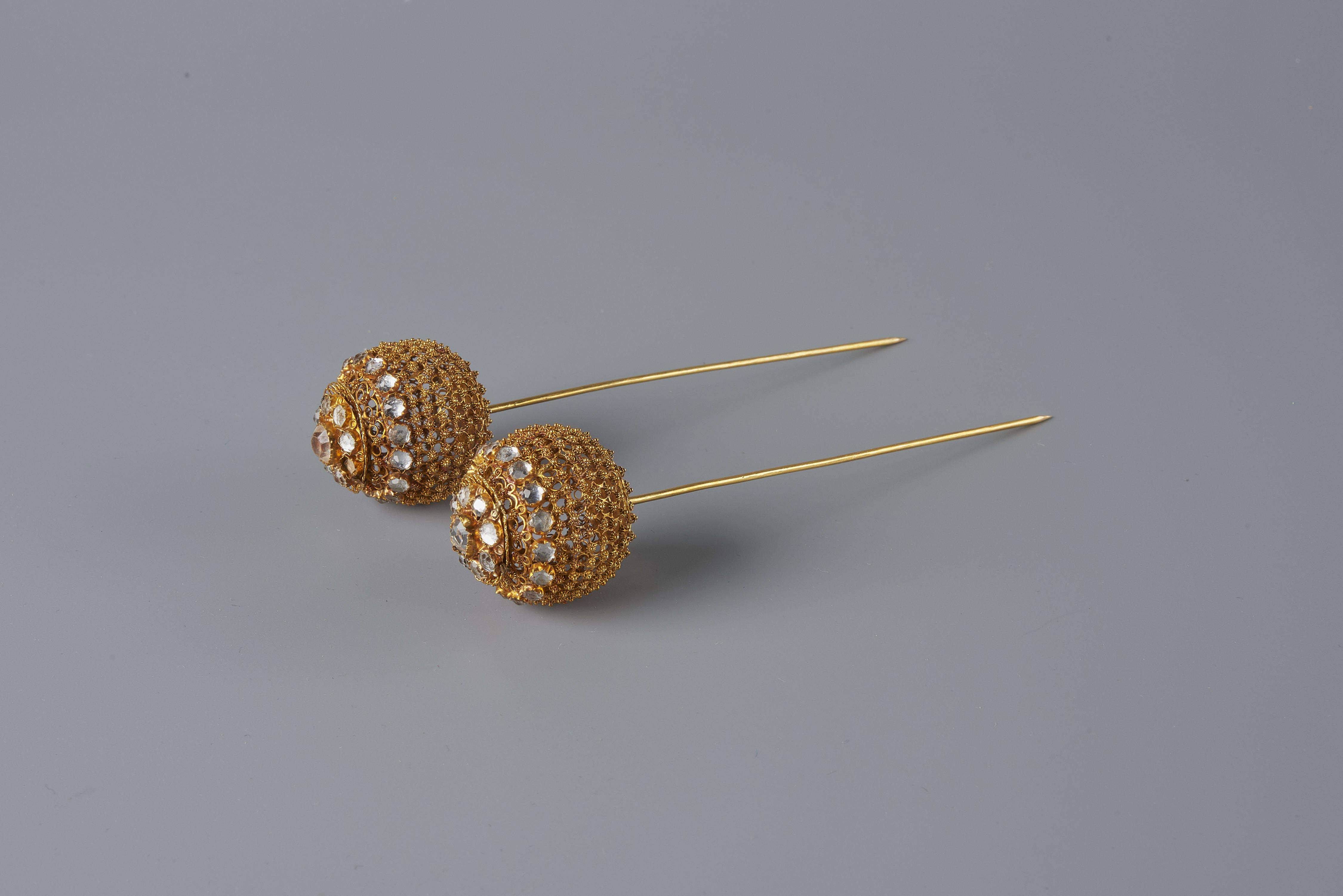 Paar gouden mutsspelden, zogenoemde kroonspelden, van cantillewerk en ingelegd met stukjes glas op zilverfolie. Dergelijke mutsspelden werden voornamelijk gedragen door rooms-katholieke vrouwen op Zuid-Beveland. De spelden werden in de ondermuts gestoken, vlak achter de uiteinden van het oorijzer. Zo werd de ondermuts aan het oorijzer vastgespeld. Kroonspelden van cantillewerk kwamen vanaf circa 1895 op Zuid-Beveland ...